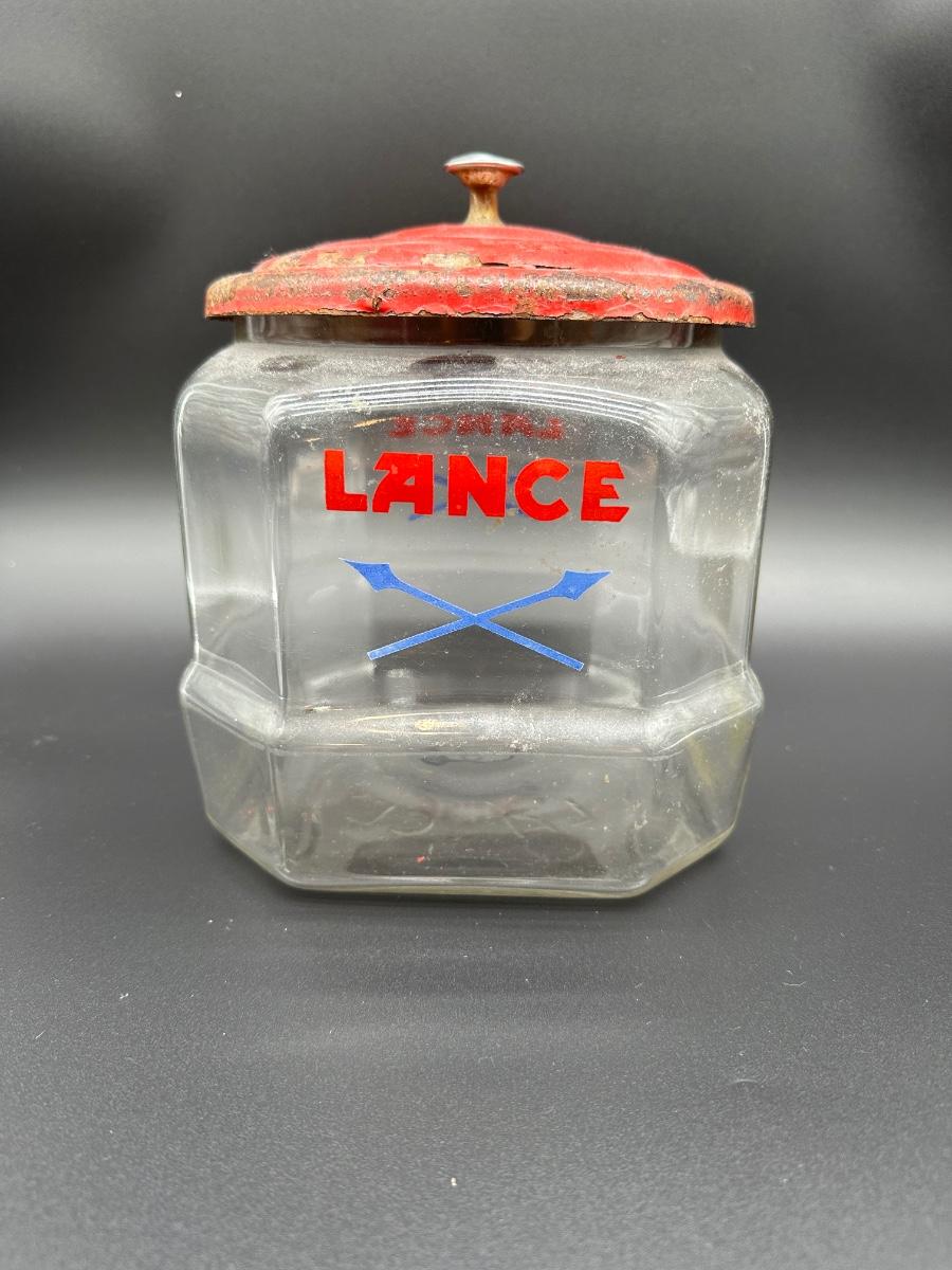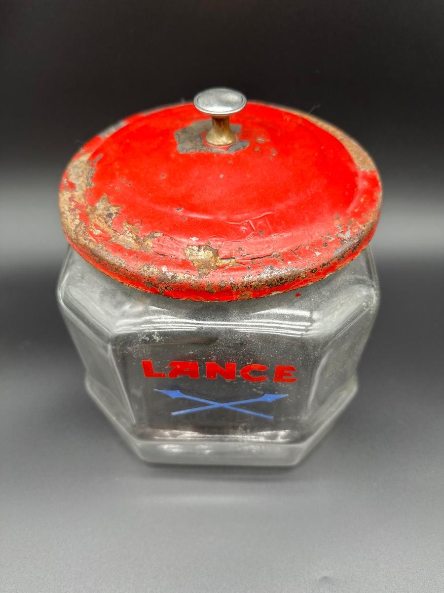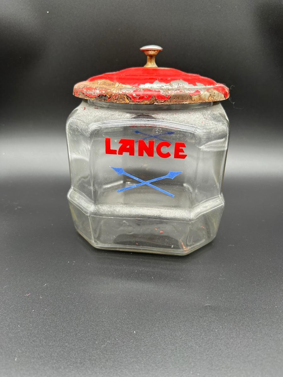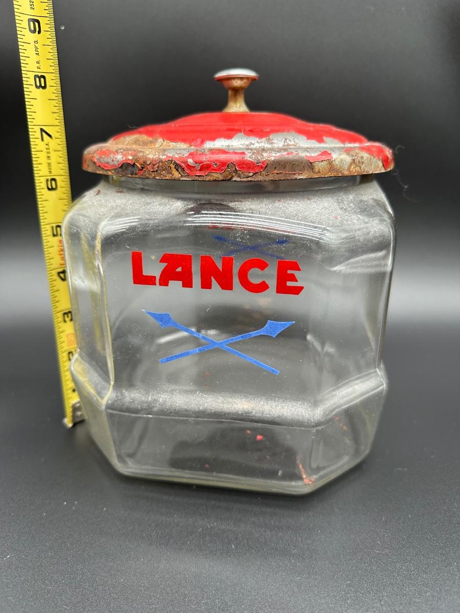 Vintage Lance cracker advertising jar featuring a clear, multi-paneled glass body with bold red LANCE lettering and crossed lance logo. Includes the original red painted metal lid with center knob. Classic general store / countertop display piece with great old advertising appeal.