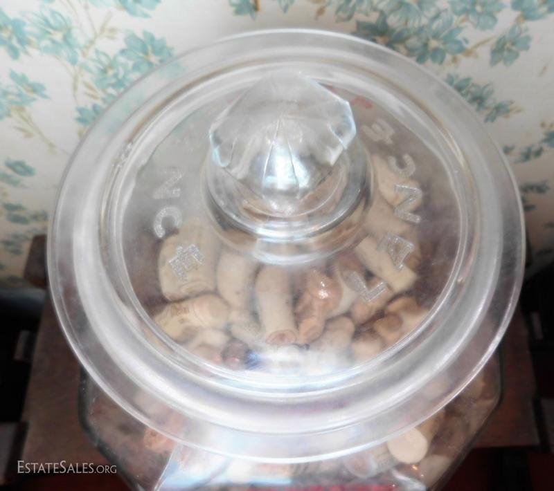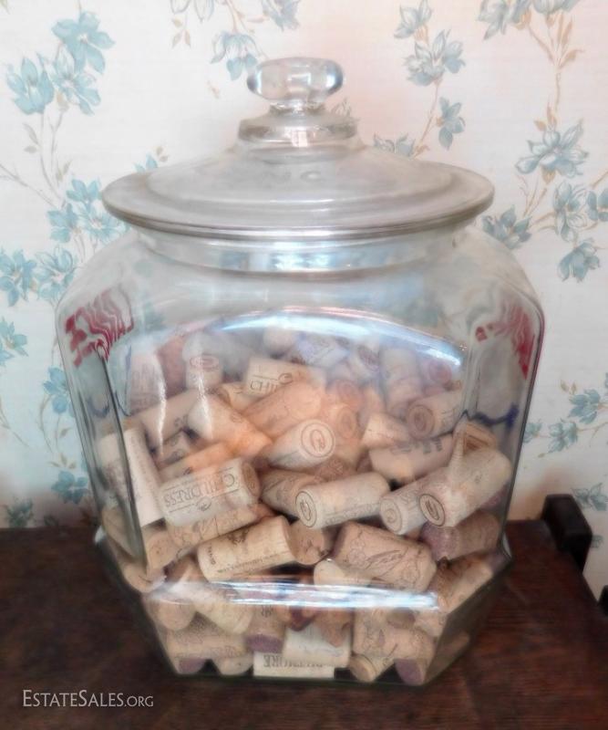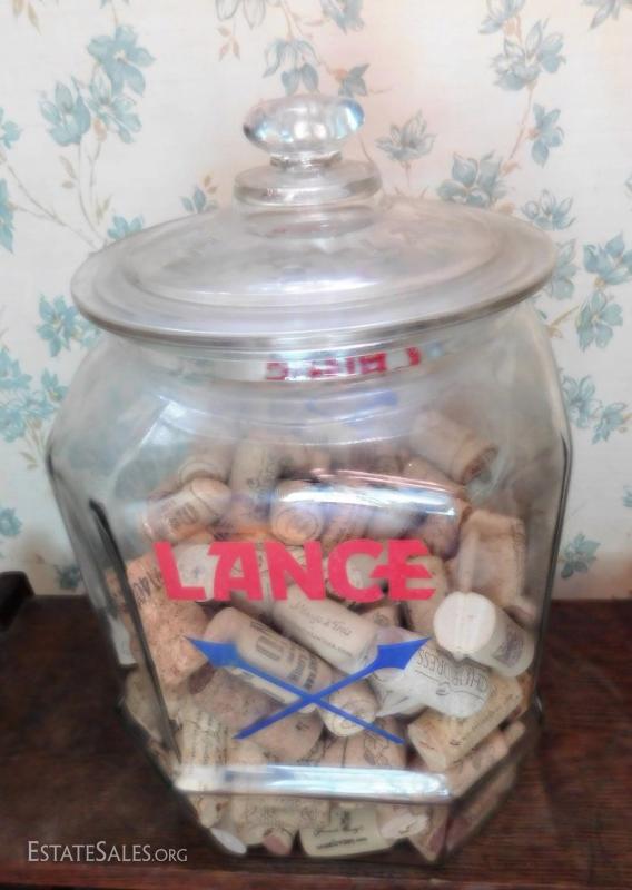 Vintage Lance Snack Jar with matching lid. Logo is printed both sides and embossed on lid. Glass is in good condition with no cracks or chips. Corks displayed for effect. Do not go with jar.