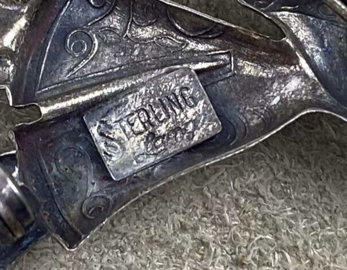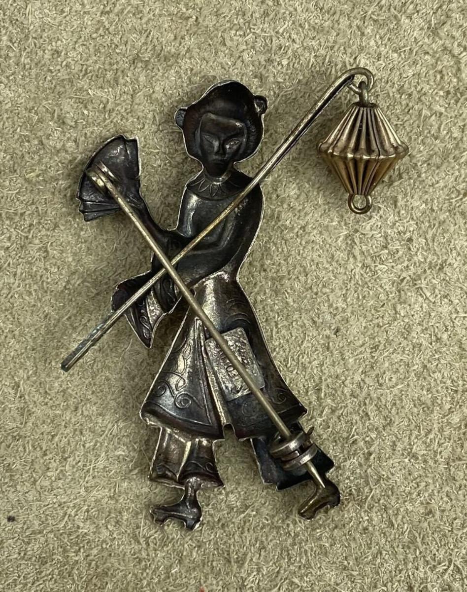 Known for their figural brooches here is a Sterling silver and vermeil Japanese Geisha in traditional garb from Lang Jewelry which began in Providence, Rhode Island in 1946 and crafted pieces until the 1970s I believe...The gold washed lantern is a dangler..50mm...5.9 grams...as shown...Clear hallmark on back with the signature S on the front of the brooch...
