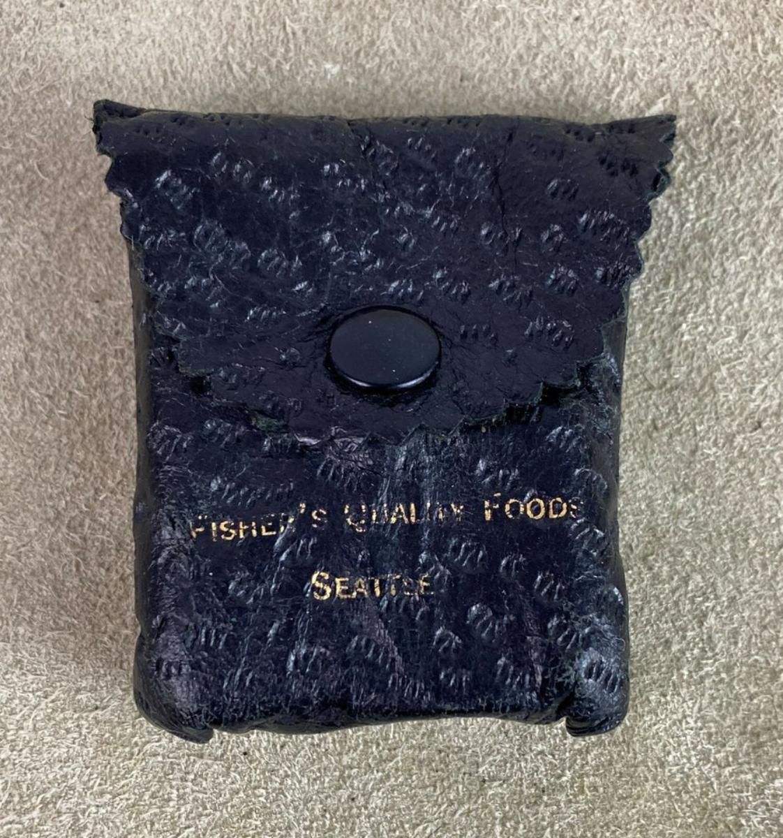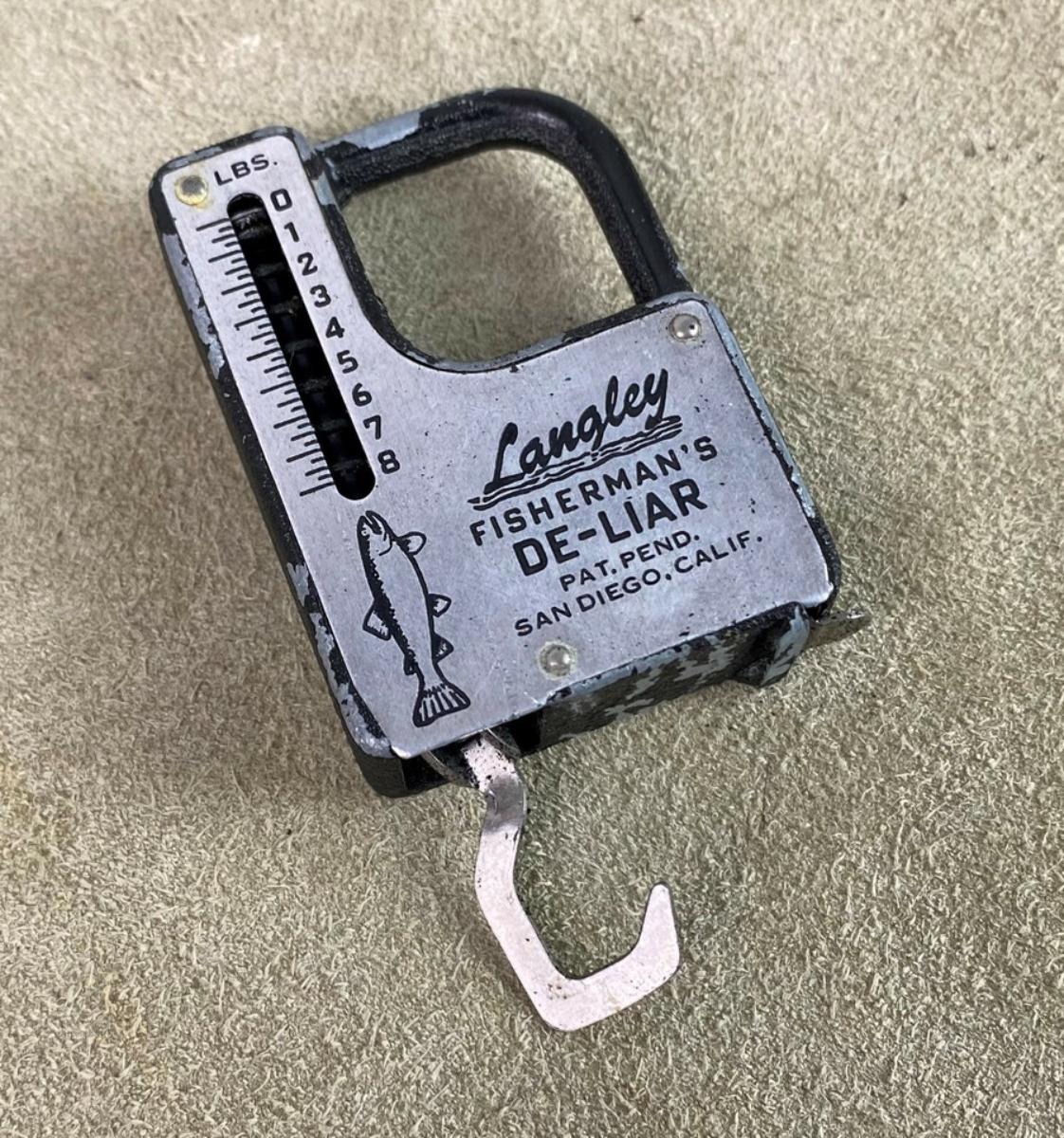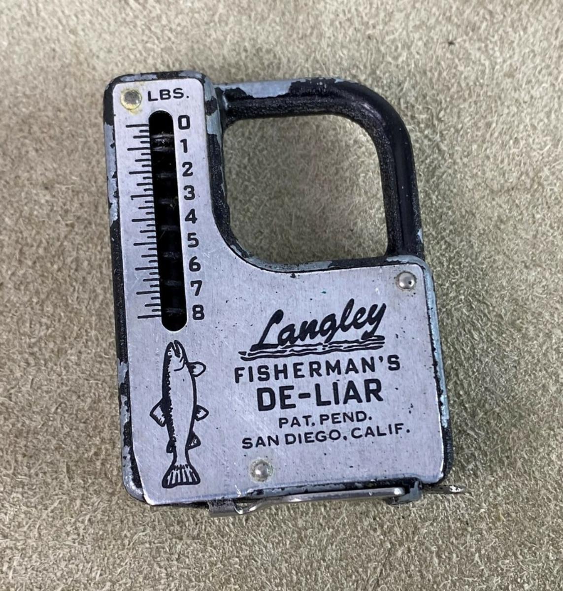 vintage pocket-sized device with scale and ruler...Langley Fisherman's DE-LIAR...working condition...some flaking on the baker enamel paint on back...2.25 x 1.75"...in a leather pocket..an advertising premium from FISHER'S QUALITY FOODS SEATTLE