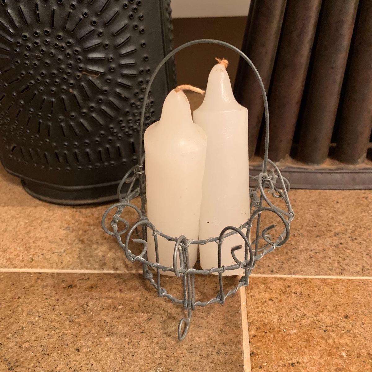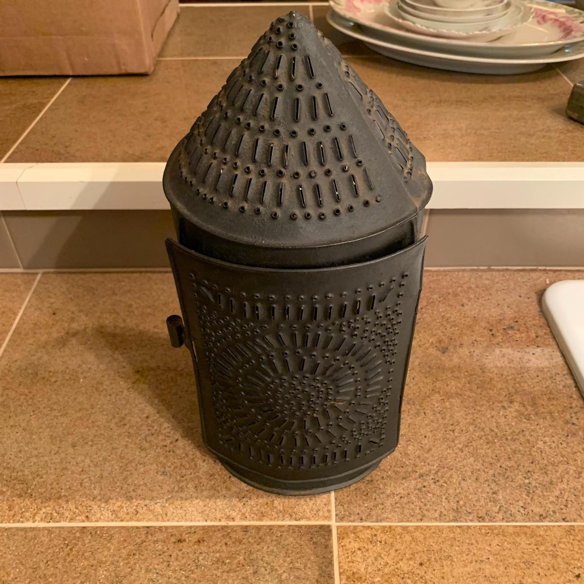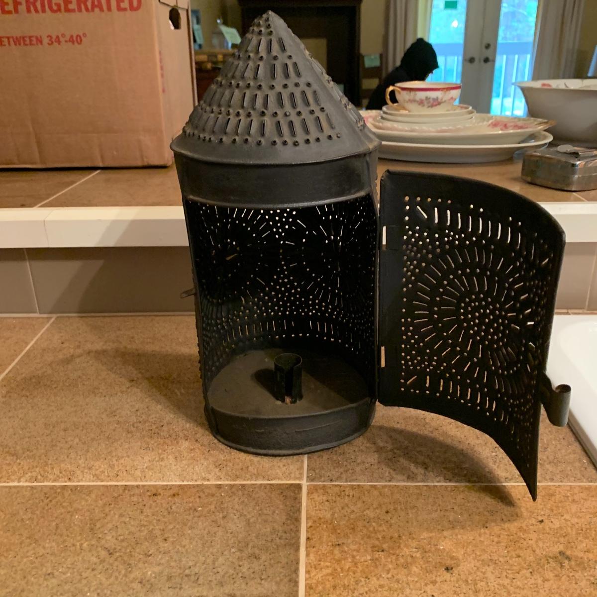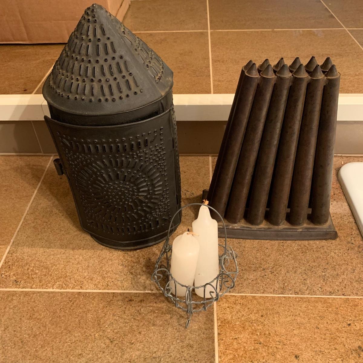 Lot includes a vintage candle lantern that features decorative holes and a easy operable door, a brass candle making mold, and a little wire basket holding two candles. The lantern stands 13” tall.