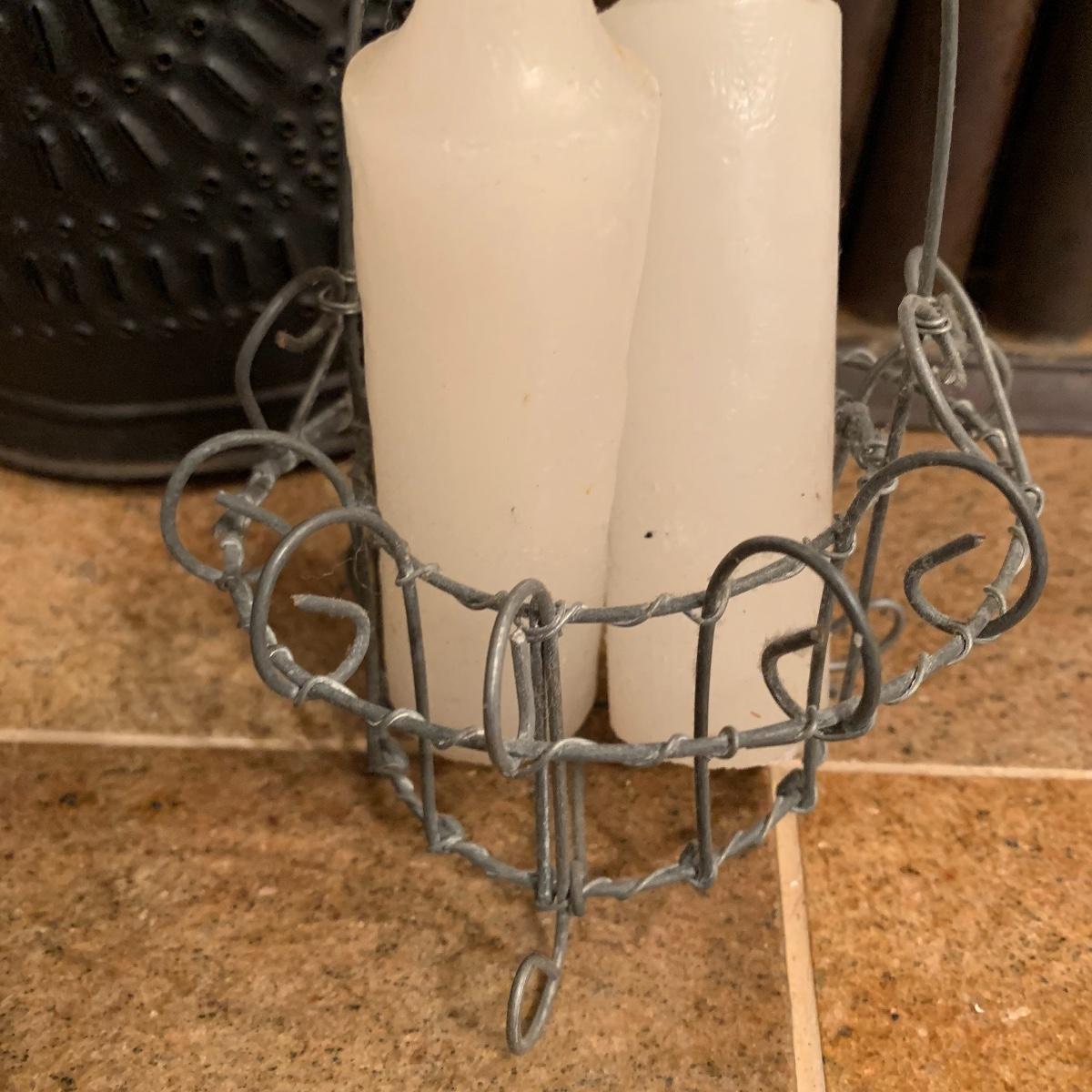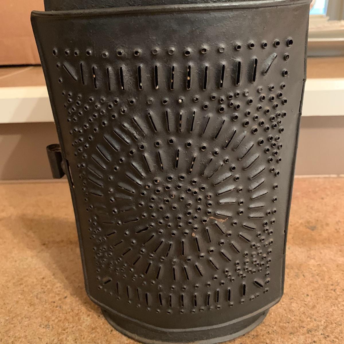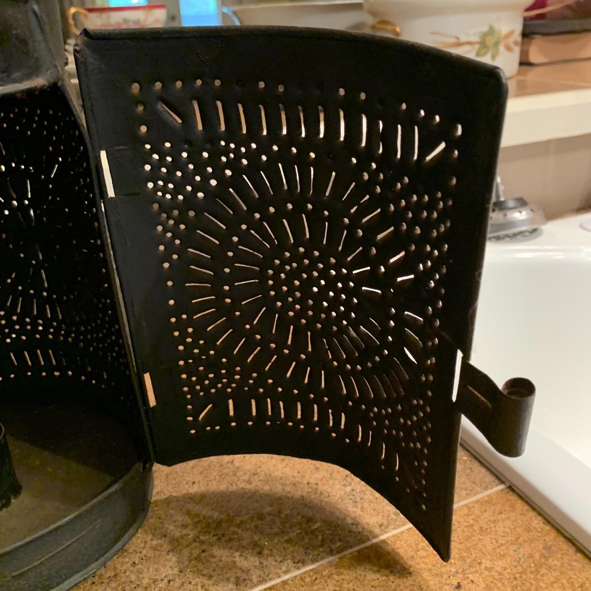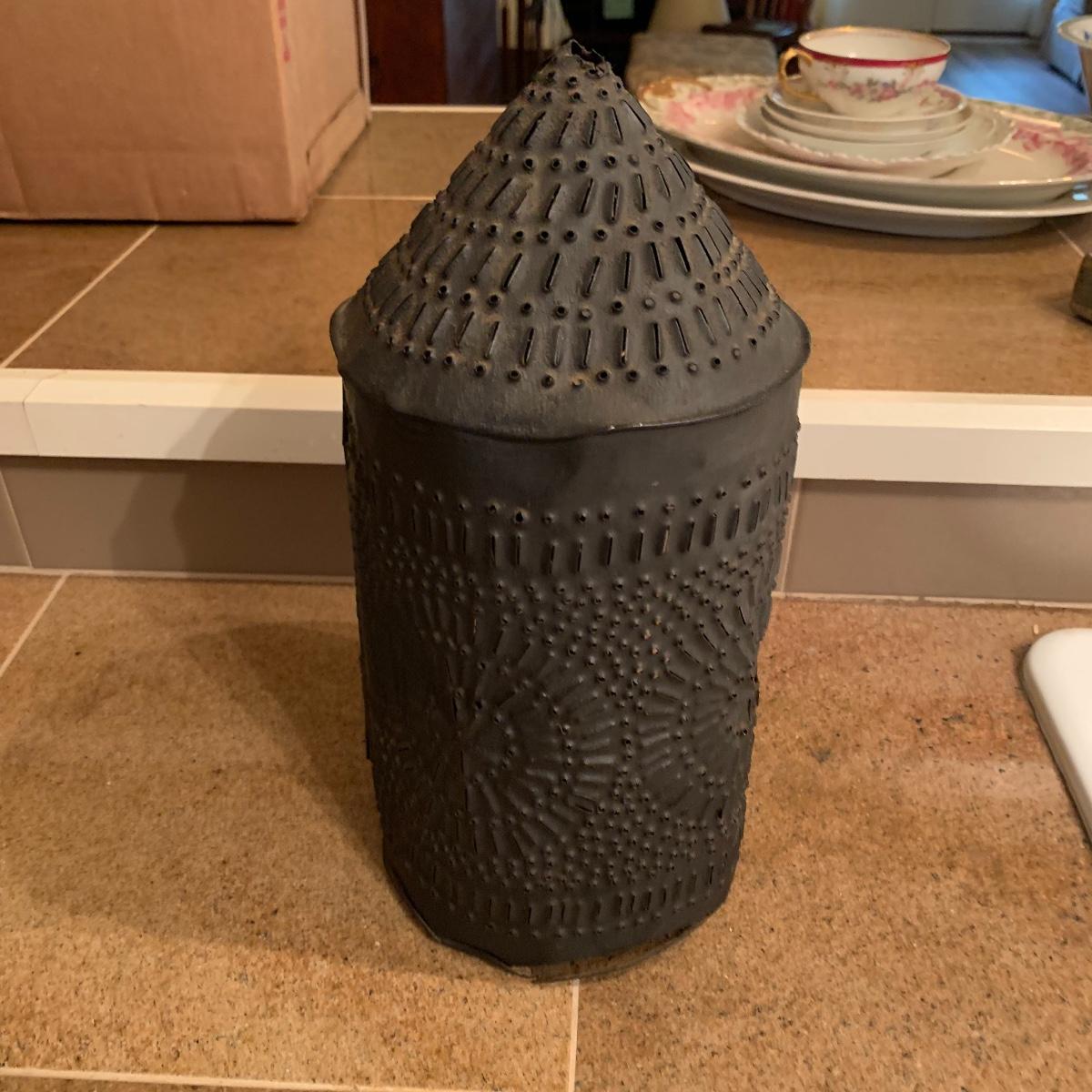 Lot includes a vintage candle lantern that features decorative holes and a easy operable door, a brass candle making mold, and a little wire basket holding two candles. The lantern stands 13” tall.