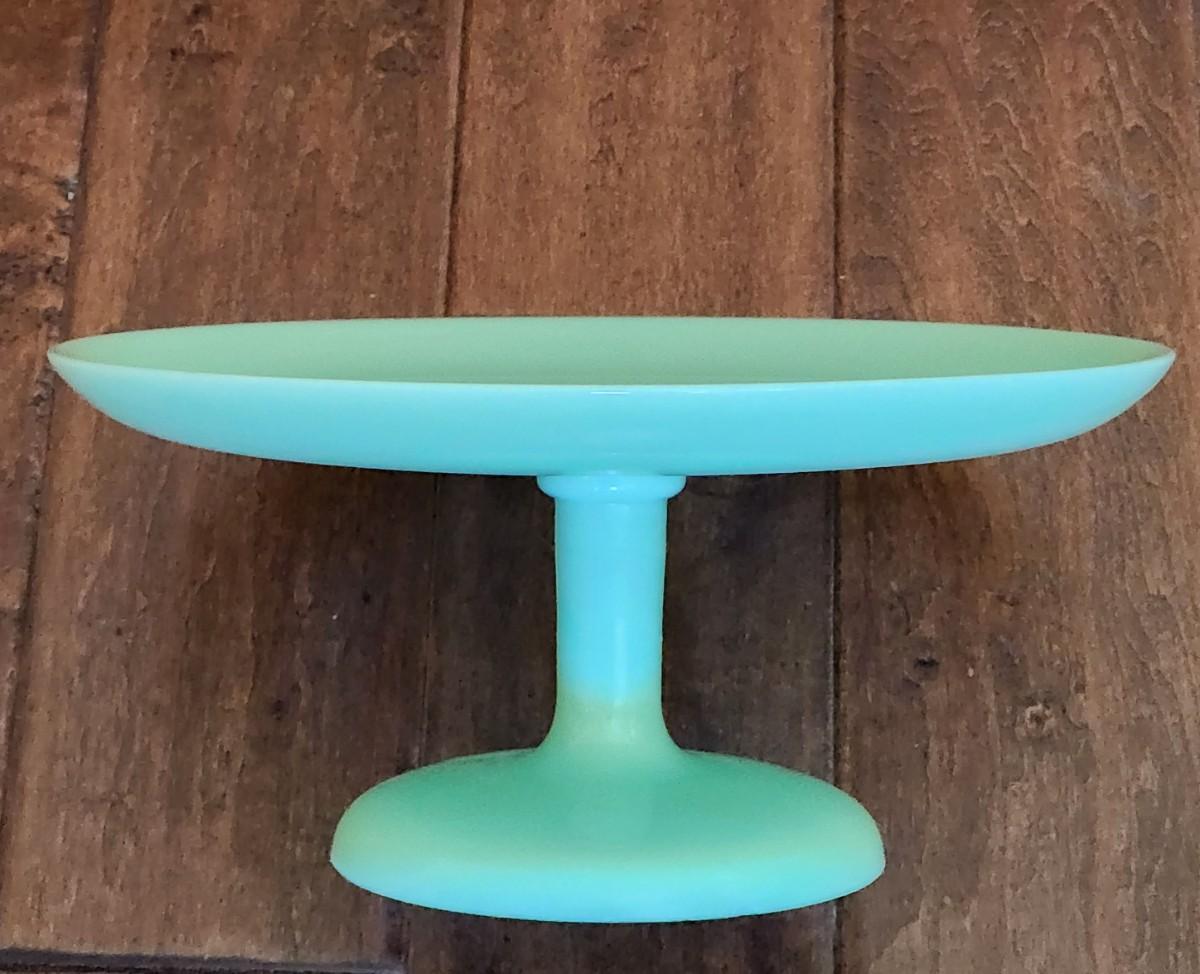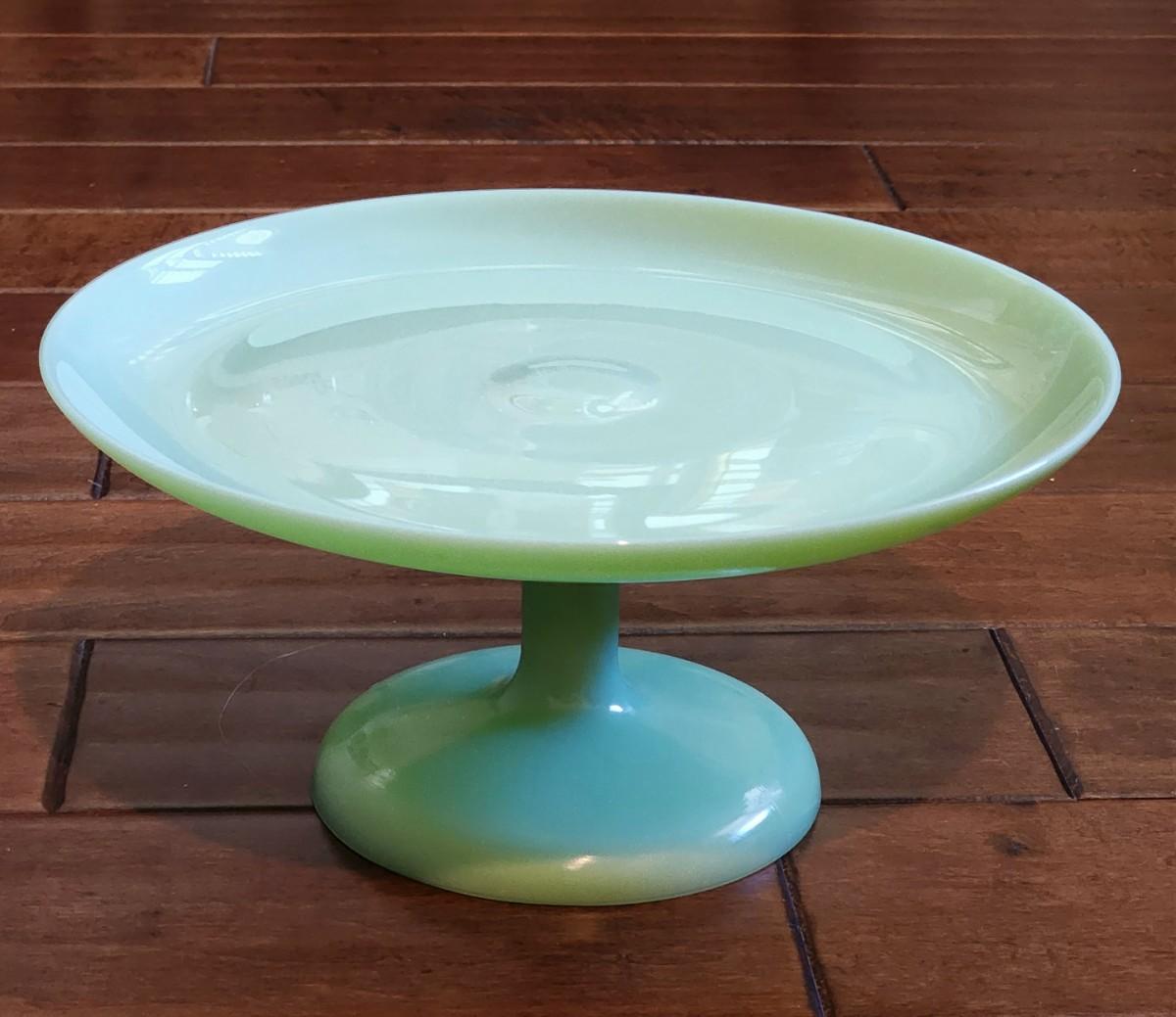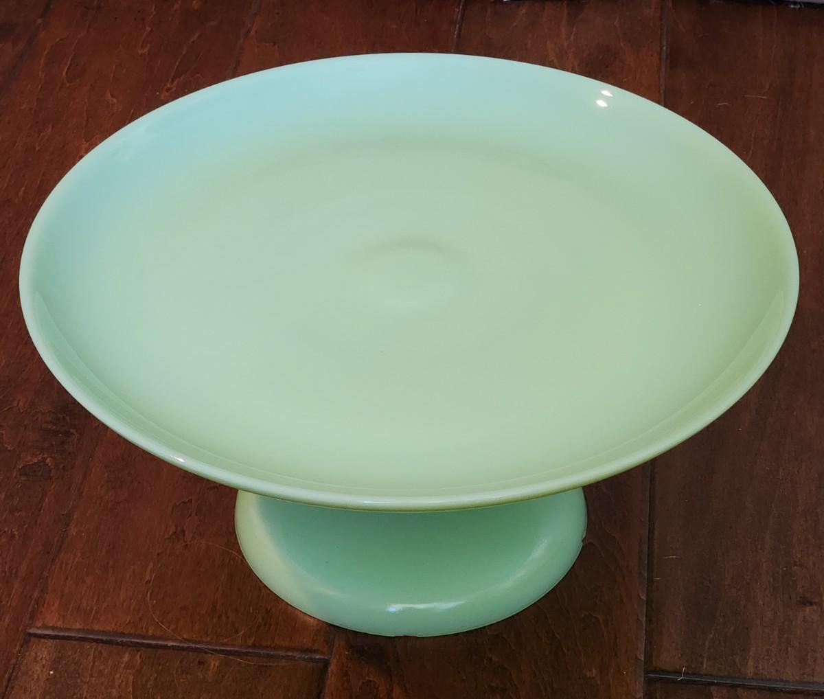 Classic jadeite green glass cake platter. 12" diameter, 5" tall.
