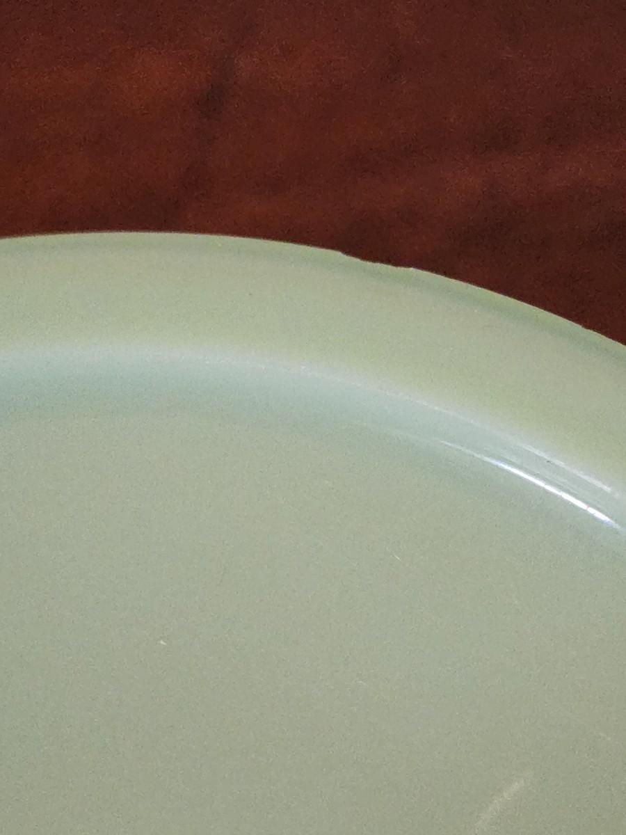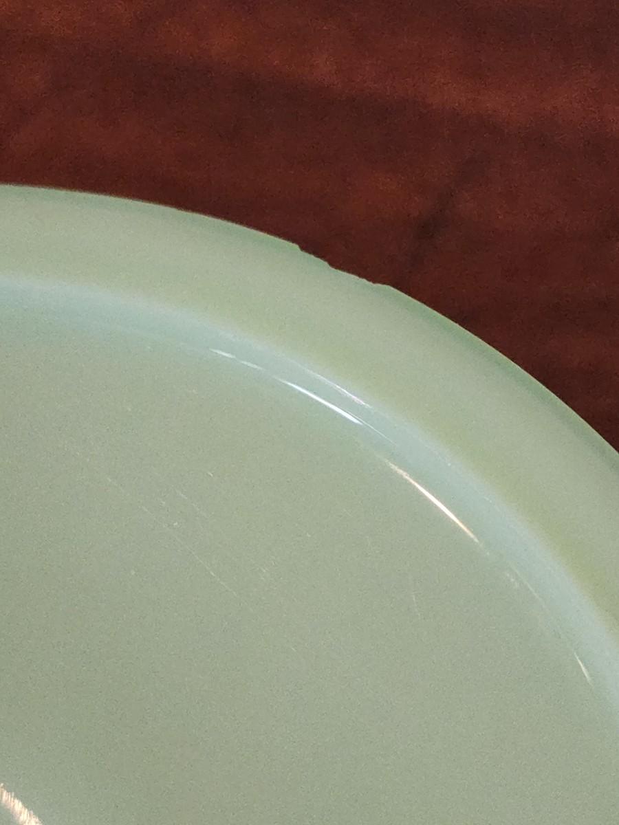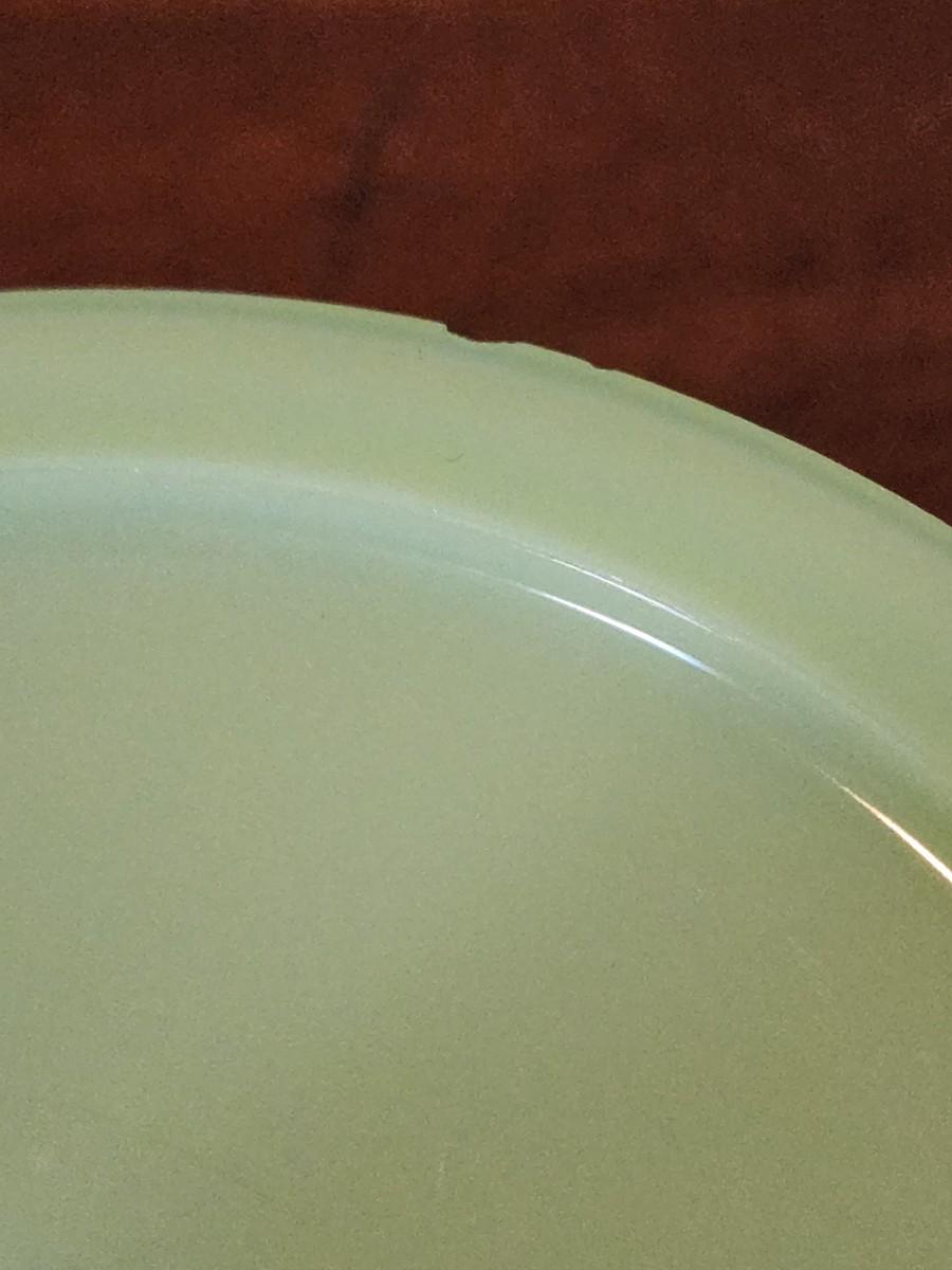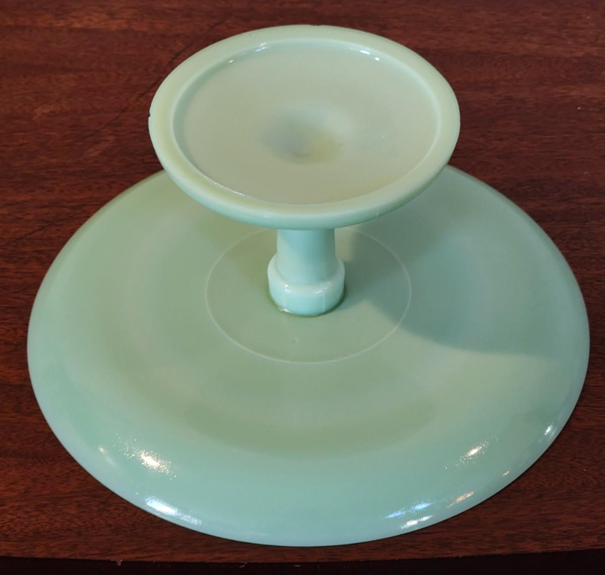 Classic jadeite green glass cake platter. 12" diameter, 5" tall.