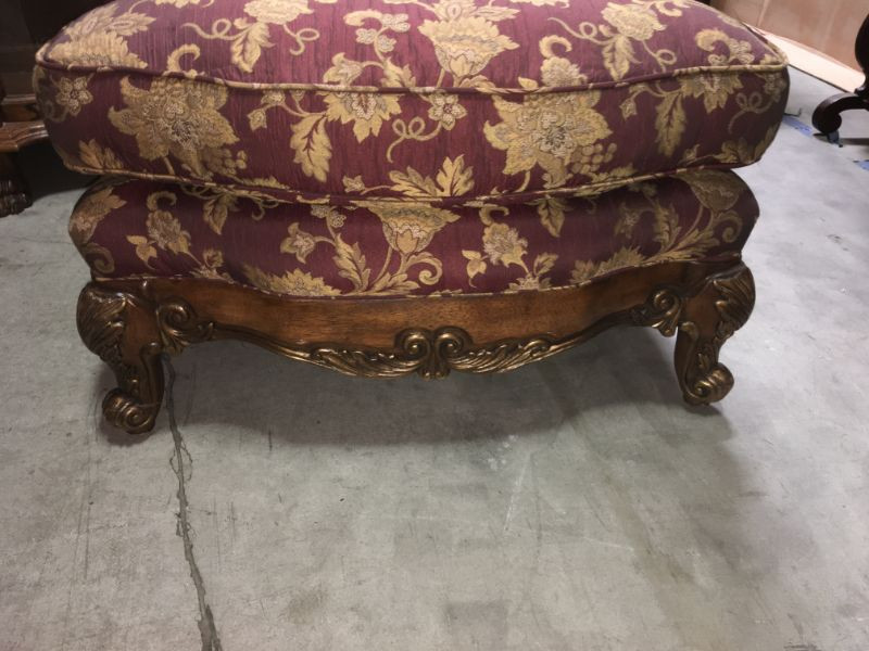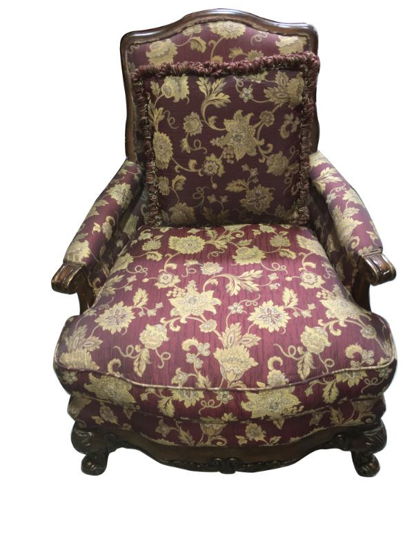 Large armchair with a width span of 34", a depth of 39" and a height of 40.5". Made by Univeral, original upholstery and pillow, solid piece, can't see anything wrong but couple of scratches and that it needs a good wash (the upholstery). But you need to keep the original upholstery which is gorgeous.This item has a reserve.