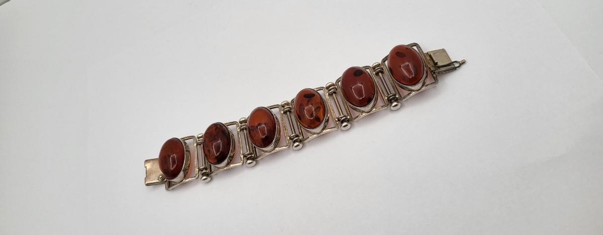 Six oval Baltic Amber cabachons 1" x .75", in solid setting of sterling silver. Each panel has a unique link hinge allowing for a nice flow of the piece. Each piece of amber is unique in itself. Measures 7.25" long and has a secure push clasp. Nice natural patina.