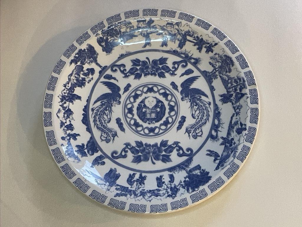 Vintage Large Blue and White Porcelain Taiwanese Round Serving Platter with deminations 14.5ʺW × 14.5ʺD × 2ʺH
