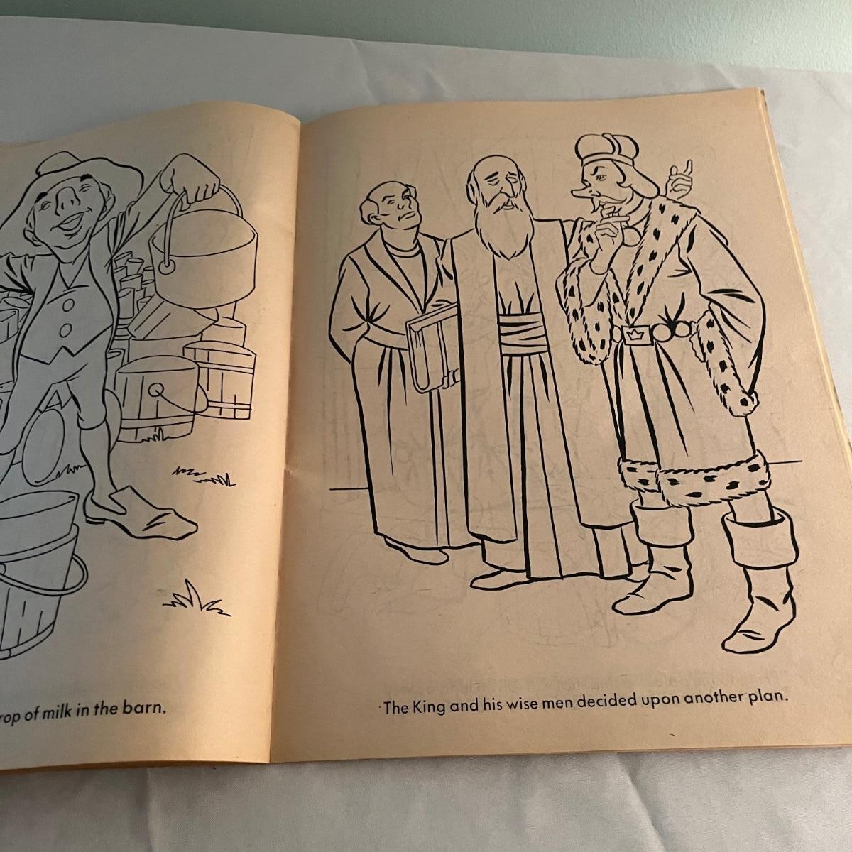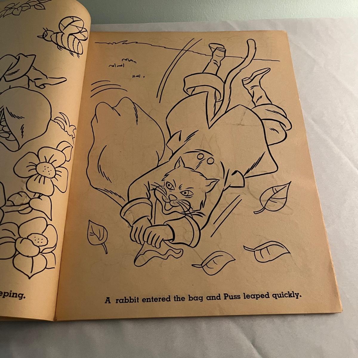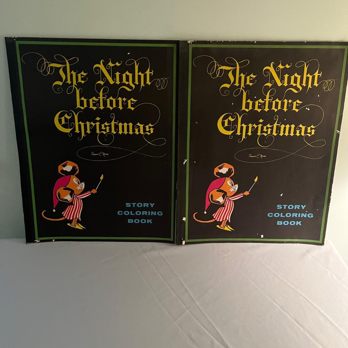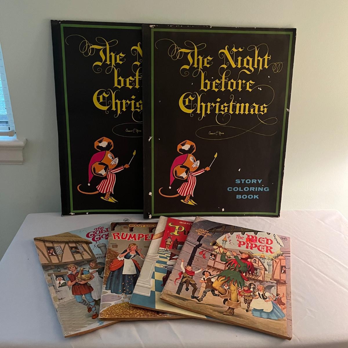 Lot includes two The Night Before Christmas coloring books that appear unused, Puss in Boots, The Pied Piper, The Golden Goose and Rumplestiltskin coloring books that have been colored in on a few pages. Largest books measure 17” x 21.75”.