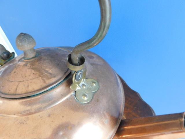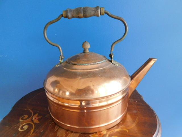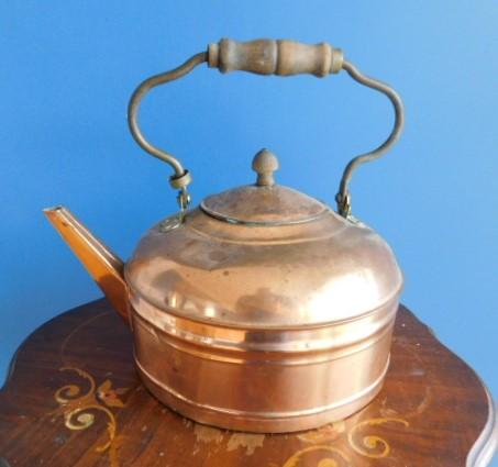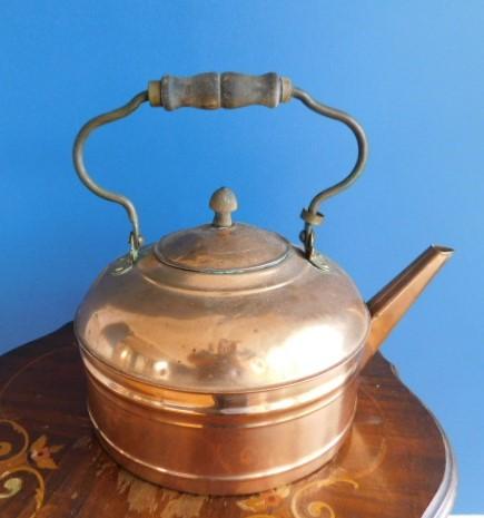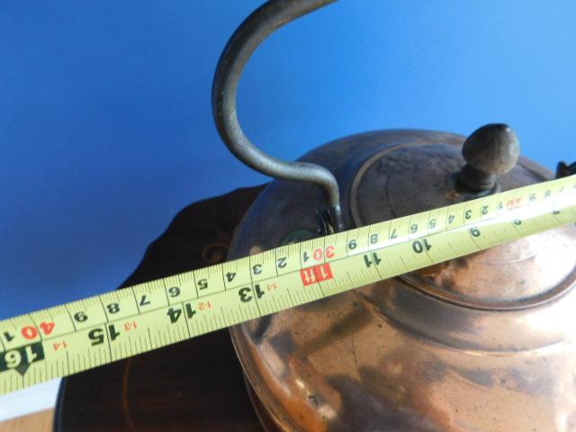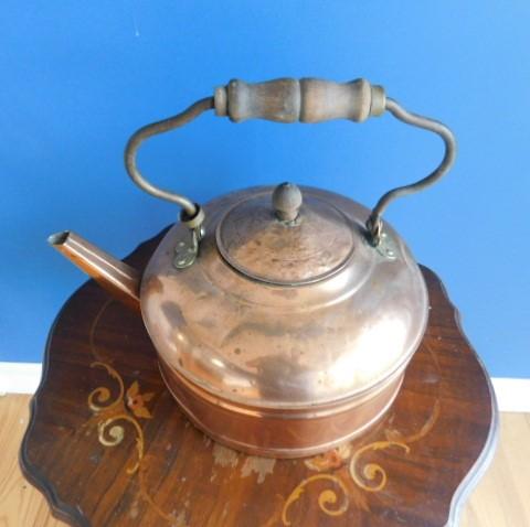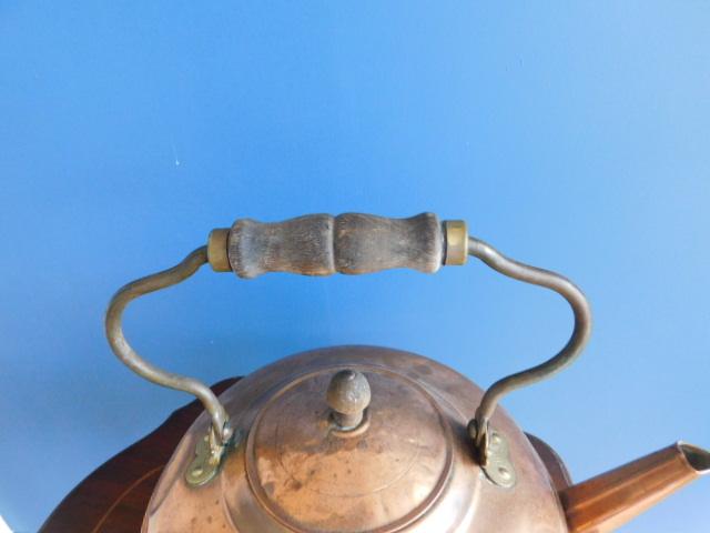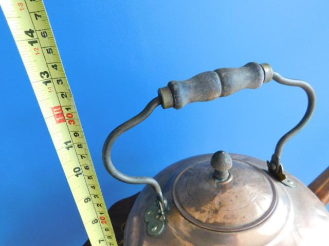 Large Copper Tea Kettle with Wood Handle 13"x12" will need to be cleaned. Has a ding or dent along the way