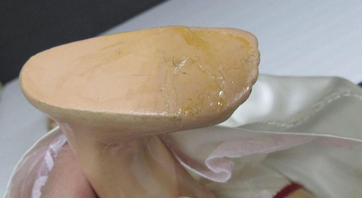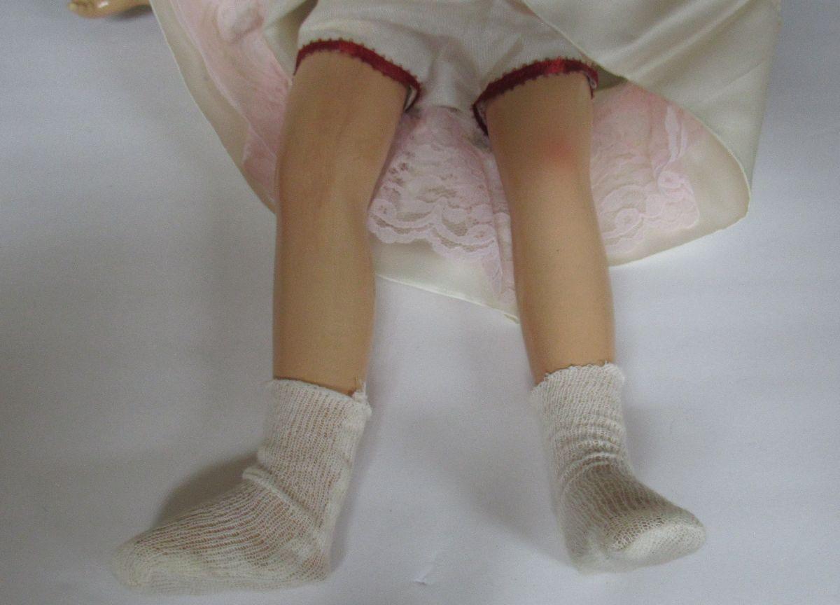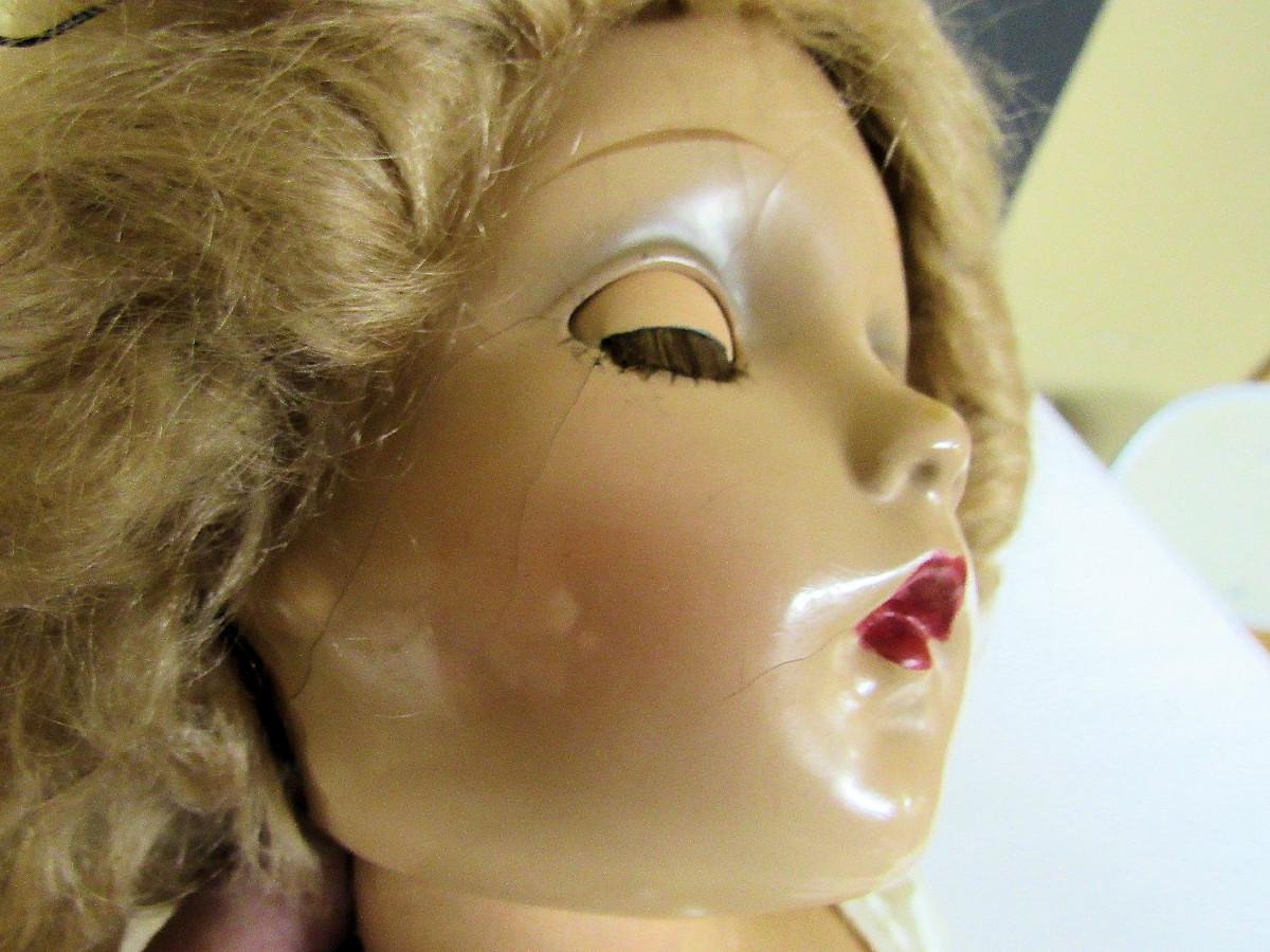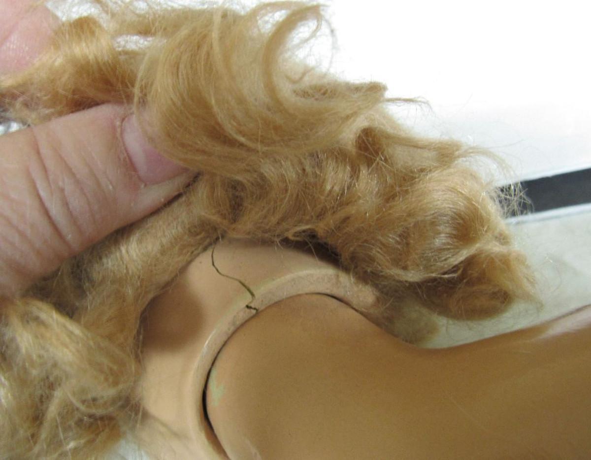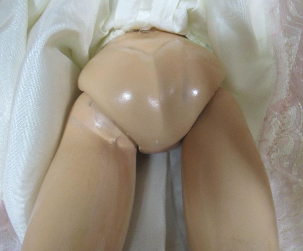 Unfortunately the face has a lot of small and some longer cracks throughout as seen in close up photos. There is a crack on neck back and bottom of one foot. Hands, legs, arms, torso all good. Hoping someone can give her some TLC - she is a beautiful doll. She comes with some hand made clothes and bedding. The bedding is well worn and soiled.