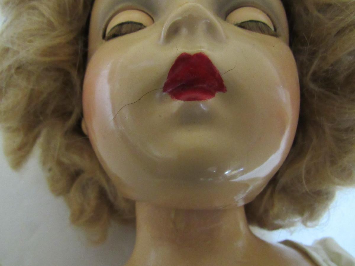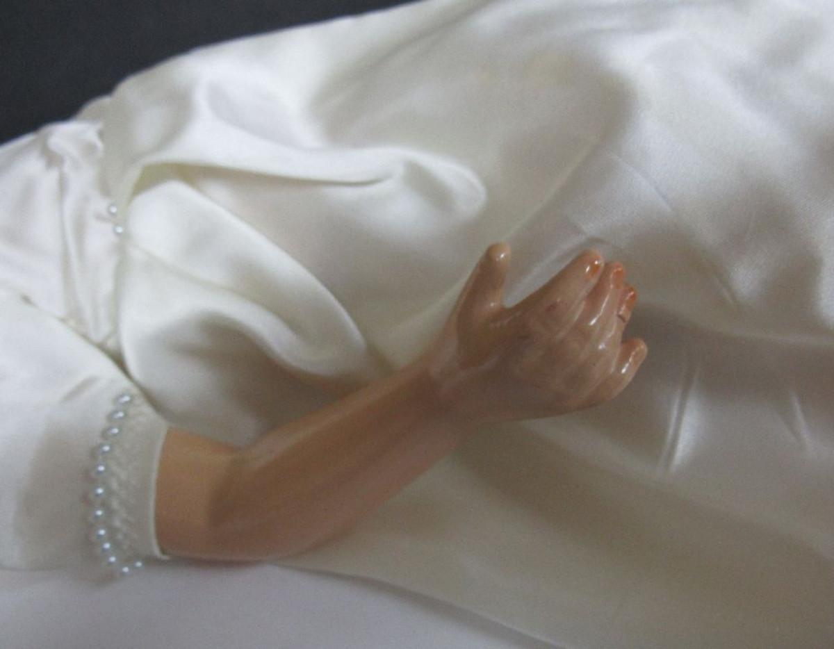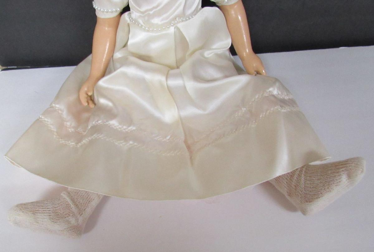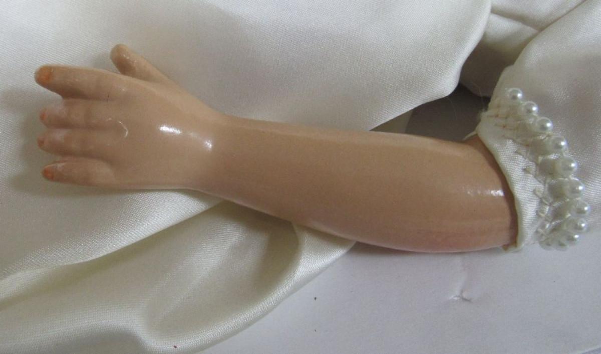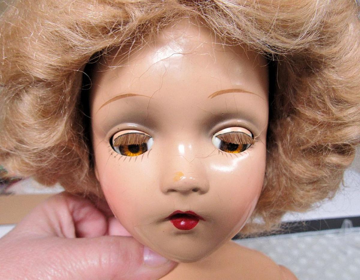 Unfortunately the face has a lot of small and some longer cracks throughout as seen in close up photos. There is a crack on neck back and bottom of one foot. Hands, legs, arms, torso all good. Hoping someone can give her some TLC - she is a beautiful doll. She comes with some hand made clothes and bedding. The bedding is well worn and soiled.