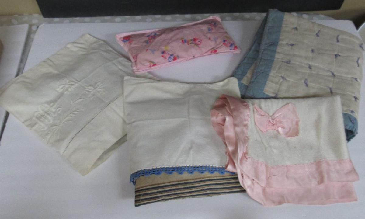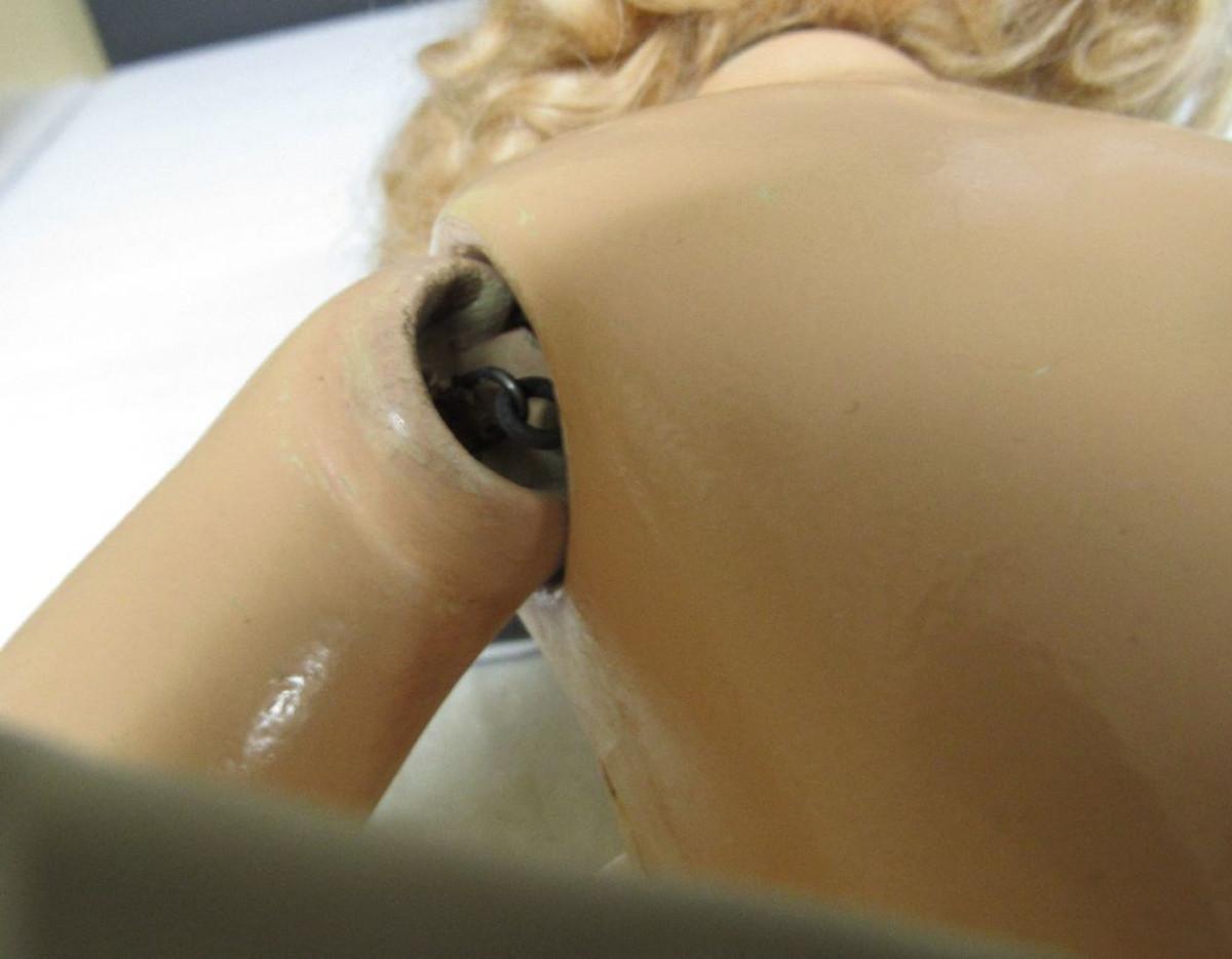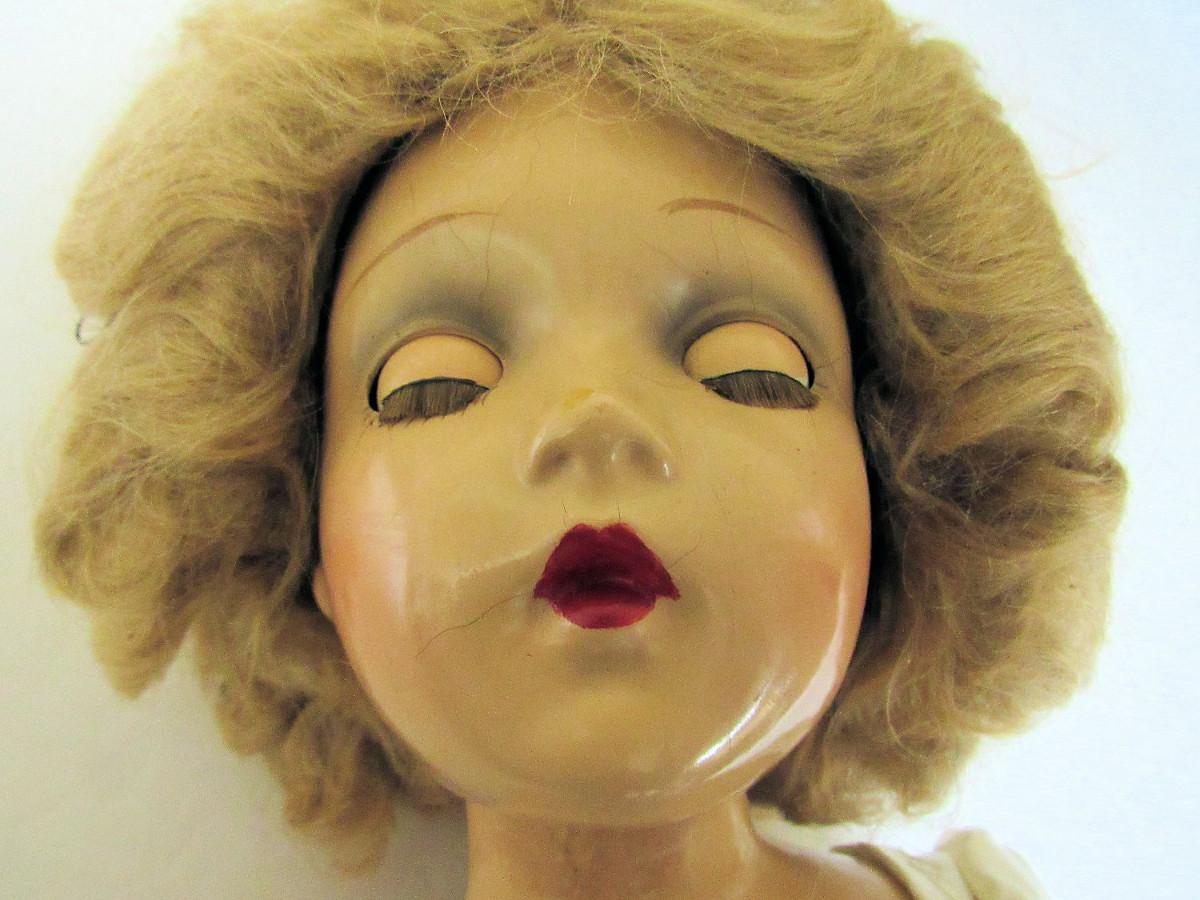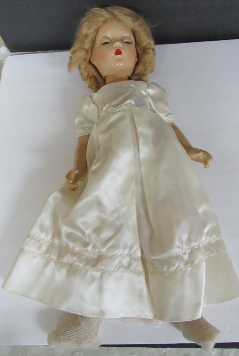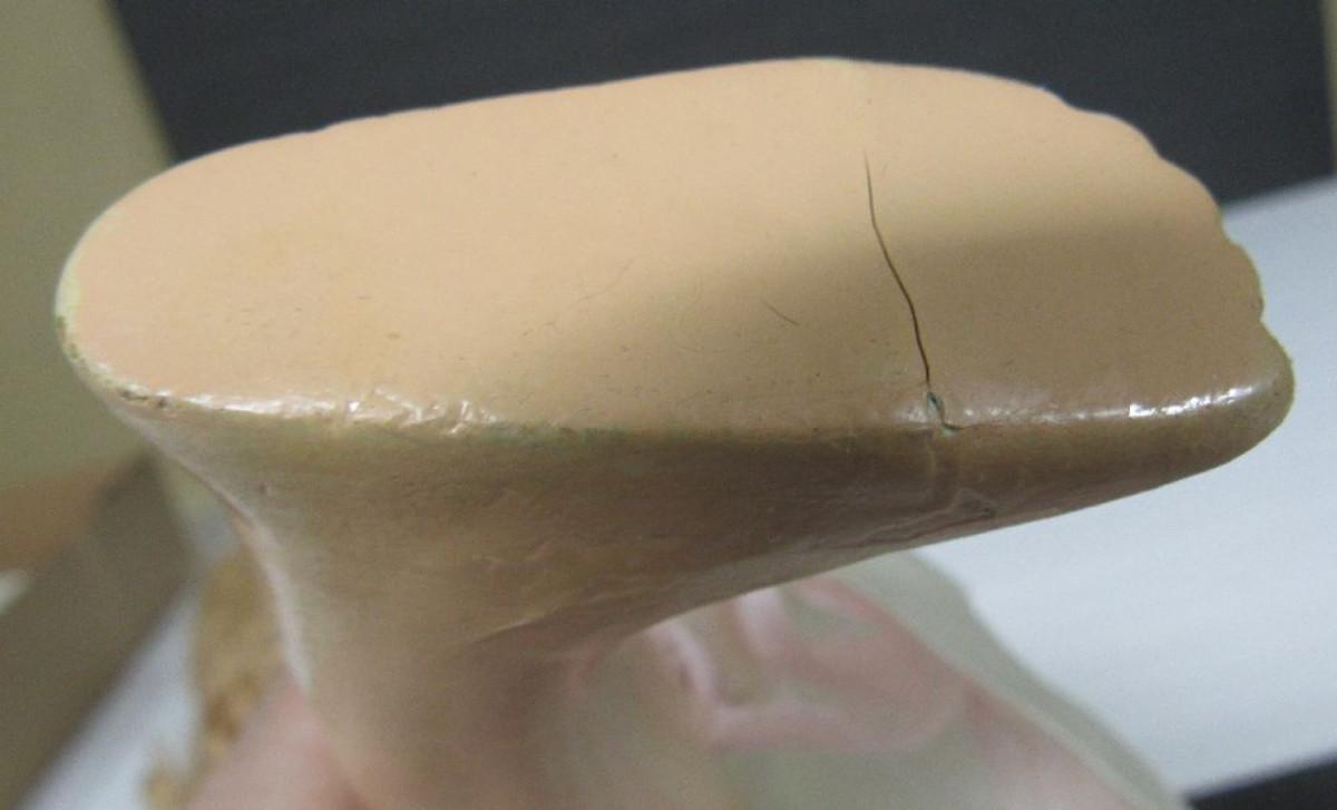 Unfortunately the face has a lot of small and some longer cracks throughout as seen in close up photos. There is a crack on neck back and bottom of one foot. Hands, legs, arms, torso all good. Hoping someone can give her some TLC - she is a beautiful doll. She comes with some hand made clothes and bedding. The bedding is well worn and soiled.