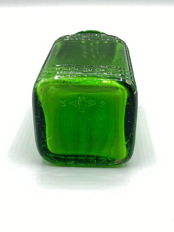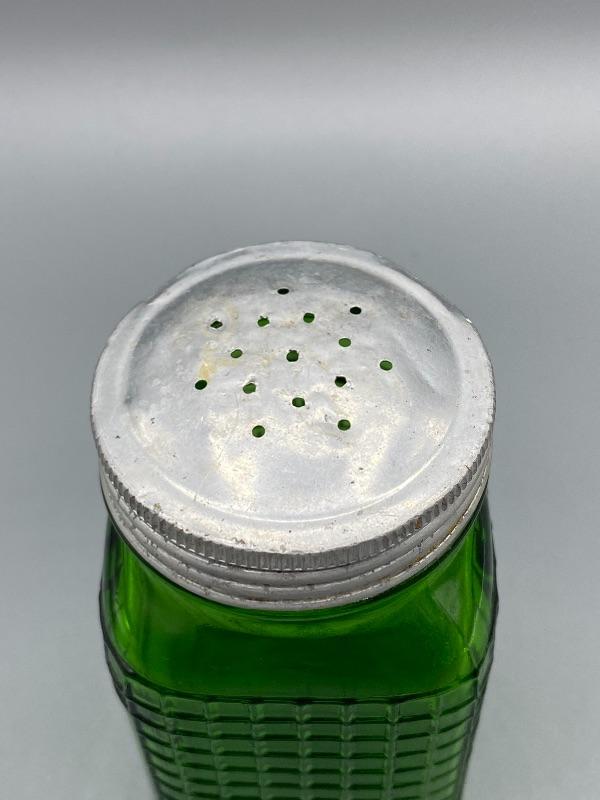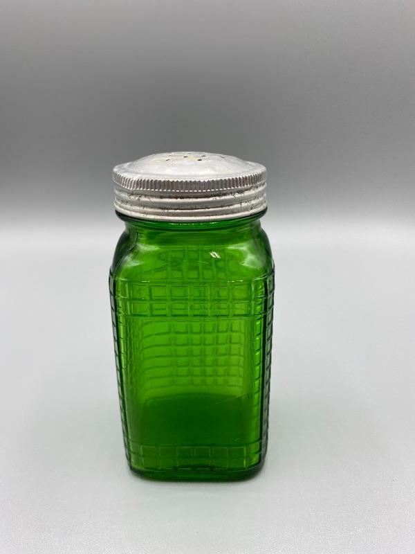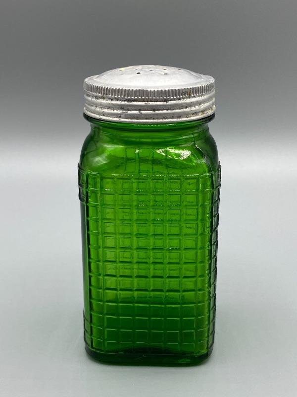 Vintage glass salt shaker. Emerald green glass. Over 3” tall. Some dents in lid but in otherwise good condition.
