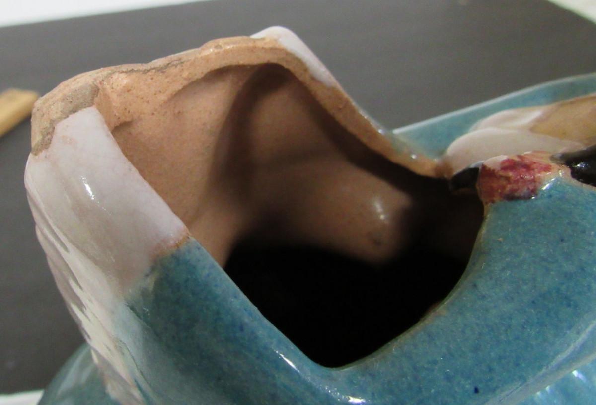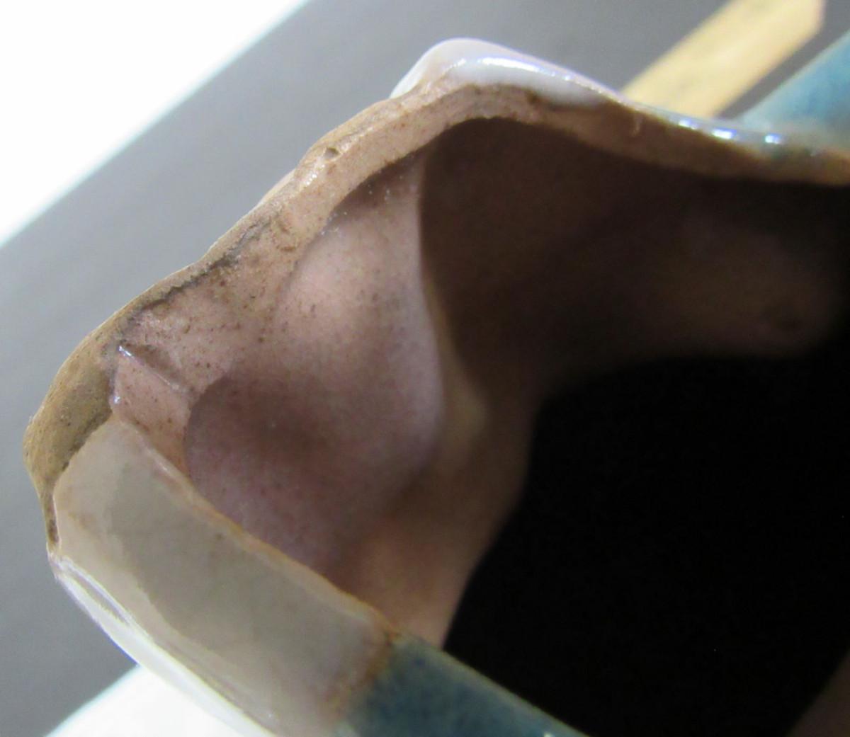 Good condition. An imperfection just inside the opening of the planter - see magnified photos, Not a big deal really. I can't quite make out the mark on the bottom. It looks like By Beth Niles, but not sure.