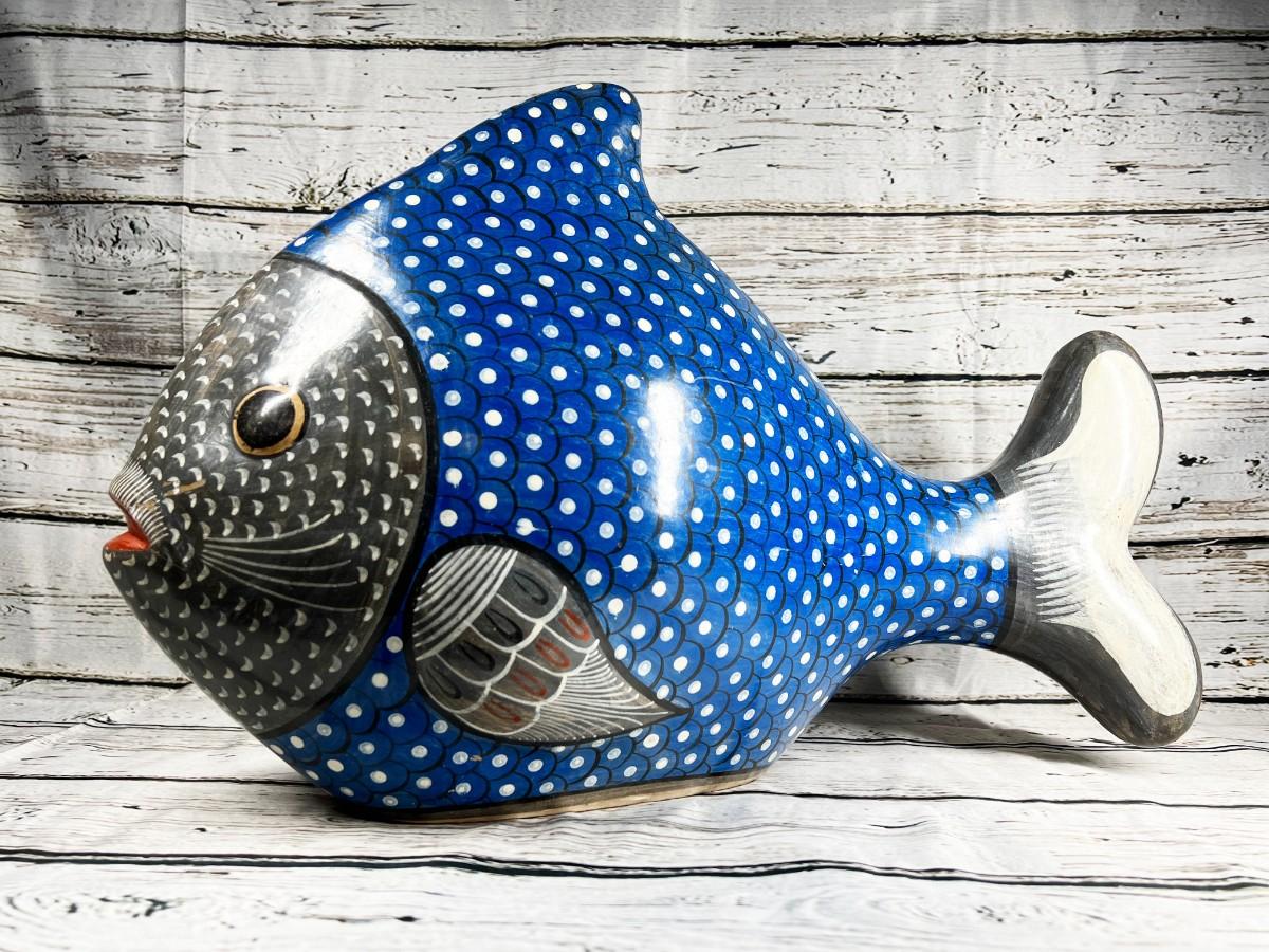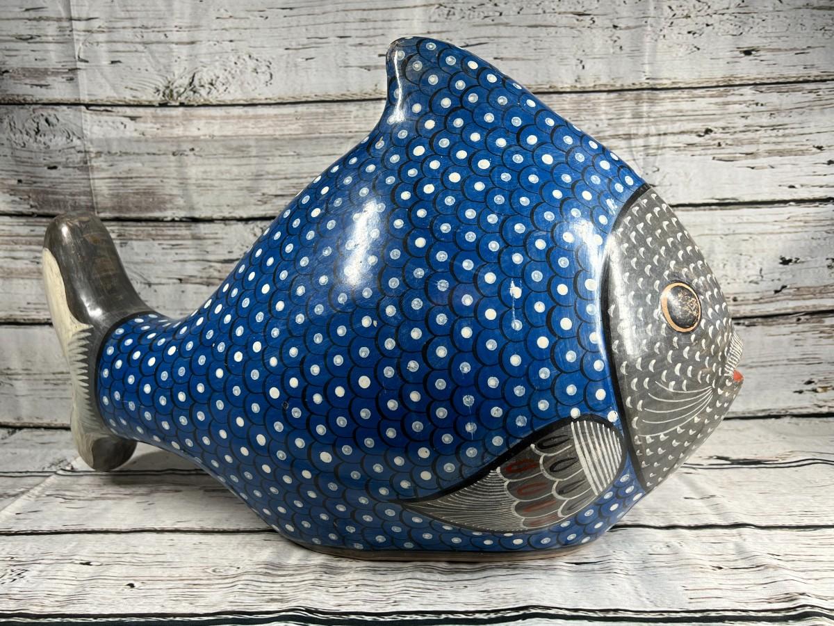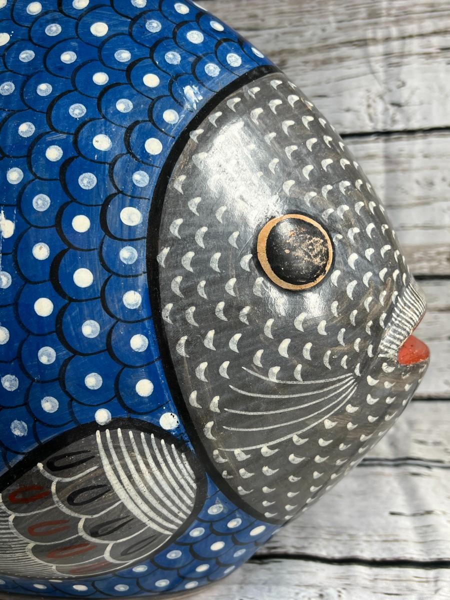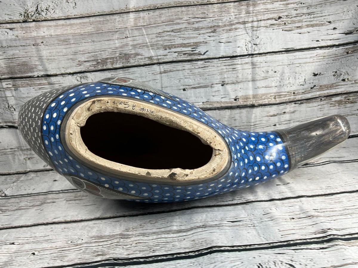 Vintage Large Made in Mexico Souvenir Hand Painted Smooth Clay Plaster Blue Aquatic Fish