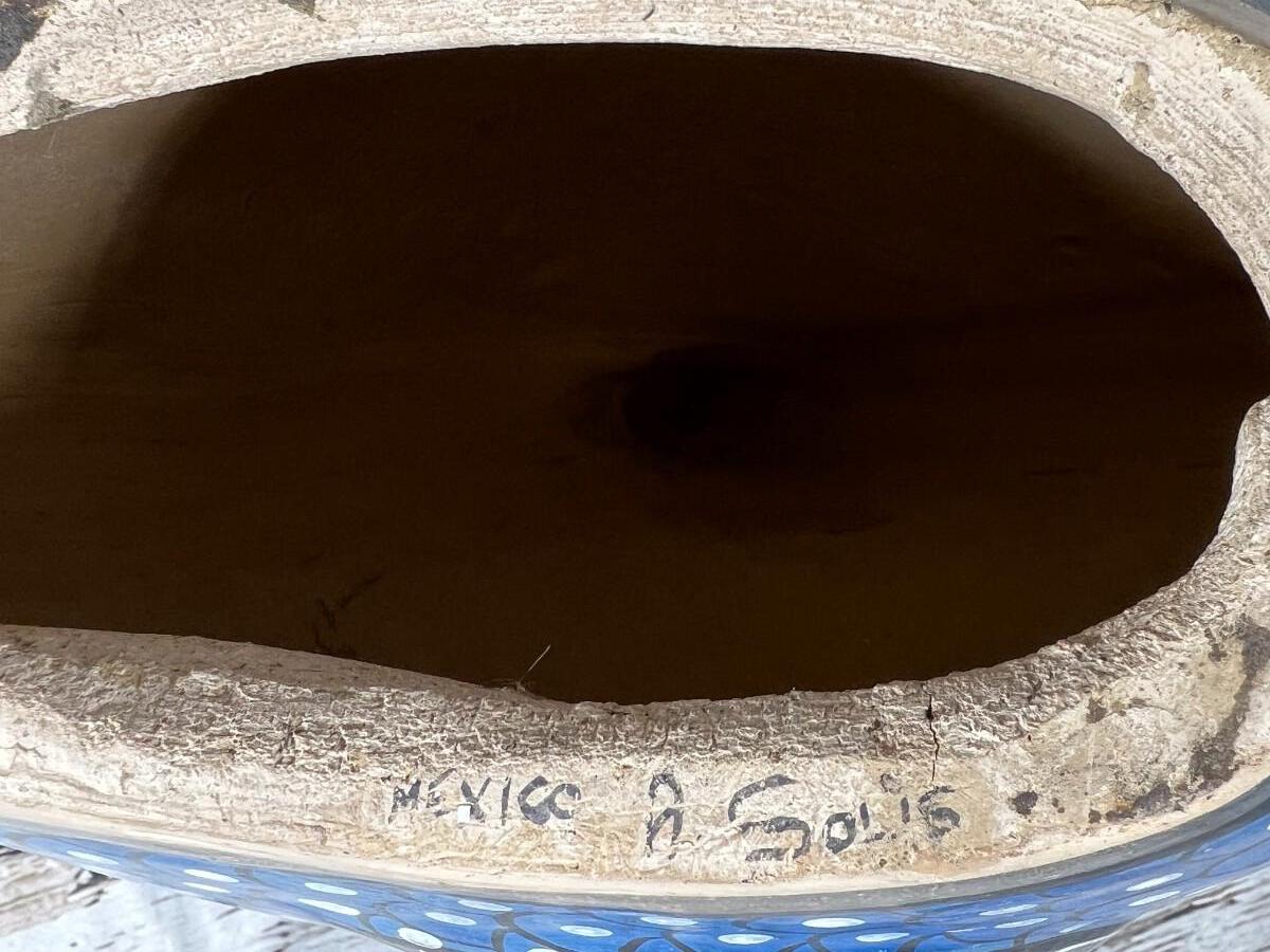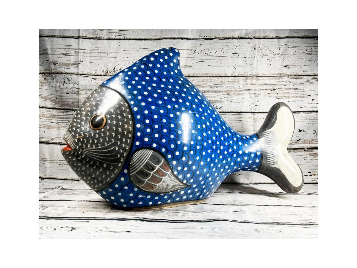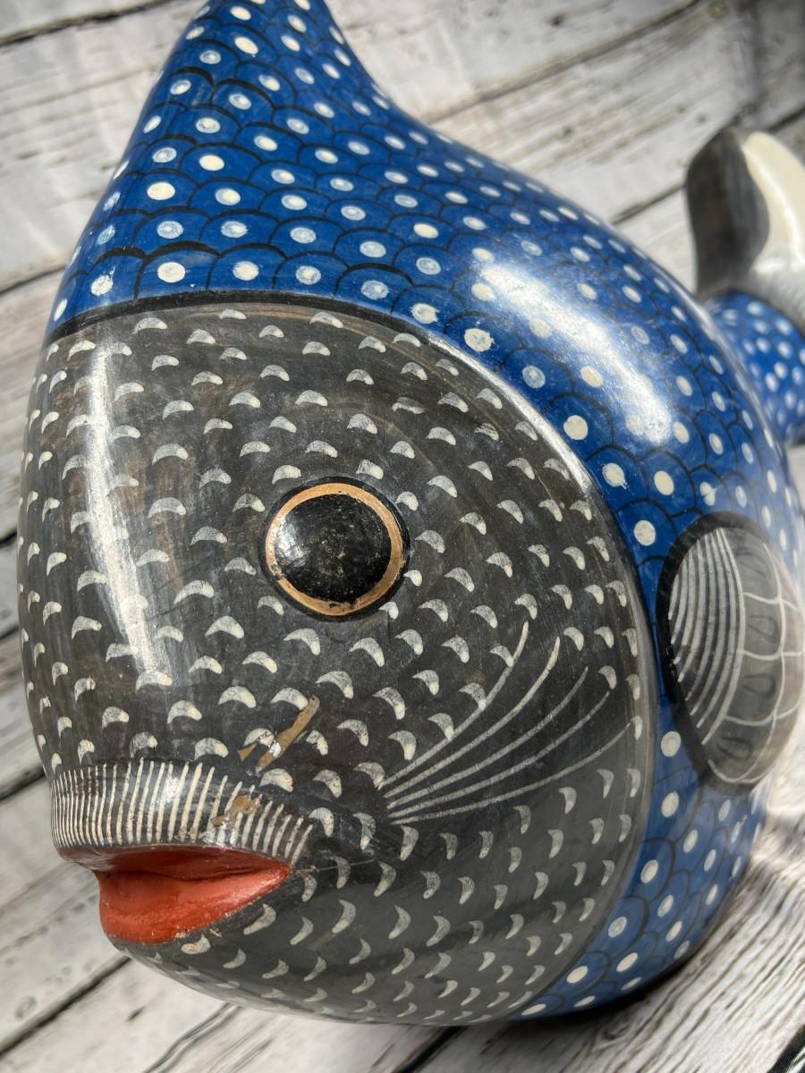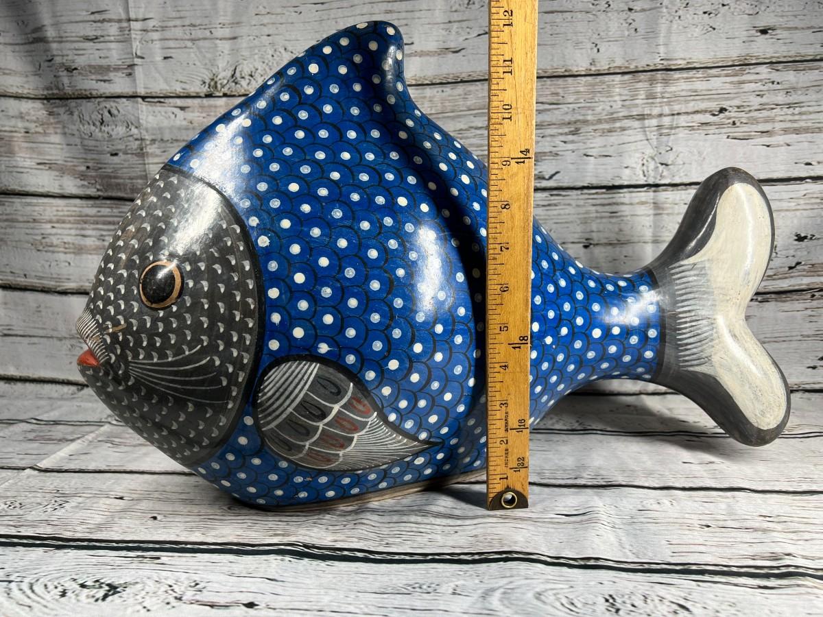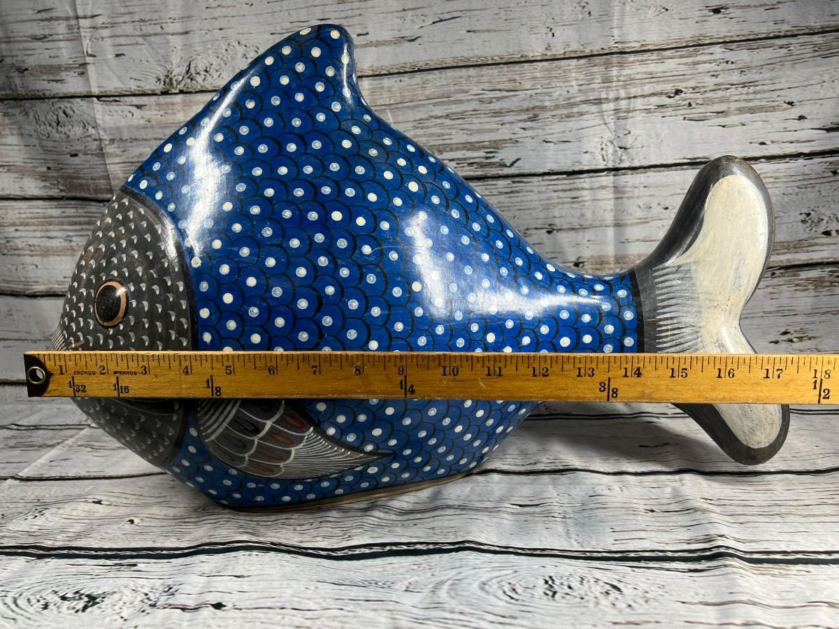 Vintage Large Made in Mexico Souvenir Hand Painted Smooth Clay Plaster Blue Aquatic Fish