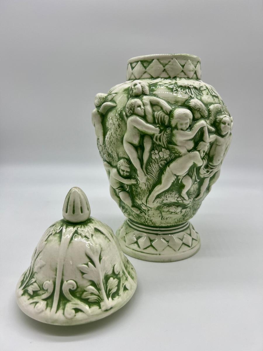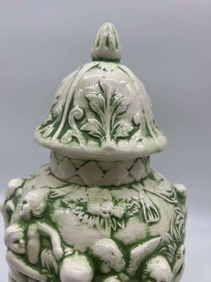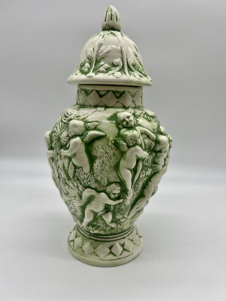 1973 Vintage Large Ornate Decorative Cherubs Angels green and off white. 13 inches tall and 7 inches wide