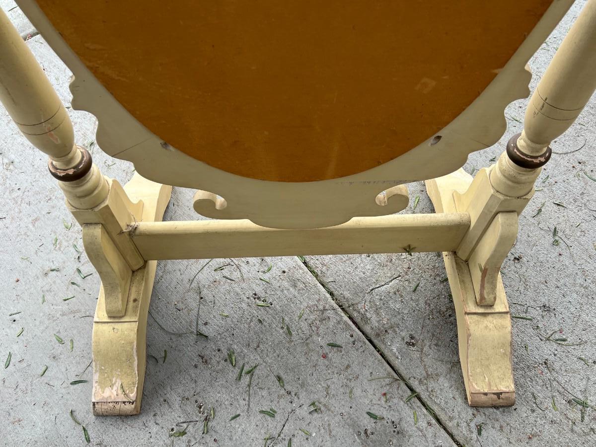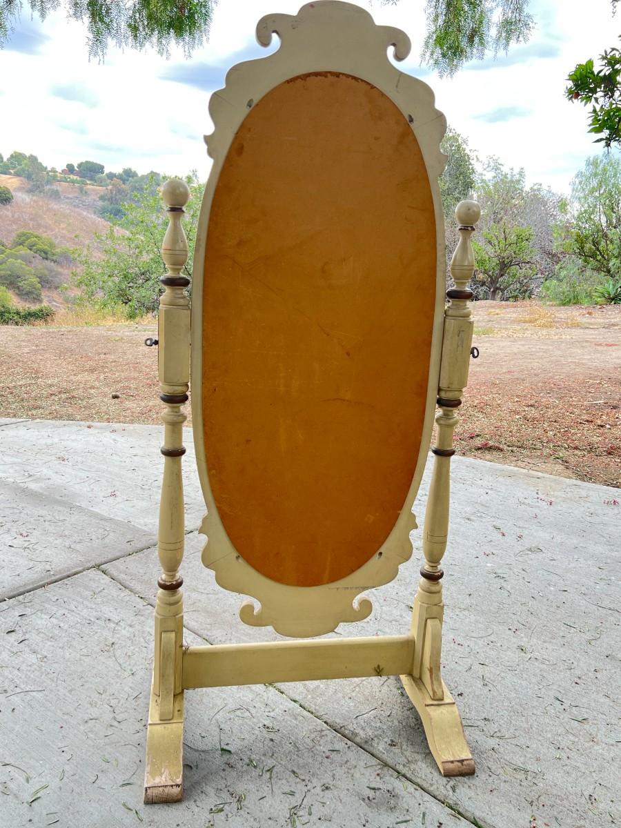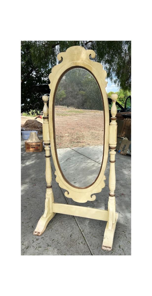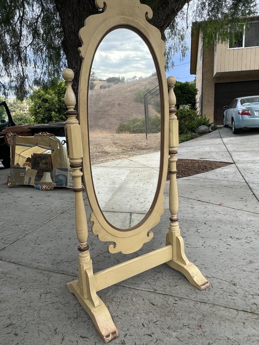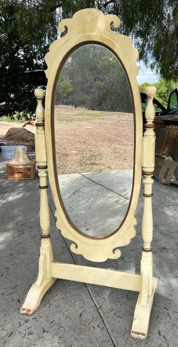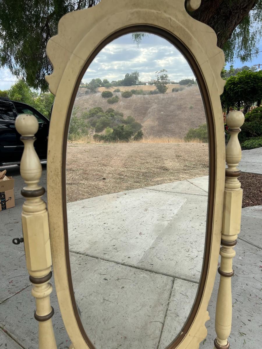 Vintage Large Oval Standing Mirror. In good vintage condition. Some wear to the paint. About 5.5' in height and almost3' wide. Mirror can be tilted for perfect viewing angles. TO BE PICKED UP IN LA HABRA HEIGHTS. WE WILL SCHEDULE PICK UP AFTER JULY 4TH.