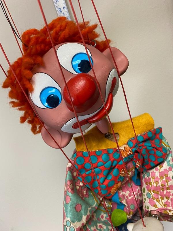 Rare vintage Pelham Puppet. Happy hobo clown marionette, stands about 28" without strings and about 45" from handle to feet. Original company stamped wood control piece, strings are untangled. Mouth has a control string to open & close, felt tongue still attached in mouth. Googly eyes that move when head is tilted. Other then a little dust from being displayed, puppet is in good condition. Did not notice or find any damage or repairs. Paint on face is still bright and colorful. No holes in clothes.