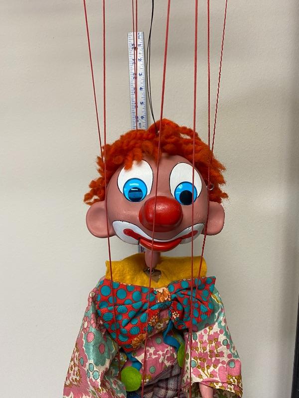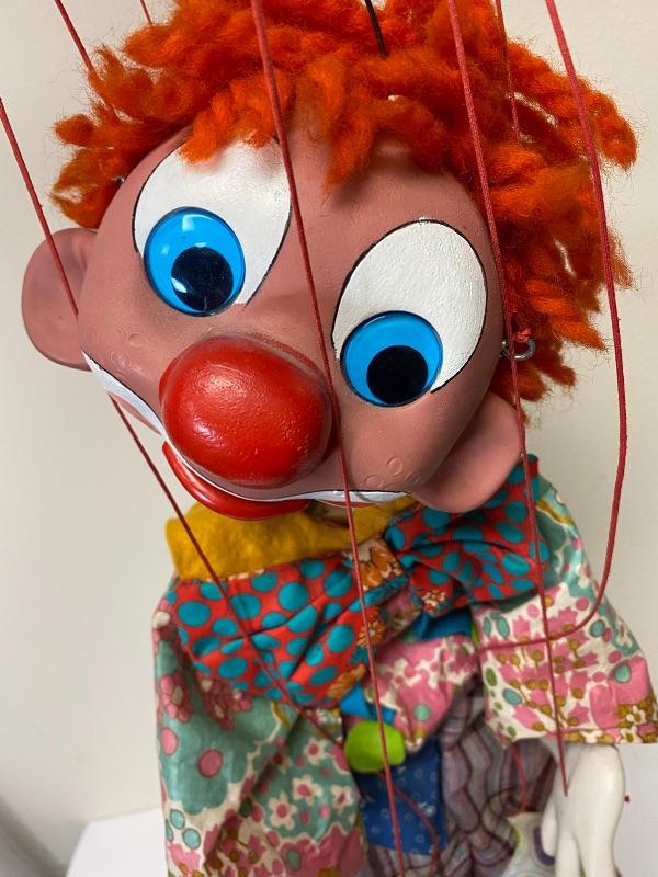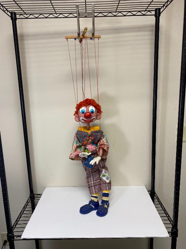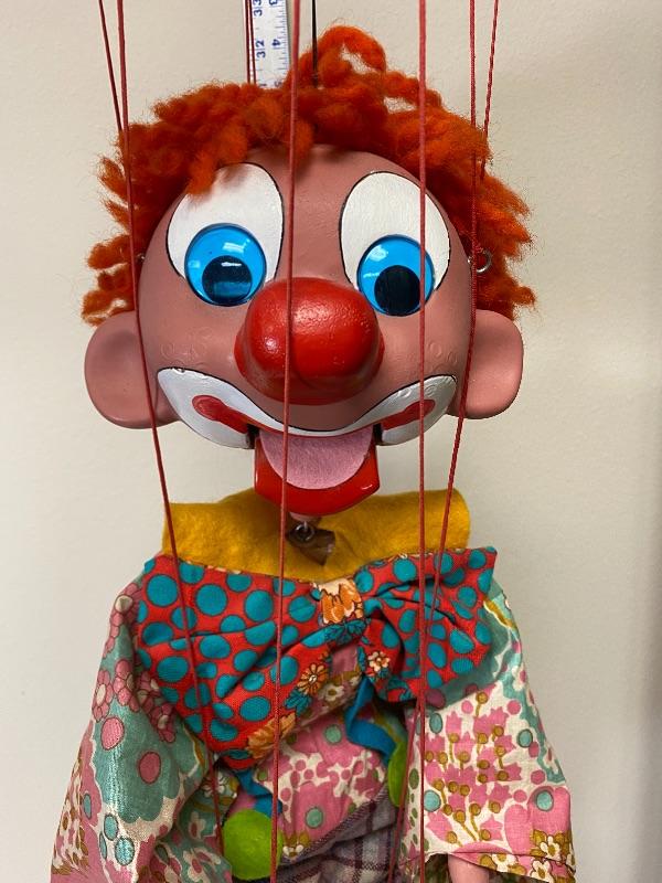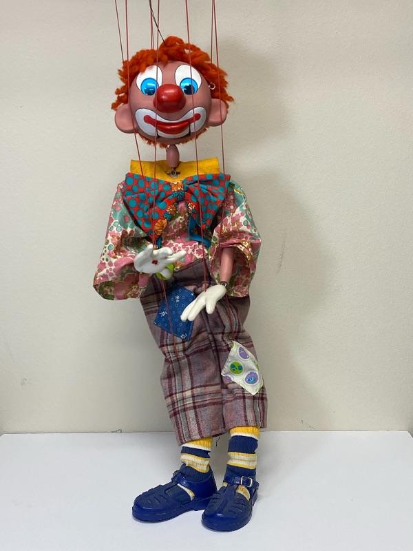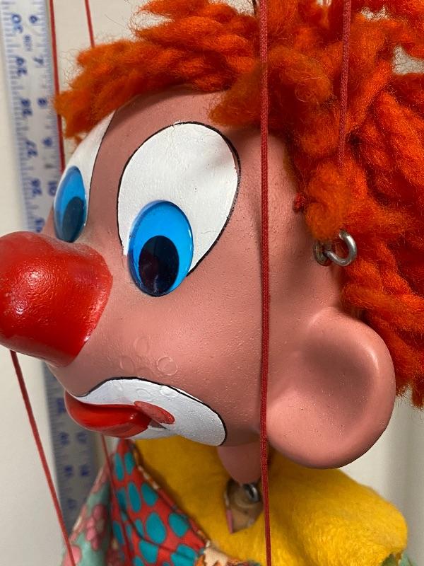 Rare vintage Pelham Puppet. Happy hobo clown marionette, stands about 28" without strings and about 45" from handle to feet. Original company stamped wood control piece, strings are untangled. Mouth has a control string to open & close, felt tongue still attached in mouth. Googly eyes that move when head is tilted. Other then a little dust from being displayed, puppet is in good condition. Did not notice or find any damage or repairs. Paint on face is still bright and colorful. No holes in clothes.