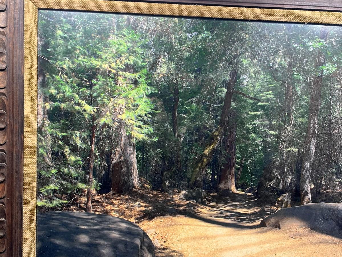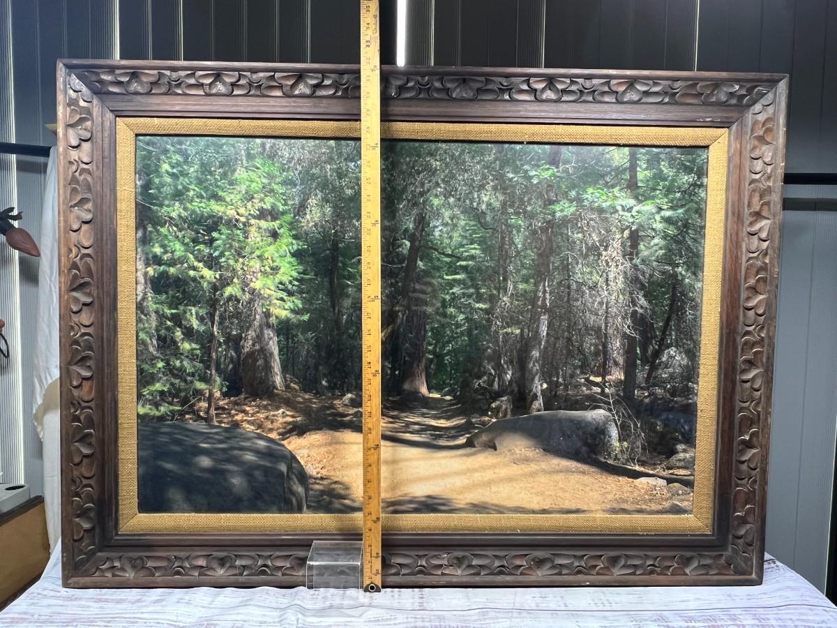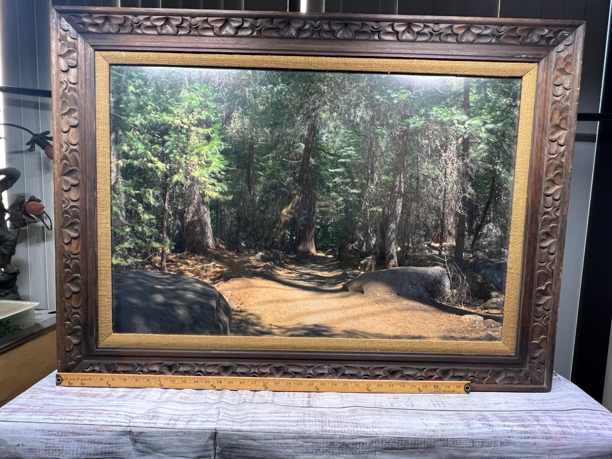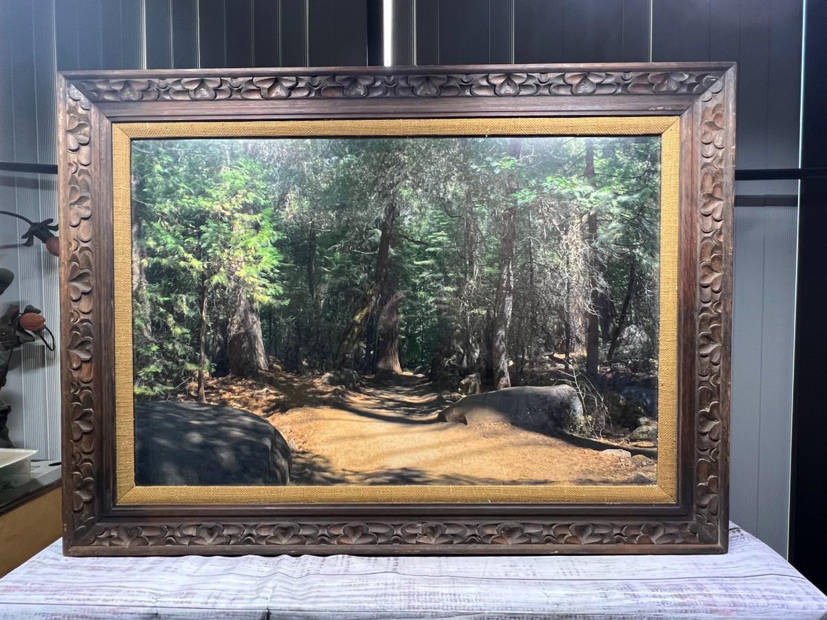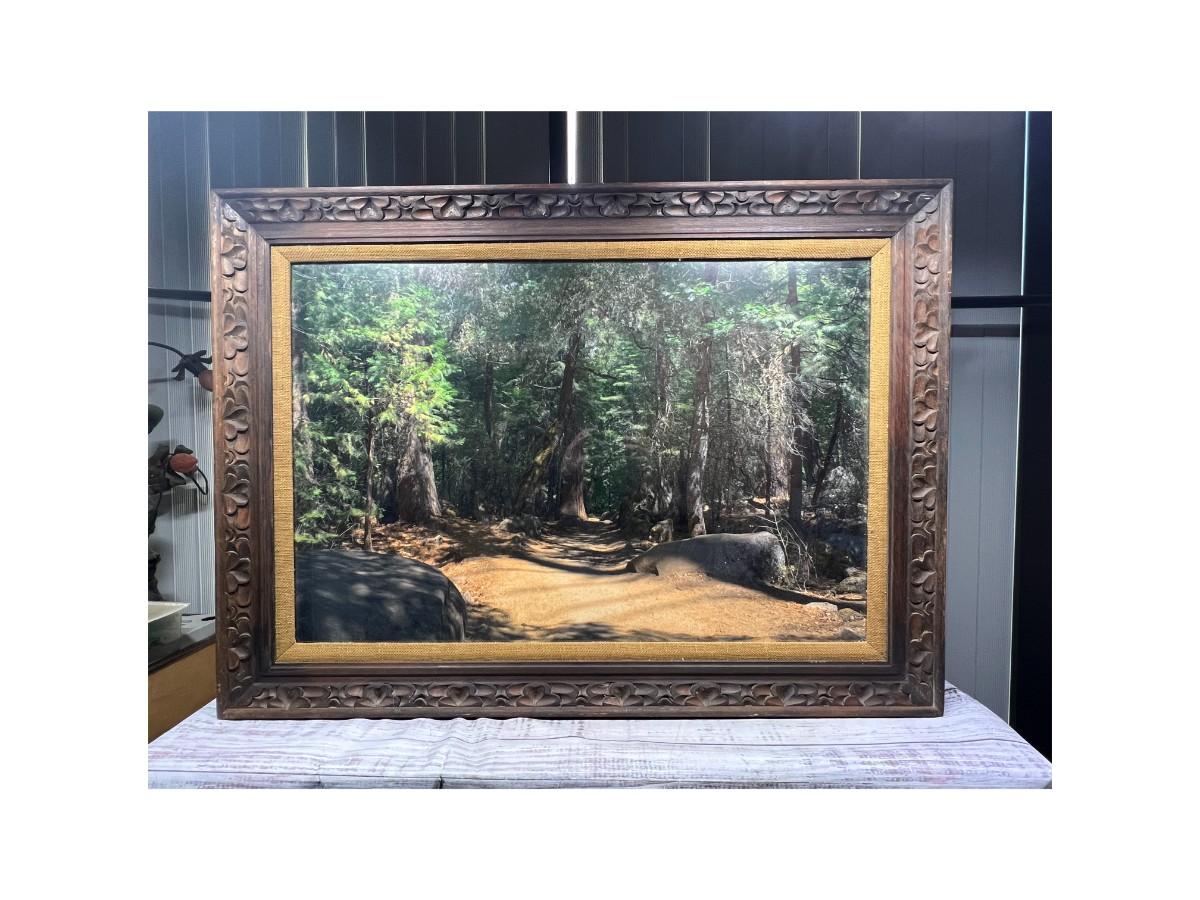 Vintage Large Photo of Mountain Forest Scenery, there is no significant damage to the frame or the photo and is in good displayable condition. Check pictures for more details and for sizing.