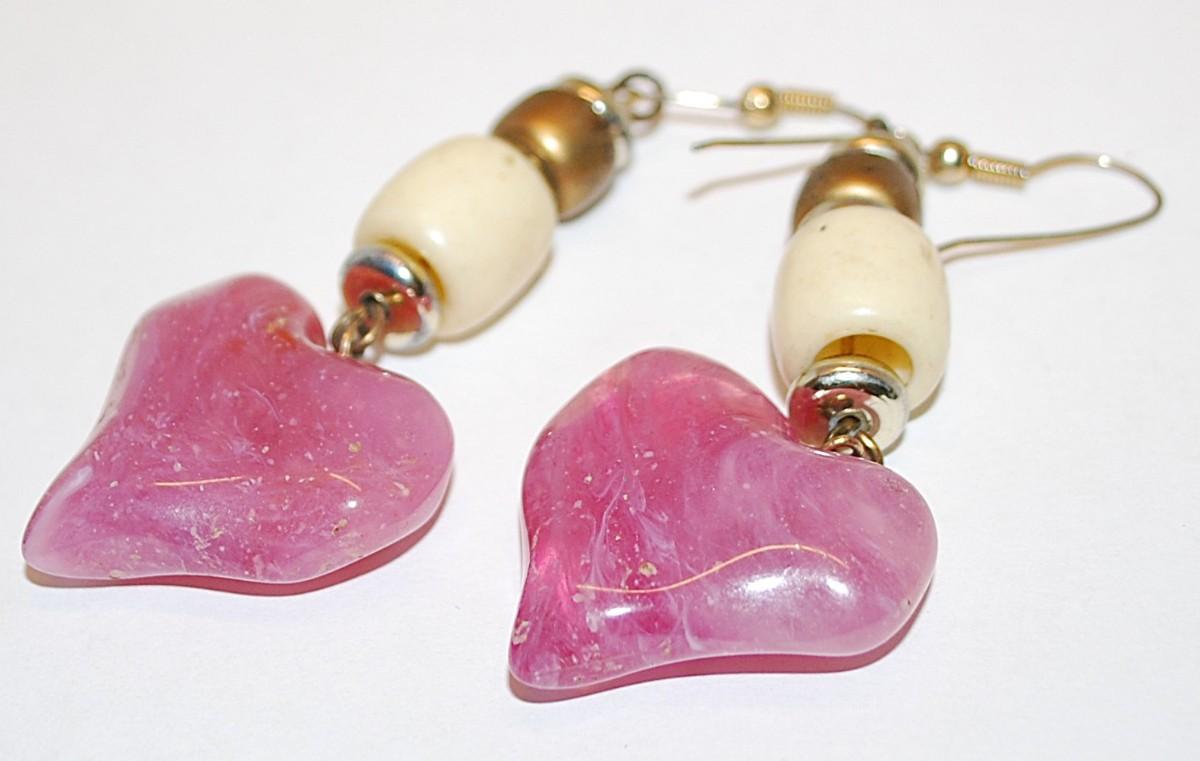 Vintage LARGE Pink HEARTS EARRINGS Set with White Barrel Accents and Wire Hook Clasp