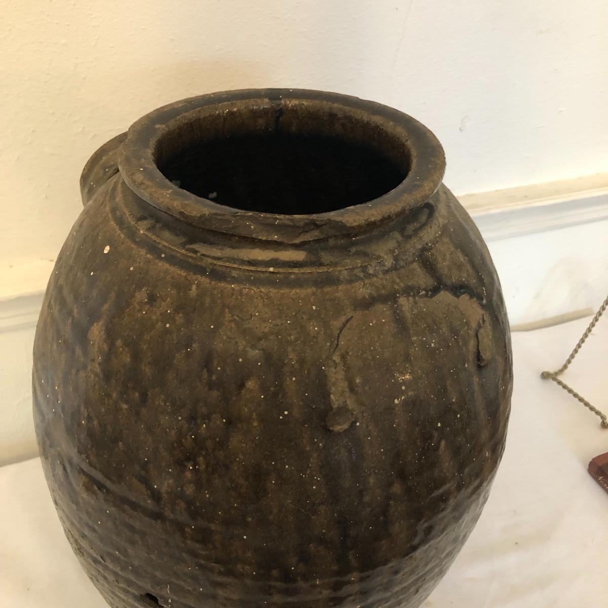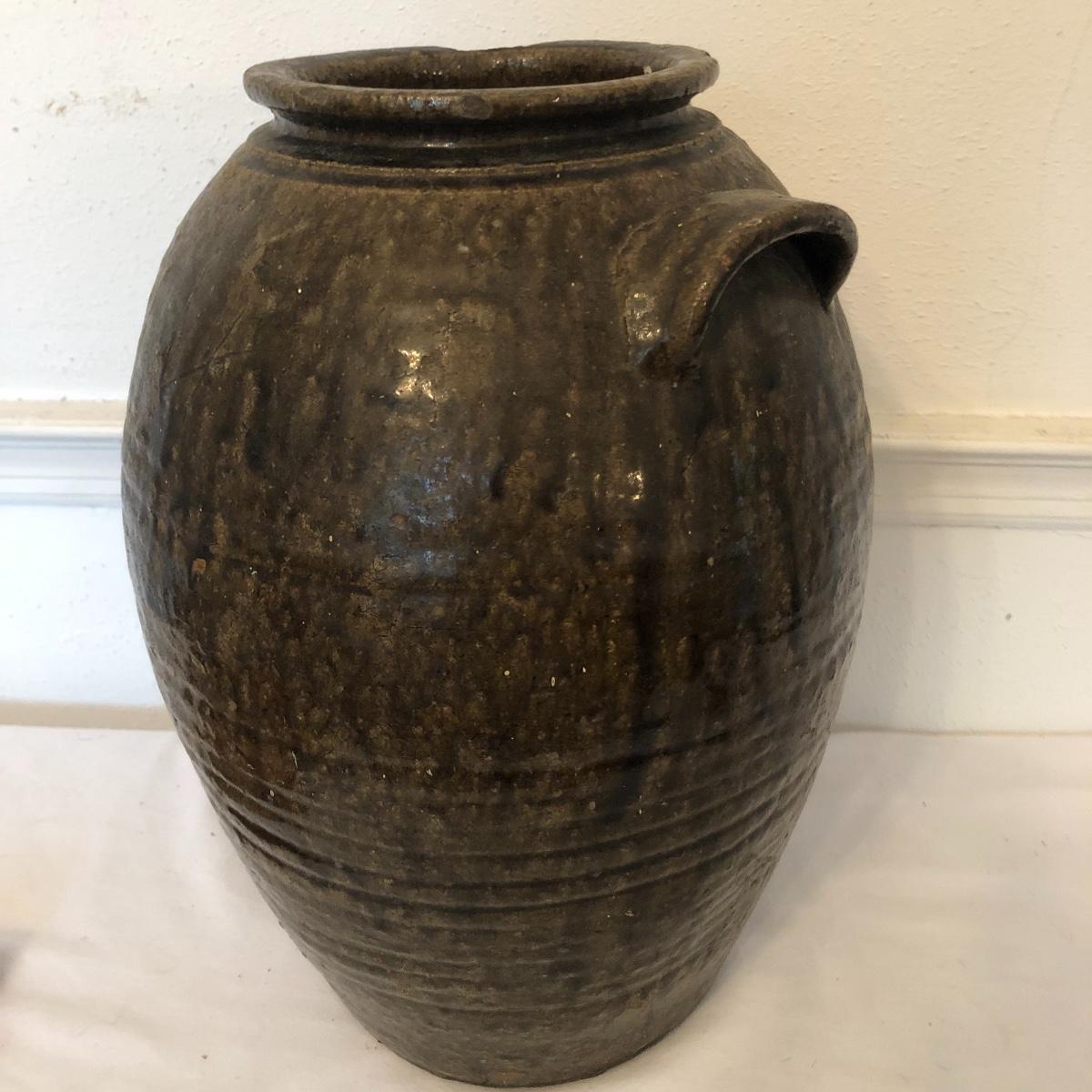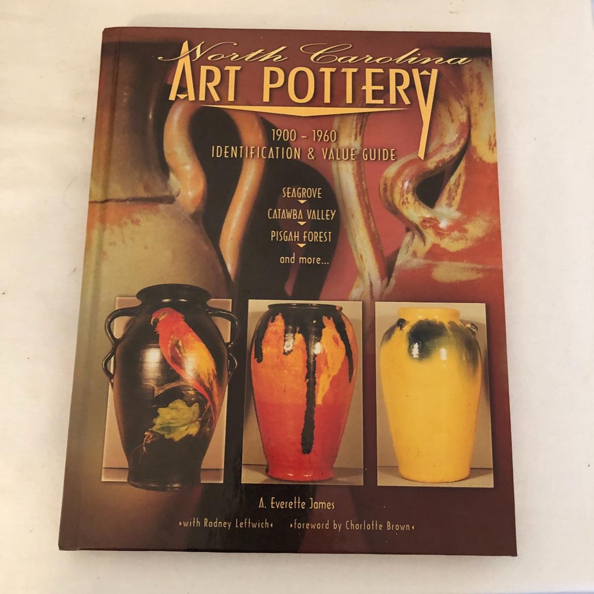 This large porch vase measures 6” diameter (Top) x 17” tall. It has some wear and tear including a small hole, see images. Also included is an NC Art Pottery book.