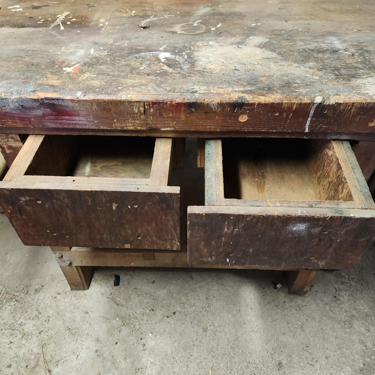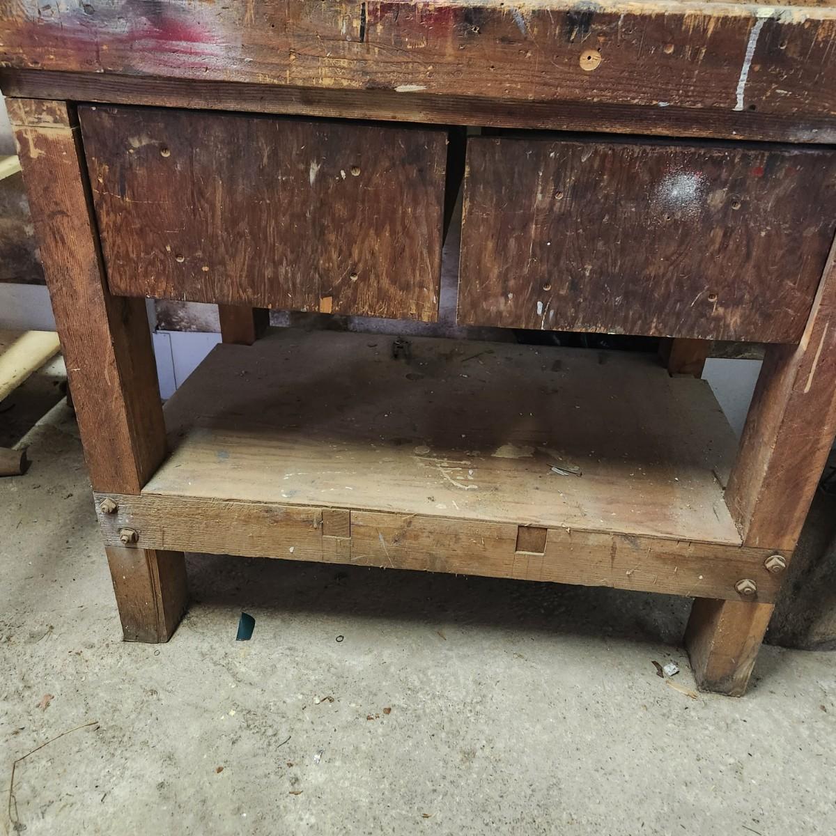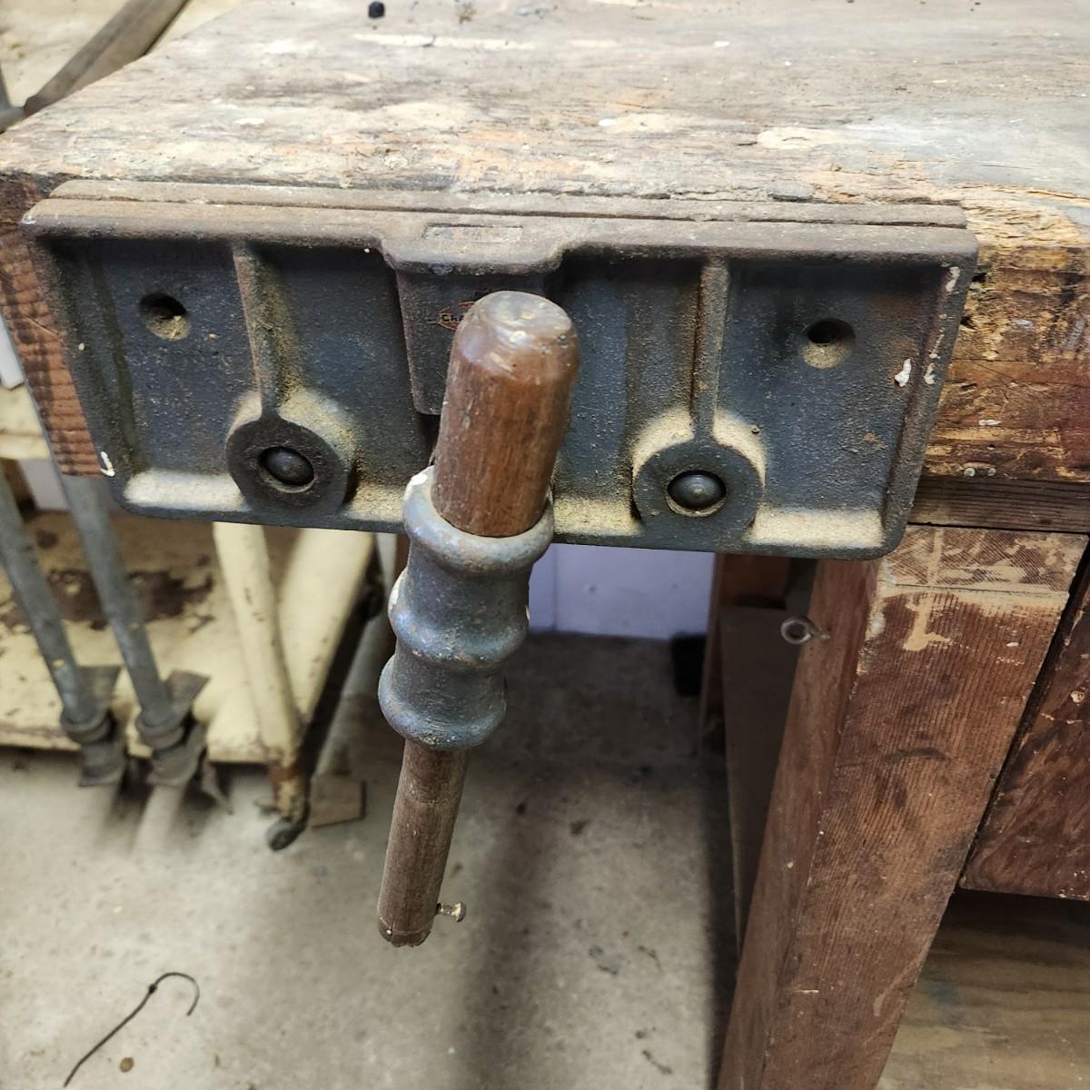 Vintage Large Workshop Wood Beach w 2 Bench Vises