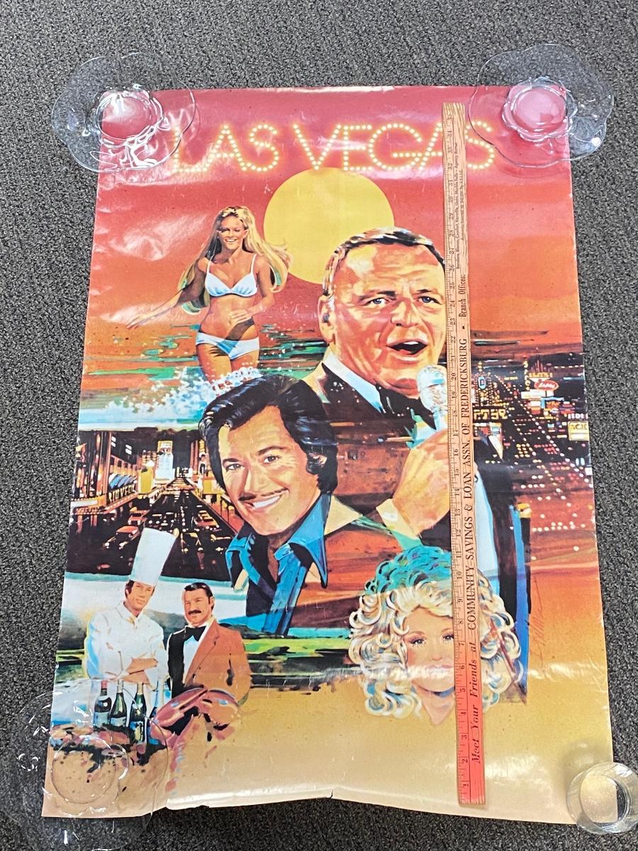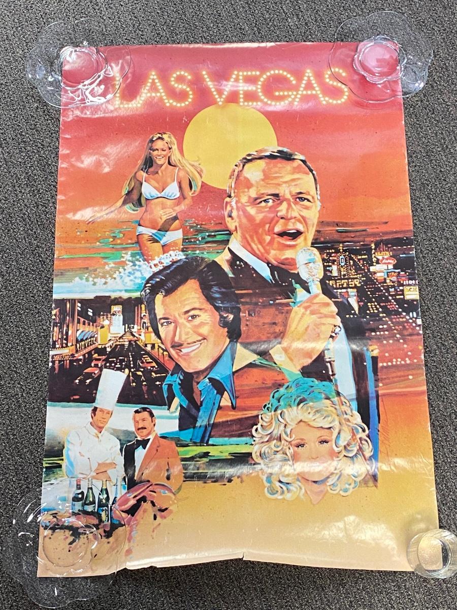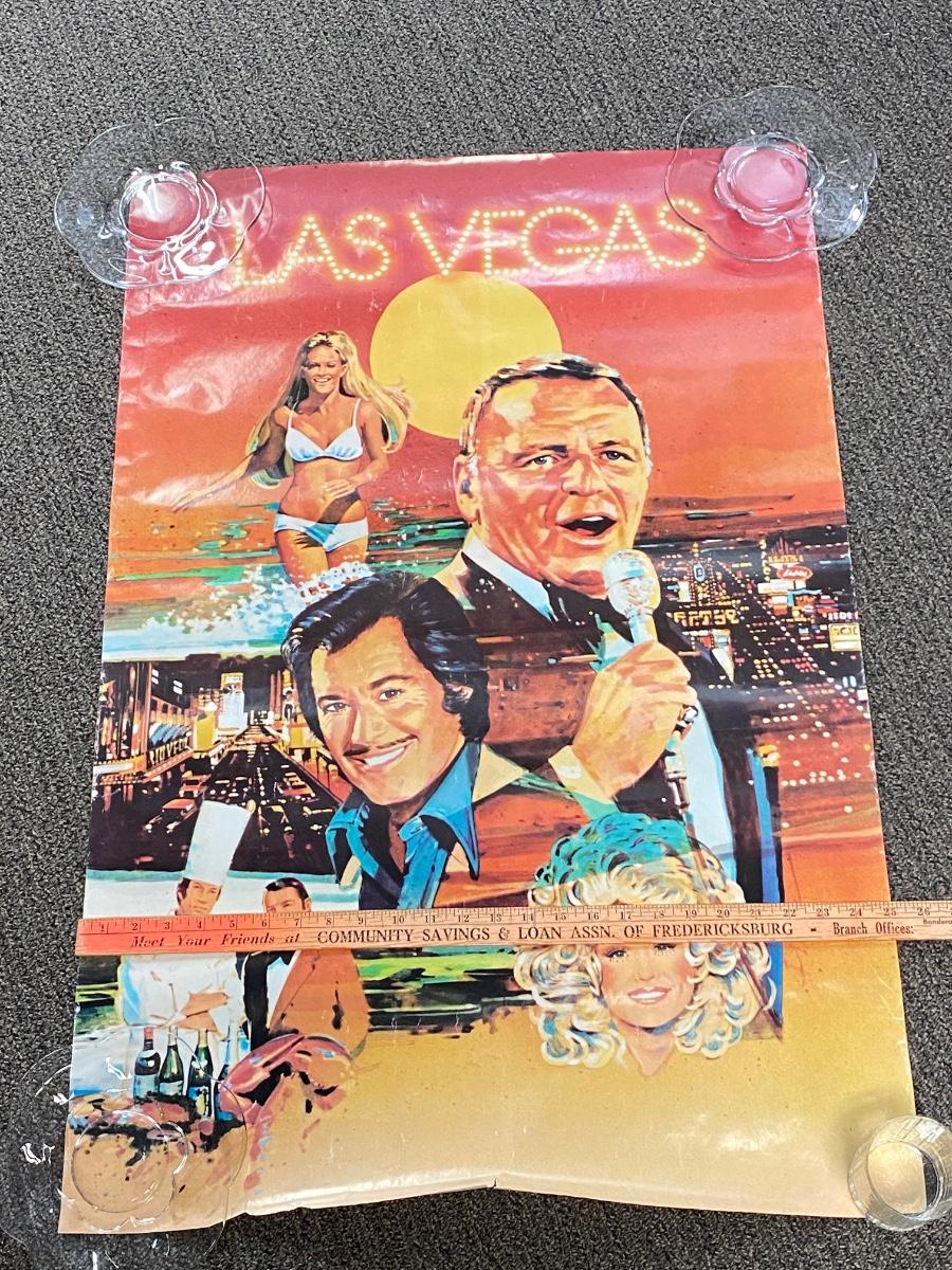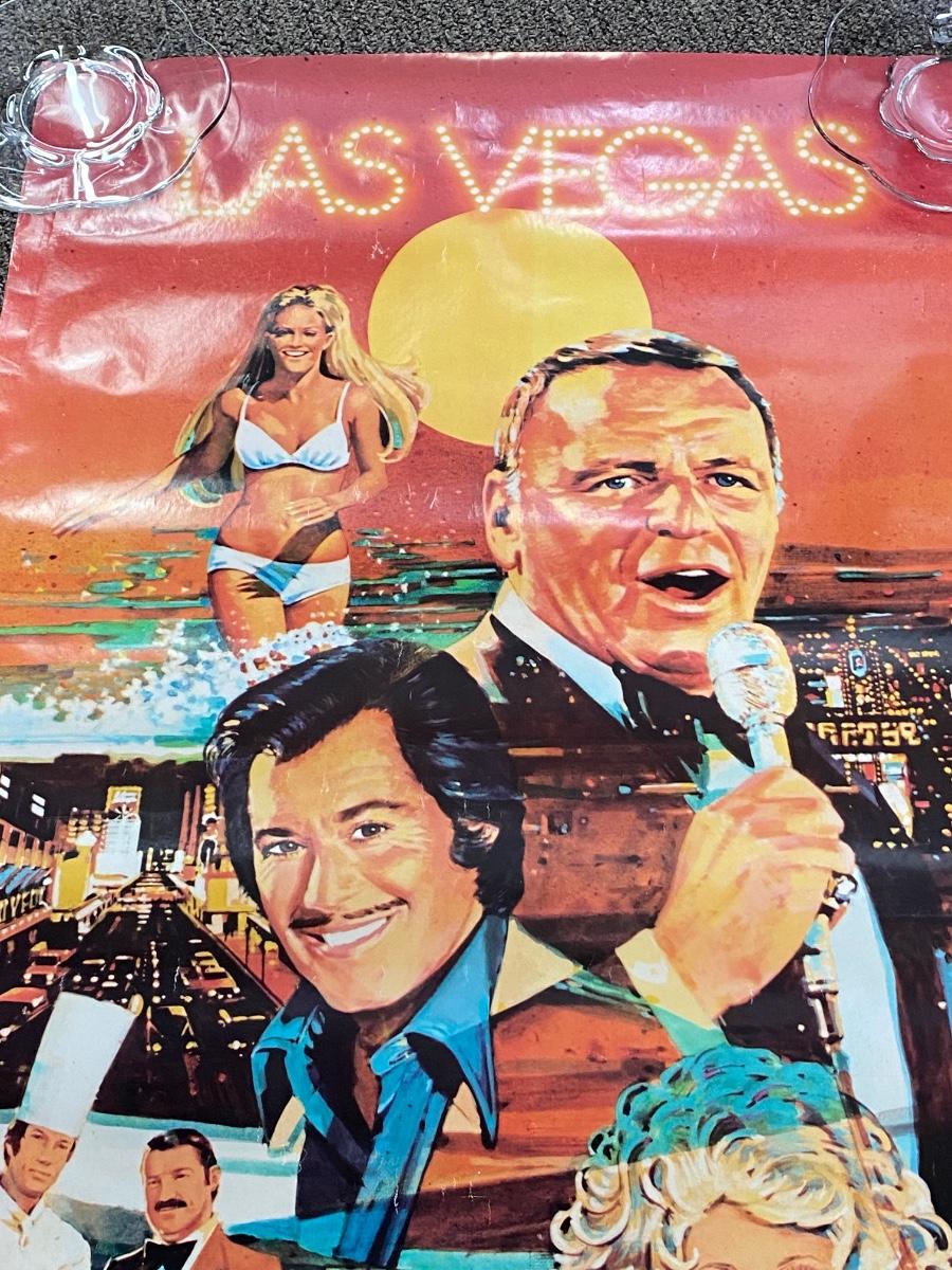 Vintage 1980s Las Vegas Tourism Ad poster. Features Frank Sinatra, Wayne Newton, Dolly Parton and scenes of the strip. Has some wear, would be best if framed. About 40x27 size.