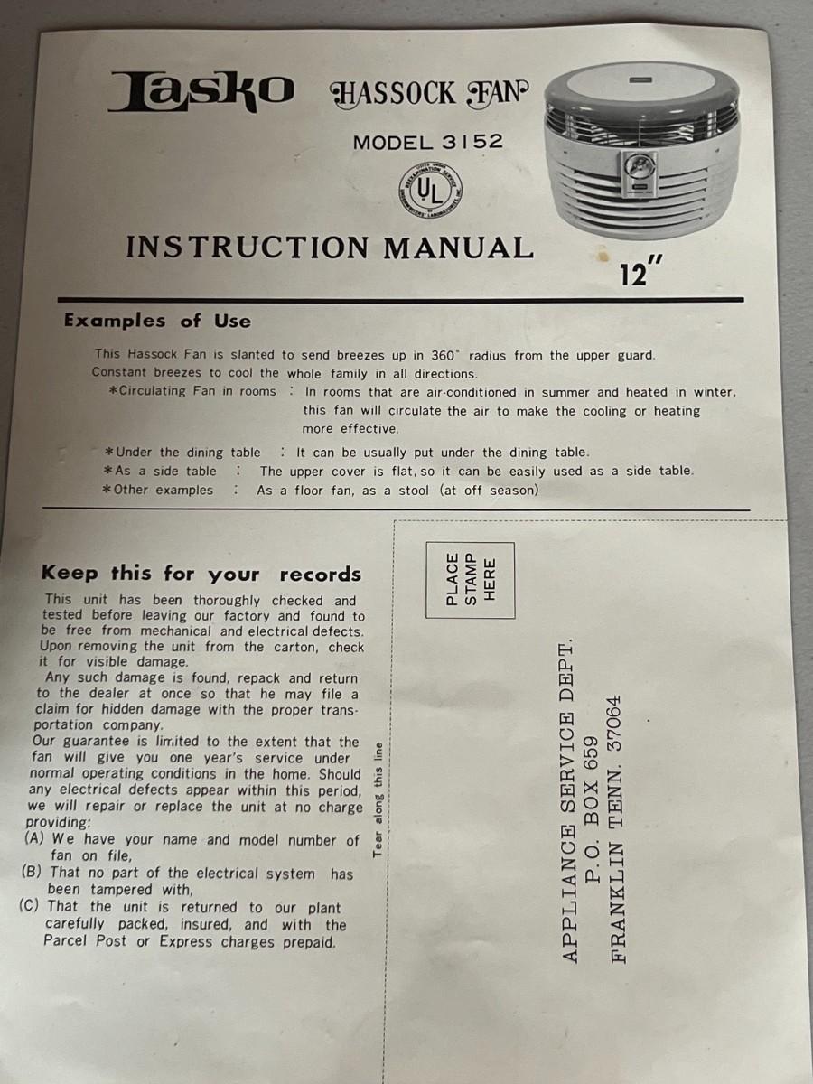 Vintage Lasko Deluxe Hassock Metal Fan- Model 3152
