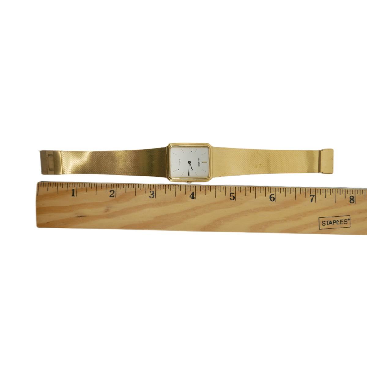 Vintage men's thin gold toned watch by Lassale Japan 7750-5470R. Slight scratching and wear, no major issues found. Non-operational, will require a new battery. Band is approximately L 7.5" x W 0.6" at smallest area. Face measures approximately 0.8" x 1". Weighs 1.3 oz.