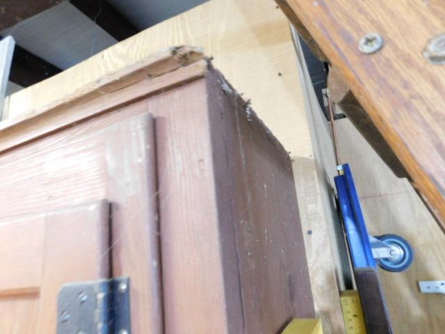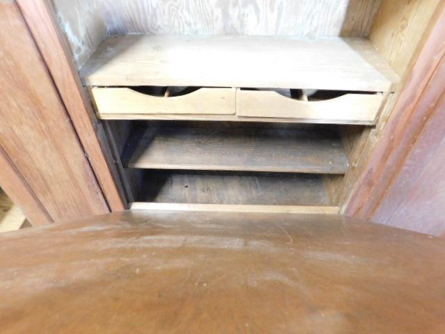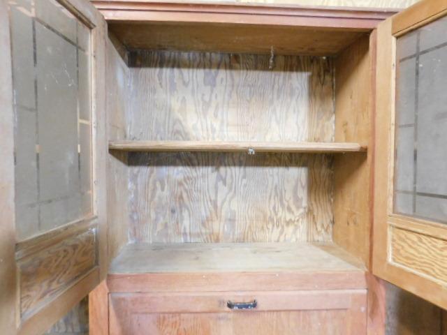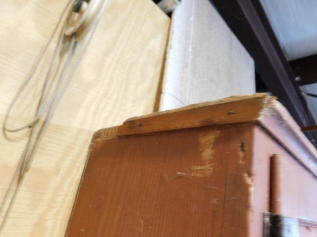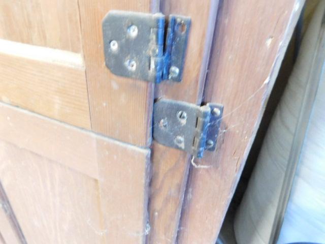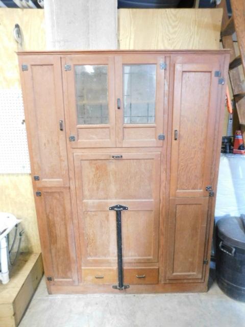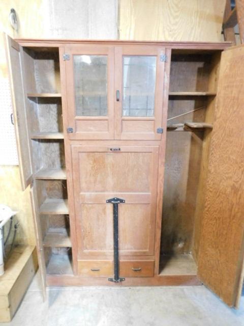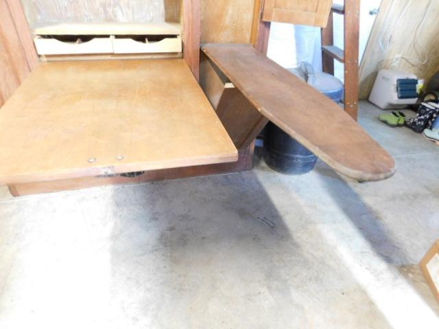 Vintage Laundry Cabinet Includes Drop Down Folding Table, Ironing Board, Clothes Line Reel, and Mop Closet . One piece. Please bring help to remove. Item is attached to wall with nails. Bring tools to remove safely from premises.
