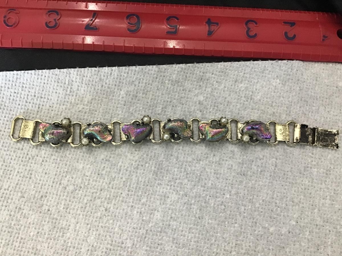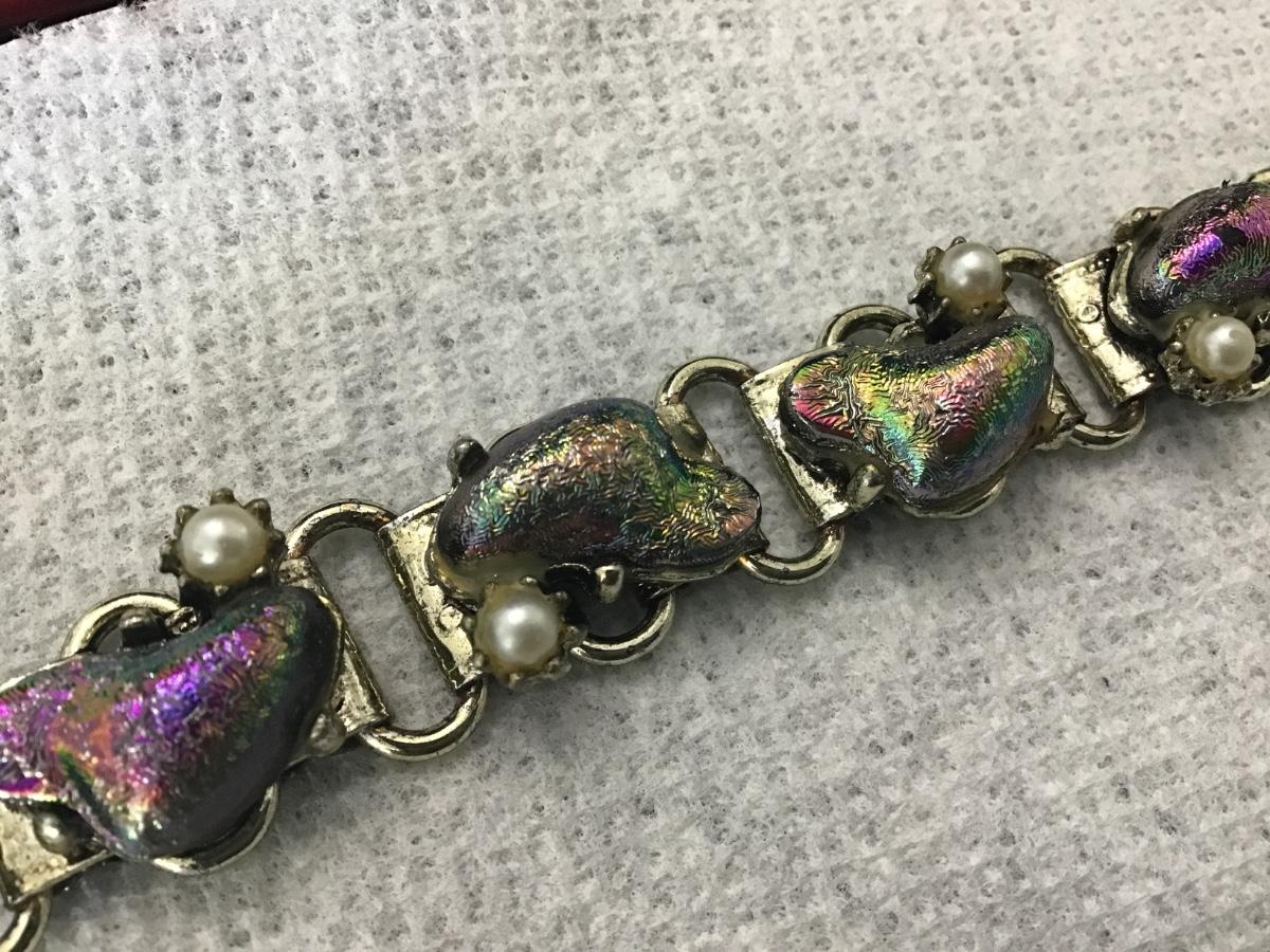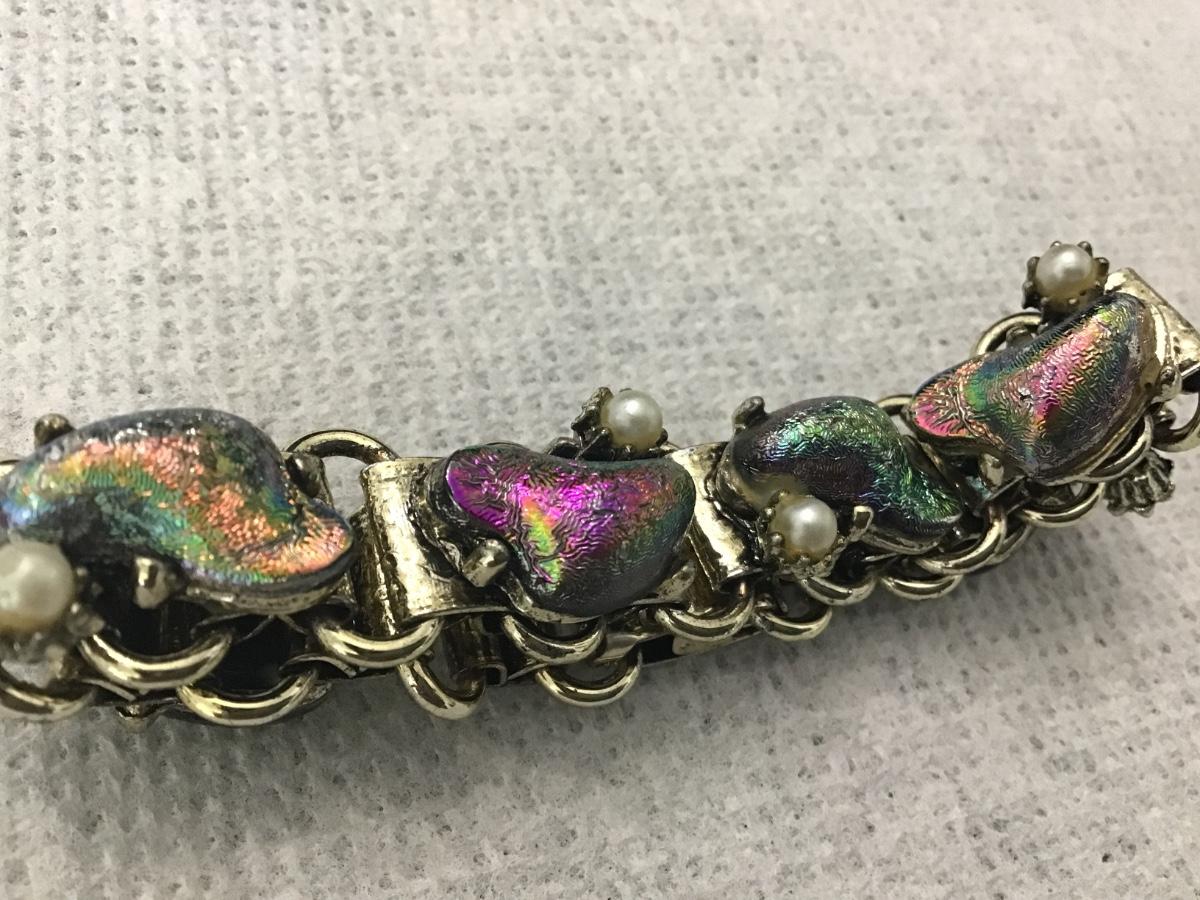 Vintage Lava Art Glass Rock Iridescent Glowin Glass Faux Pearl Bracelet