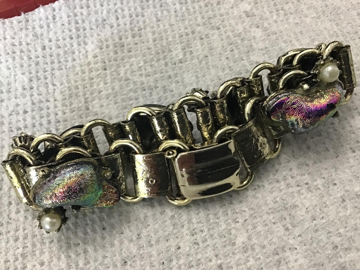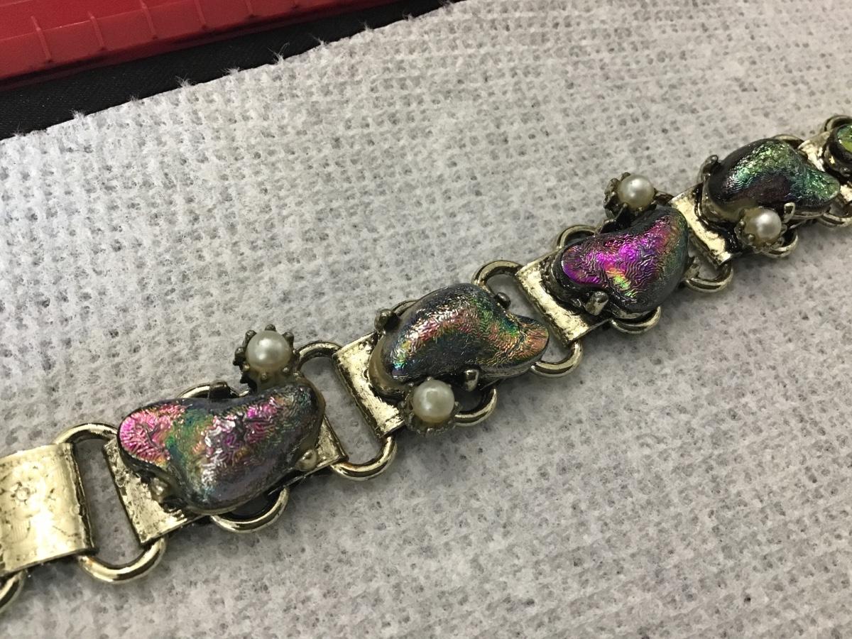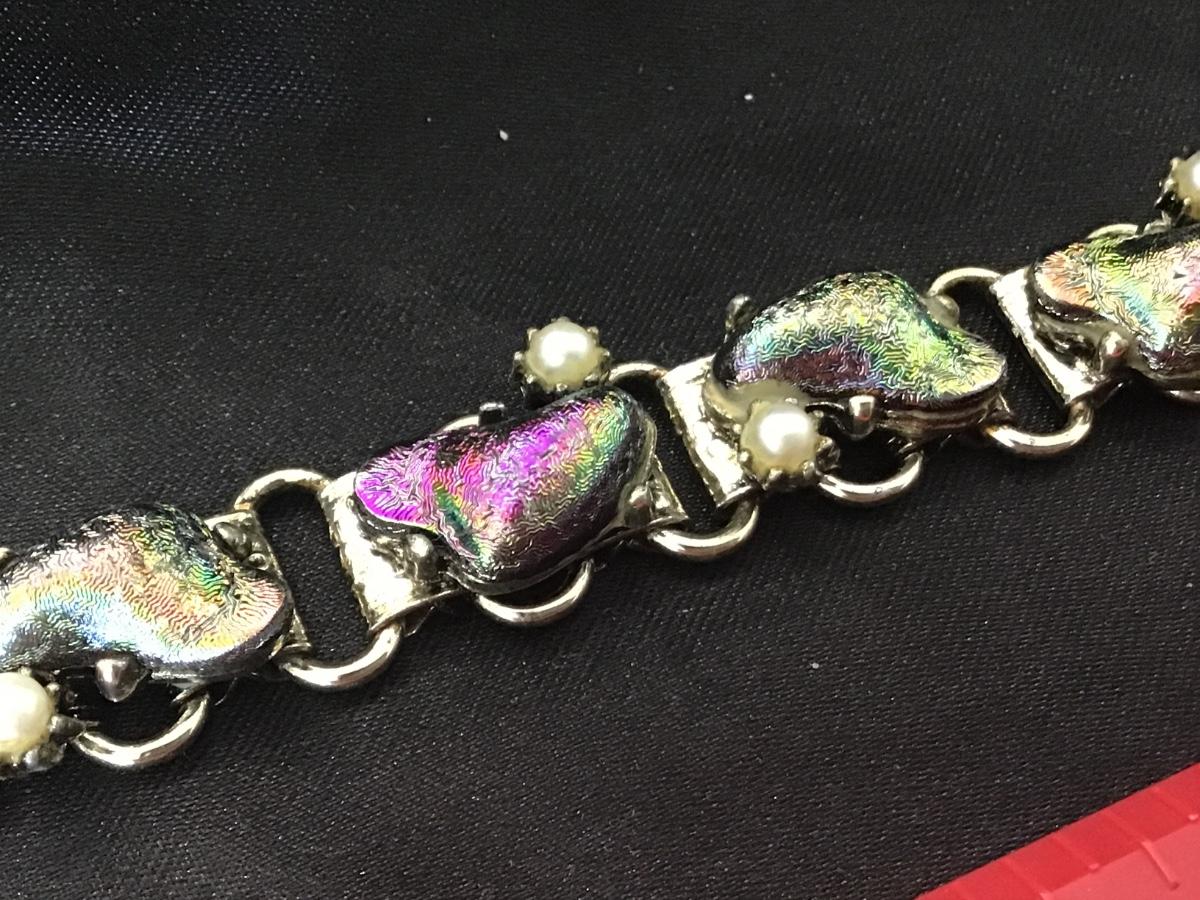 Vintage Lava Art Glass Rock Iridescent Glowin Glass Faux Pearl Bracelet
