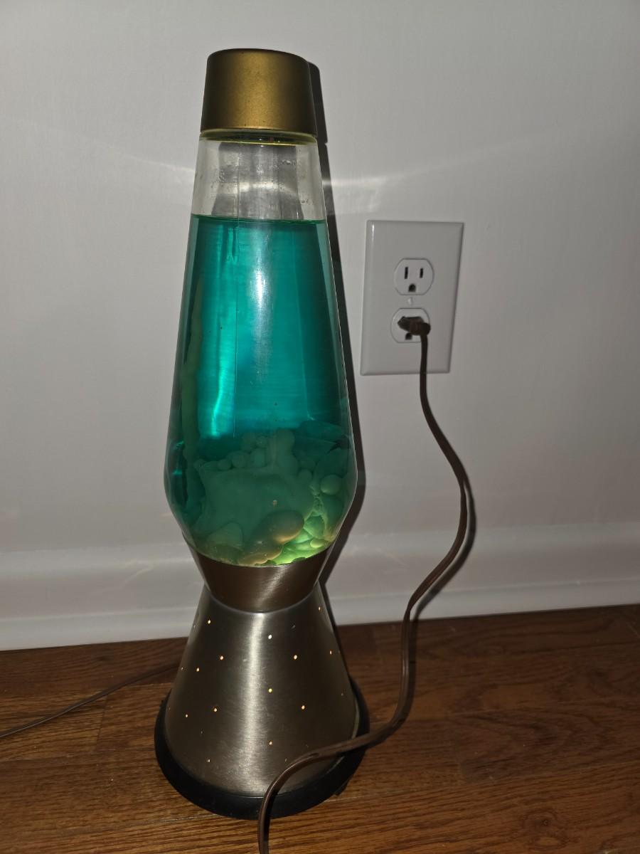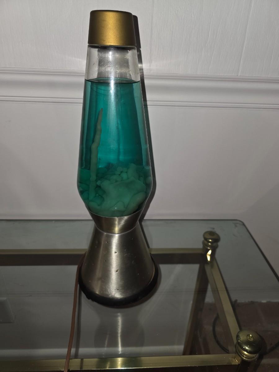 This one still lights up. It is ready to be added to a groovy room at your house. It is 17 inches tall.
