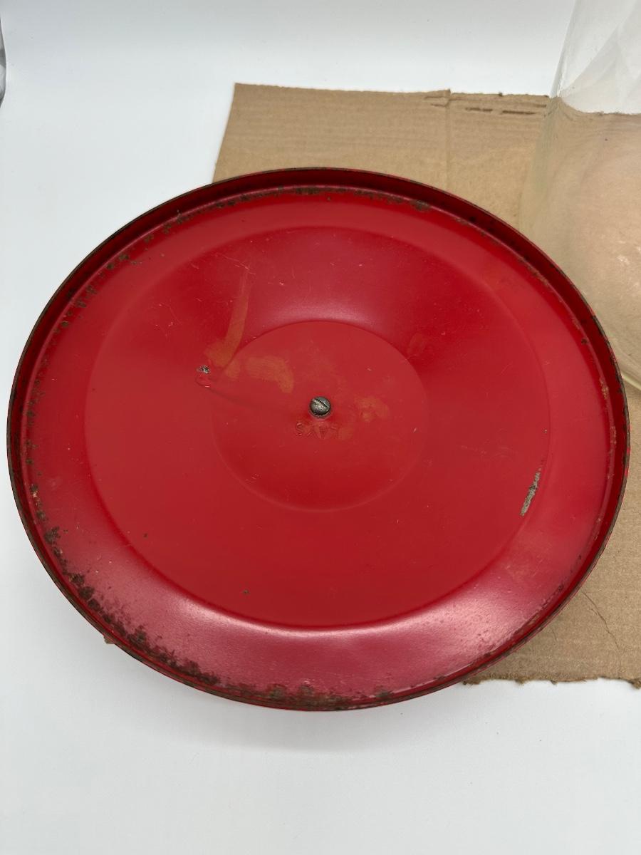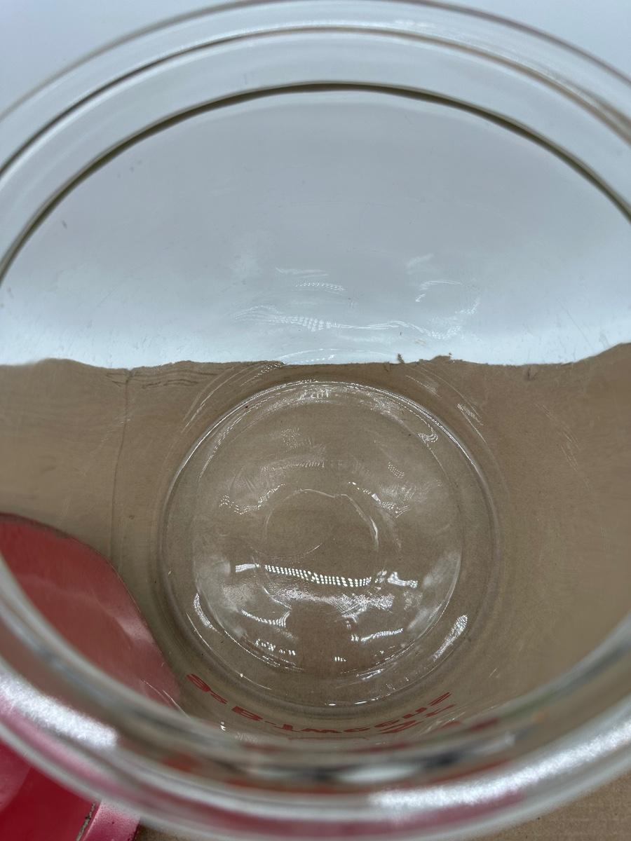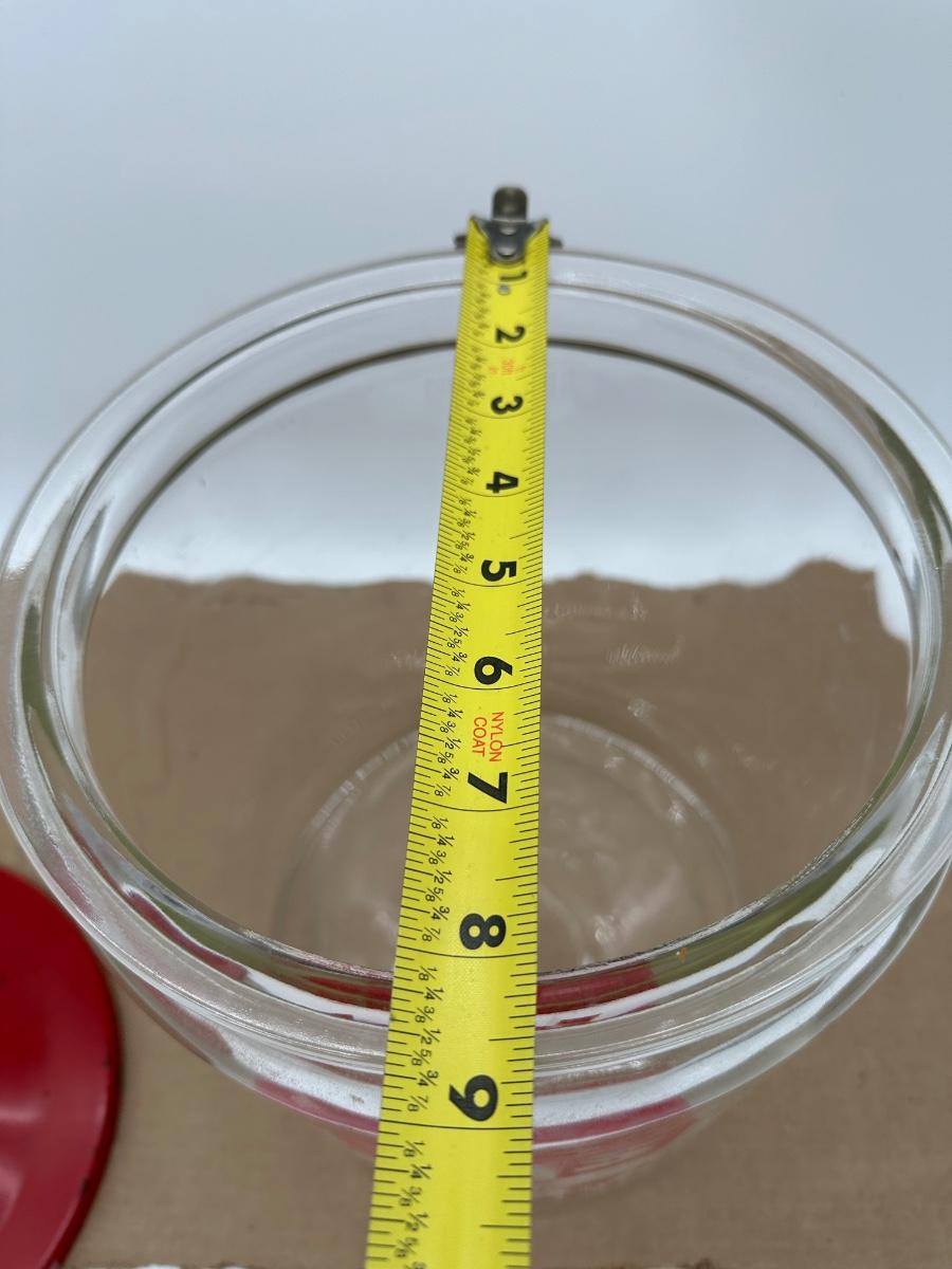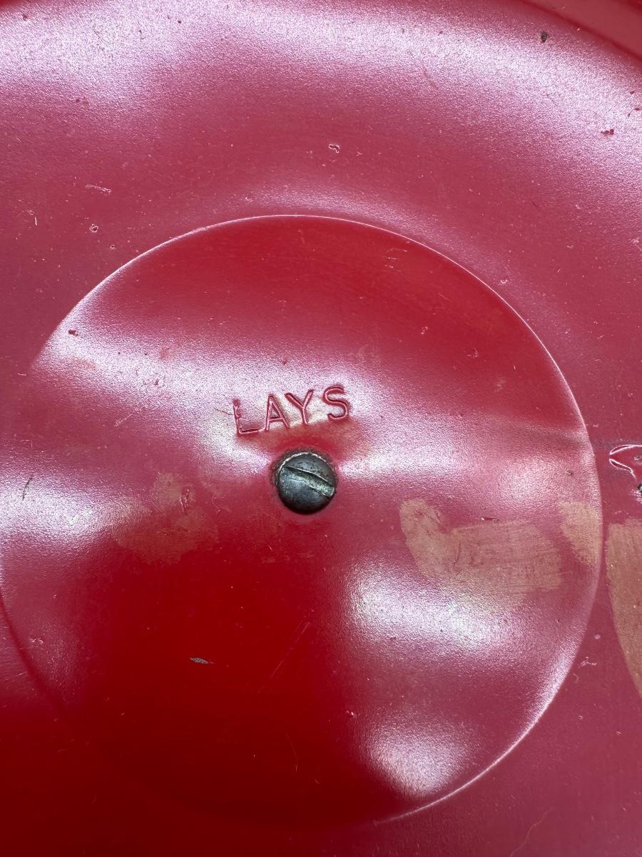 Original vintage Lay’s clear glass store display jar featuring red graphics and “5¢ B-Tweens” advertising. Includes original red metal lid with center knob. Classic mid-century chip shop / grocery counter piece. Displays well with honest age wear.