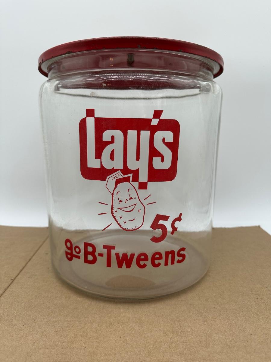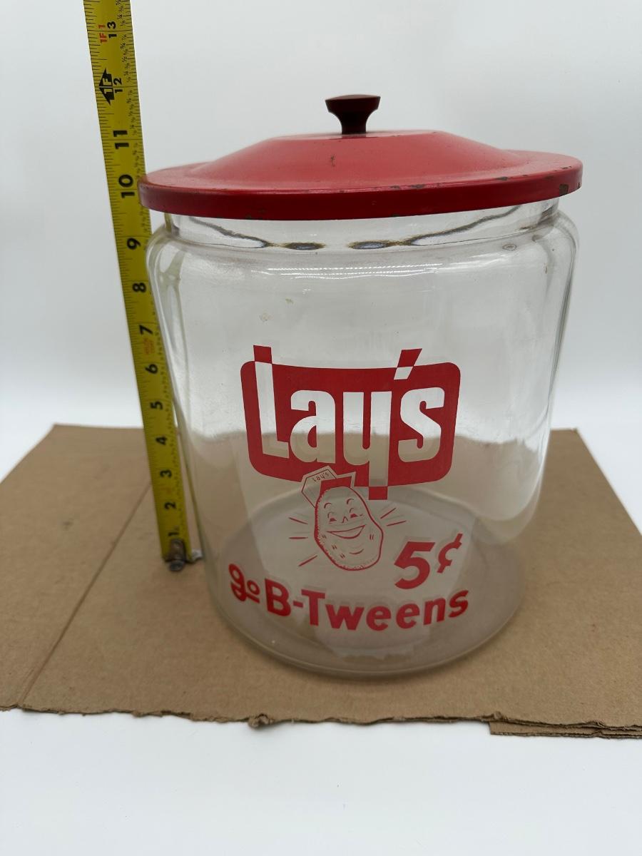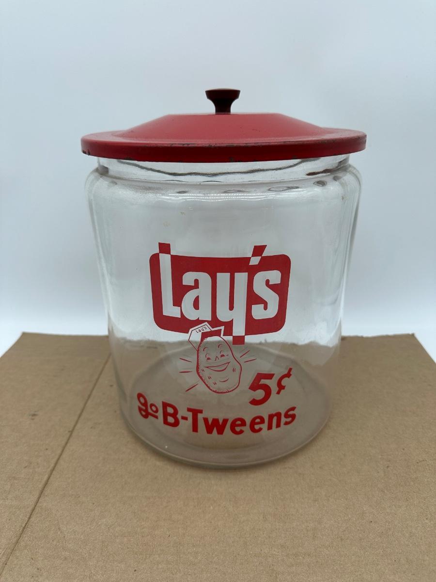 Vintage Lay’s Potato Chips Glass Store Jar w/ Lid – 5¢ B-Tweens Advertising