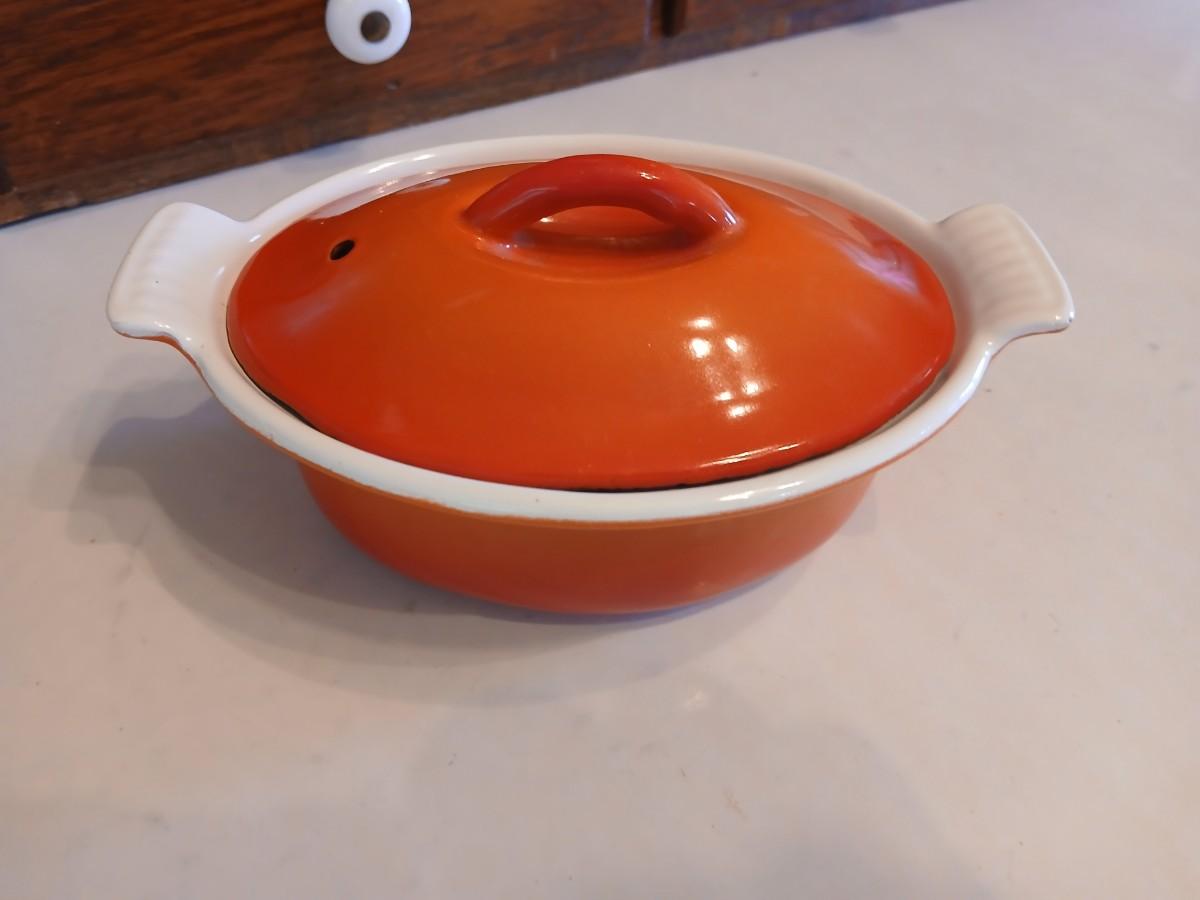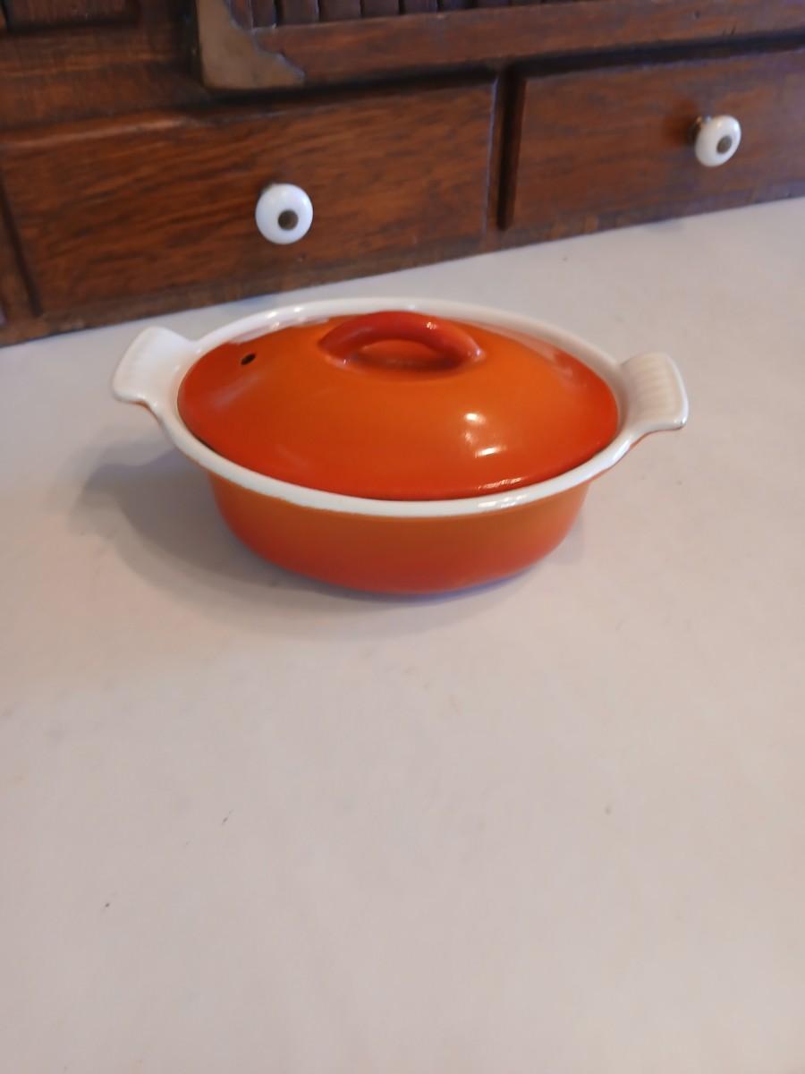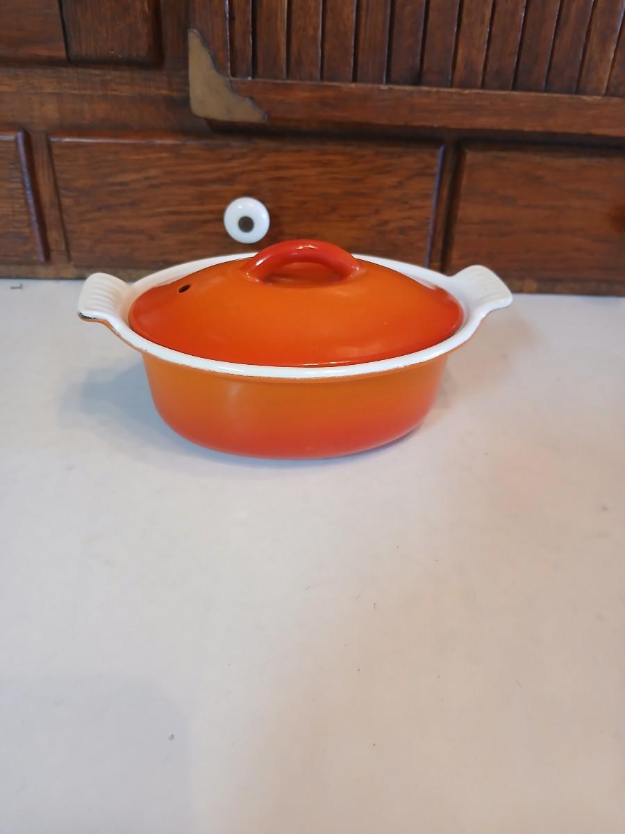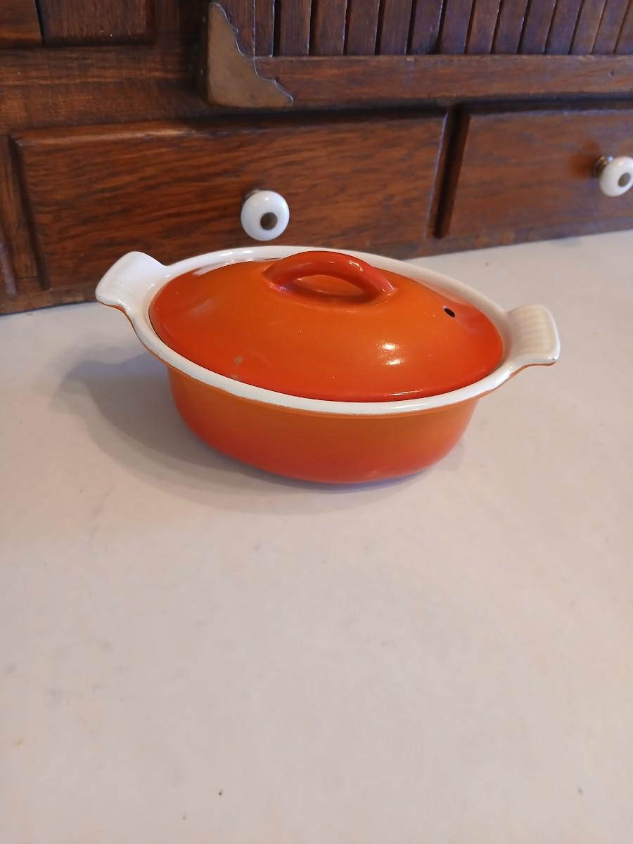 Vintage Le Creuset heritage-style Decoware mini dutch oven or casserole dish in the signature Flame Orange color.