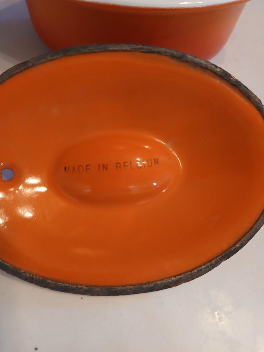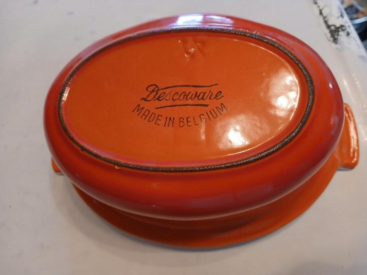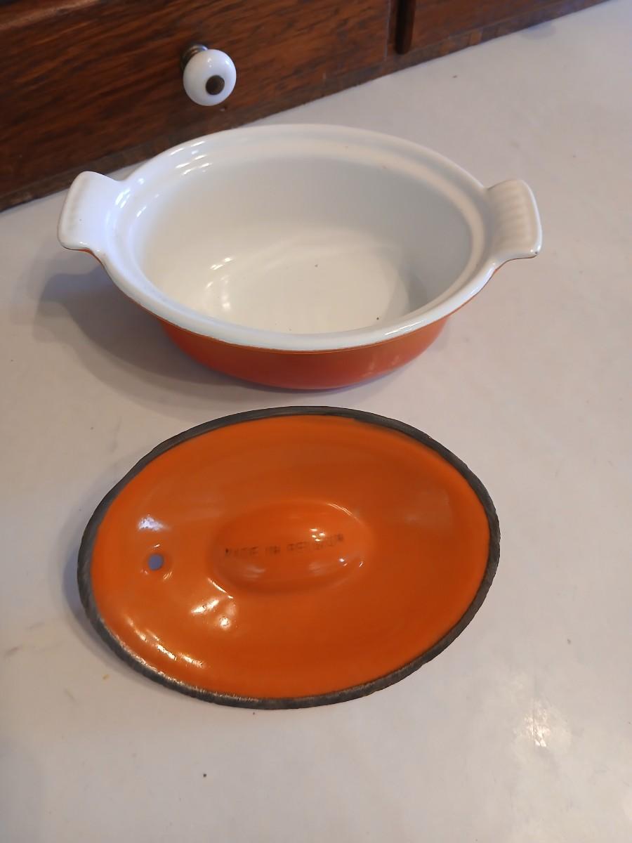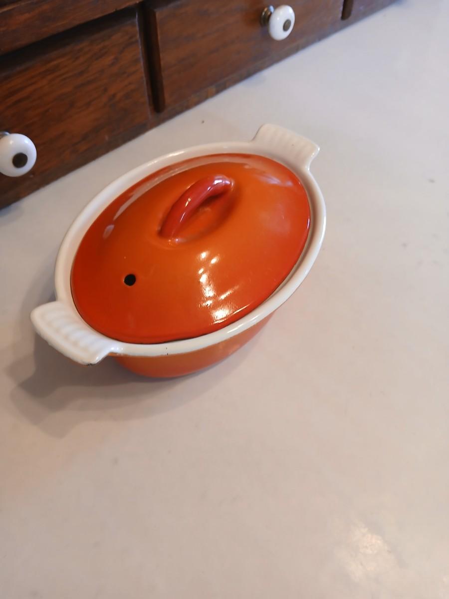 Vintage Le Creuset heritage-style Decoware mini dutch oven or casserole dish in the signature Flame Orange color.