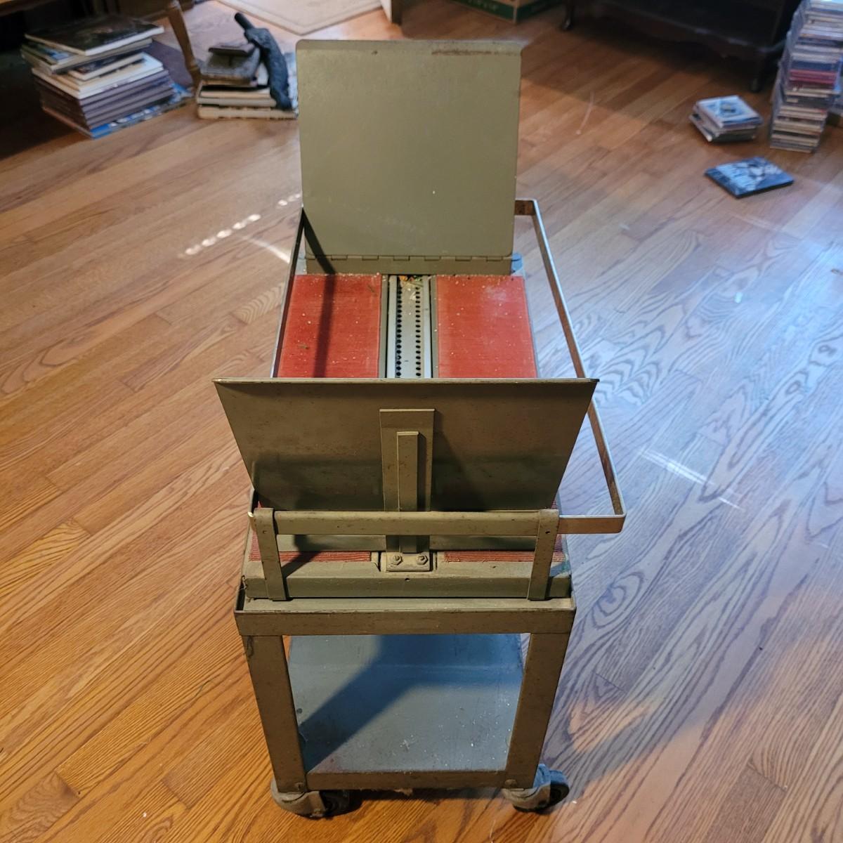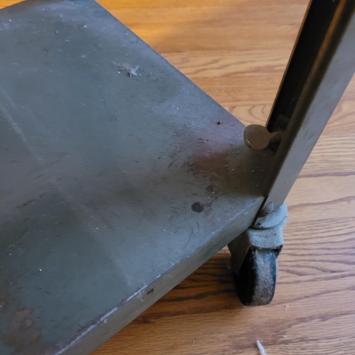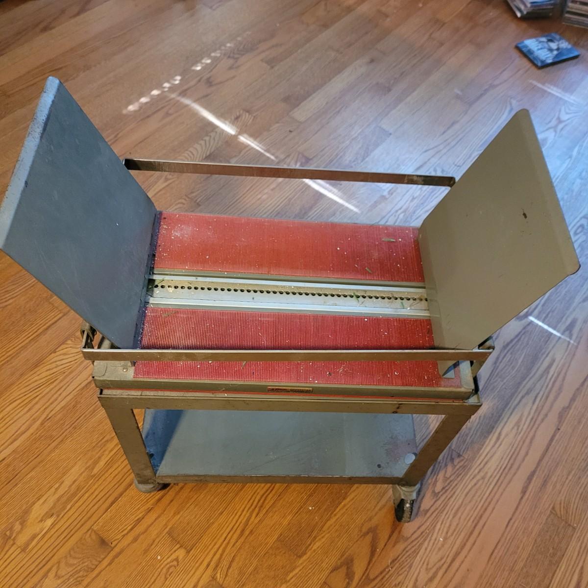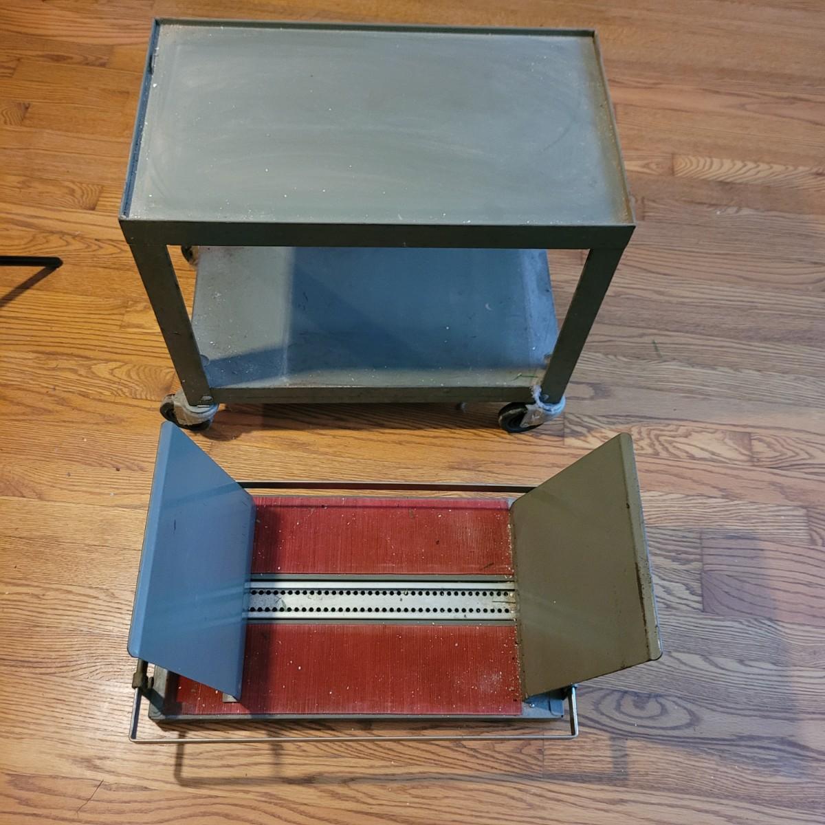 Vintage Le Febure metal vinyl record holder with one adjustable side to hold records w/ a metal rolling cart. Other side has two positions of either back leaning or forward leaning. Holder not attached to cart. Wheels on cart move easily. Good condition, with some scratches and dust accumulation. Cart measures 20.5"L x11.5"D x23"H (at railings). Holder pieces measure 10"L x10.5"H. Local pickup only.