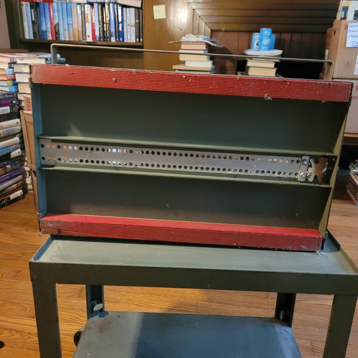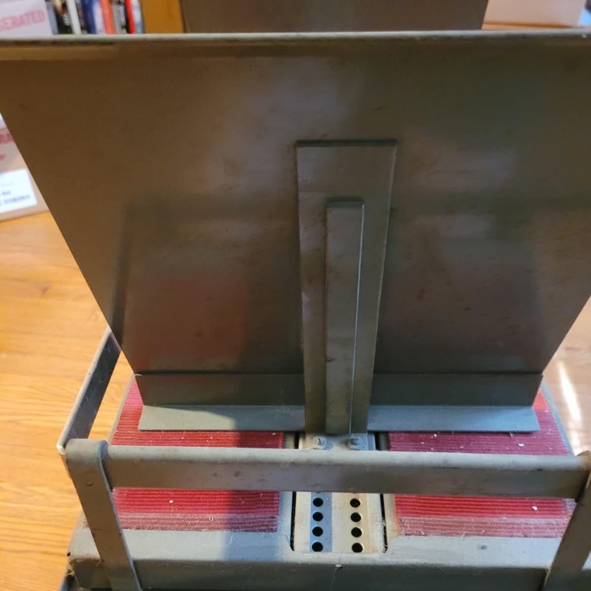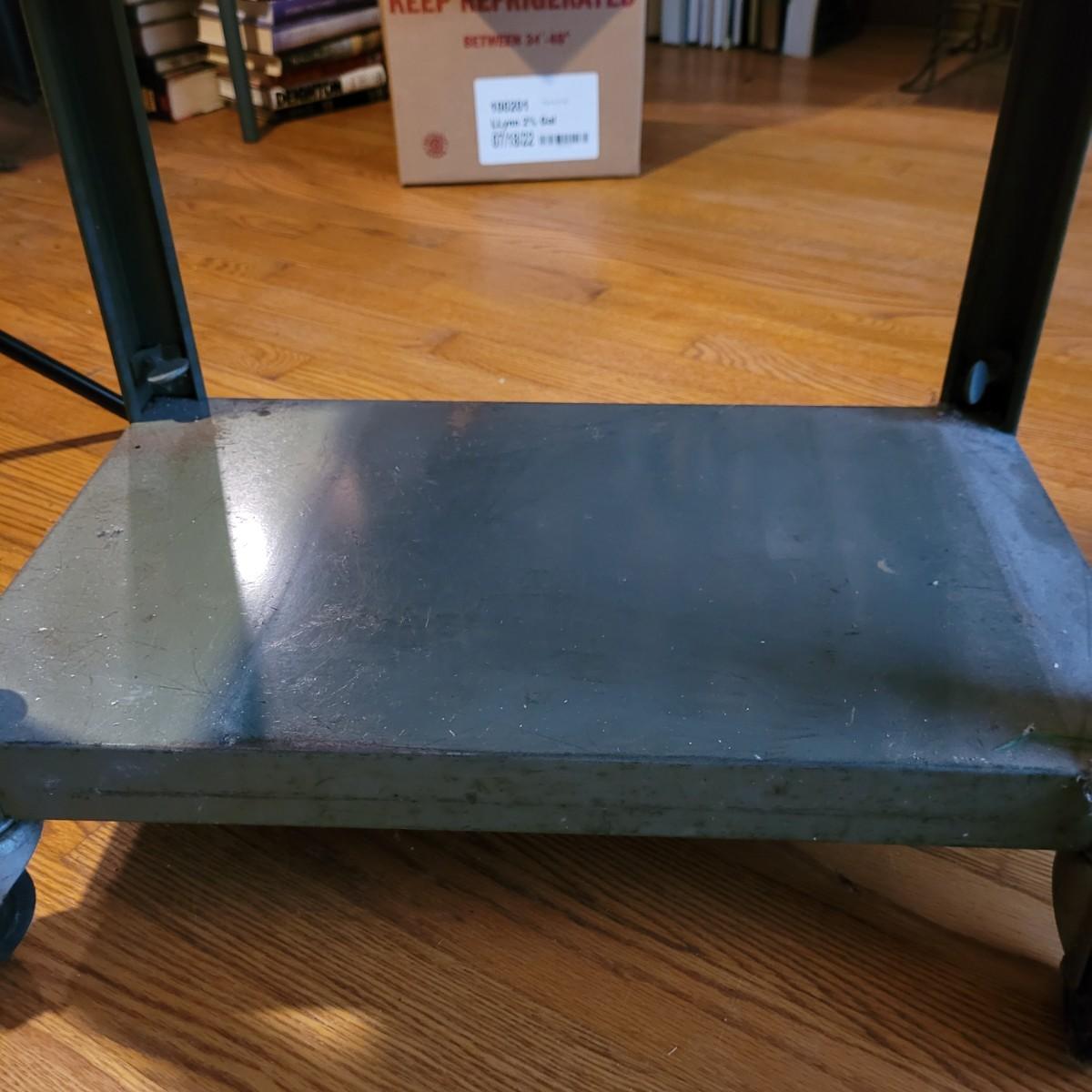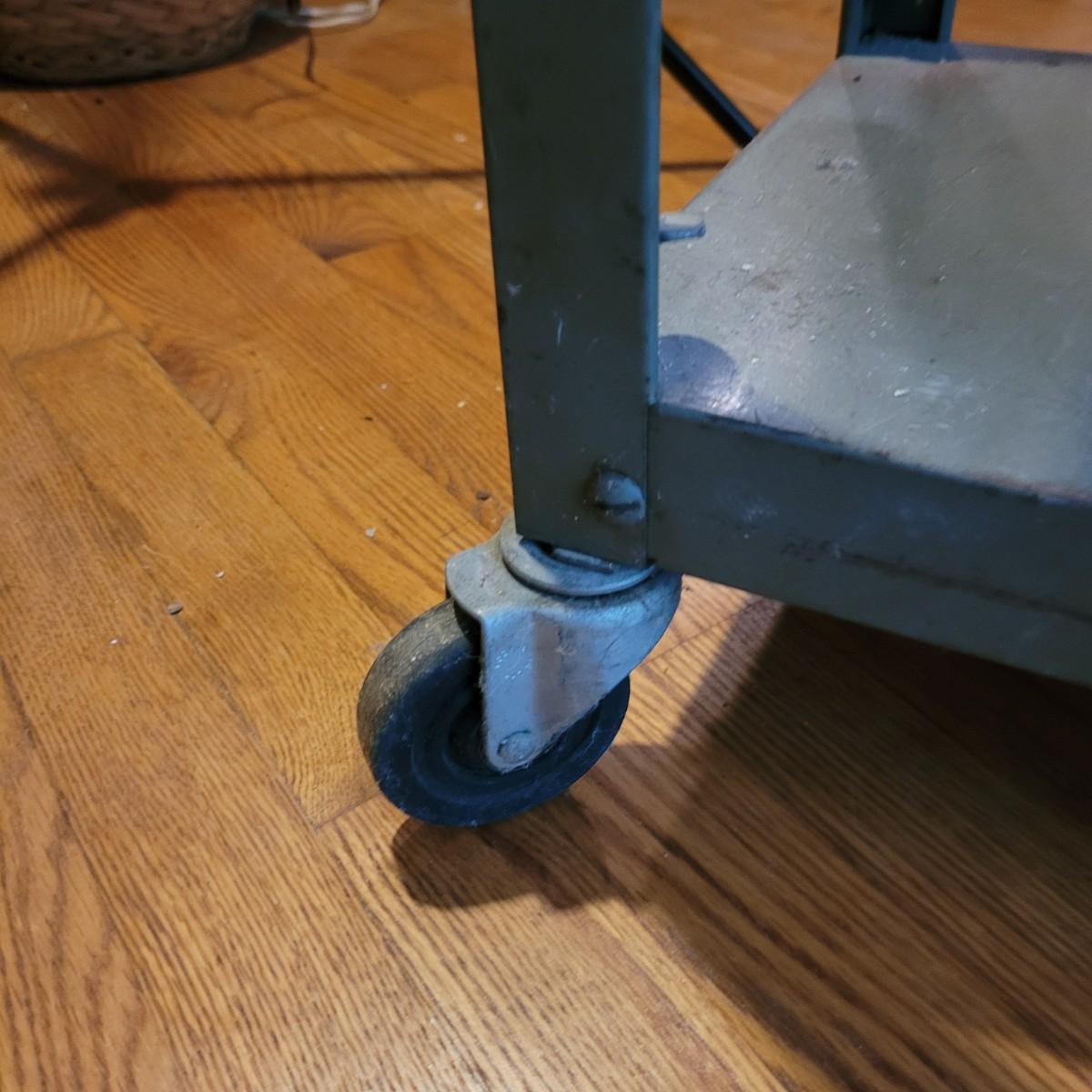 Vintage Le Febure metal vinyl record holder with one adjustable side to hold records w/ a metal rolling cart. Other side has two positions of either back leaning or forward leaning. Holder not attached to cart. Wheels on cart move easily. Good condition, with some scratches and dust accumulation. Cart measures 20.5"L x11.5"D x23"H (at railings). Holder pieces measure 10"L x10.5"H. Local pickup only.