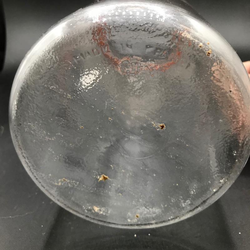 The glass portion is in fantastic shape. The rubber O-ring has become brittle from age and has some missing chunks. These are easily replaceable however. Stands 11.25” tall.