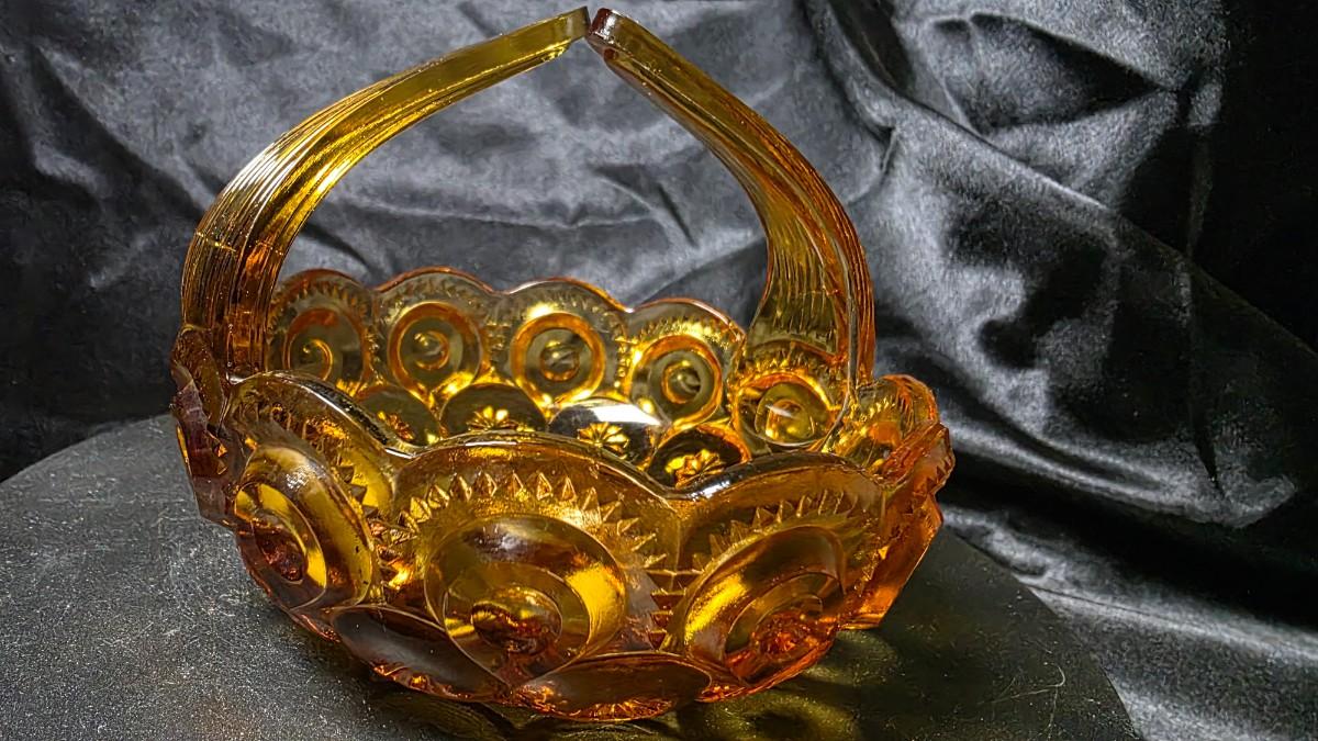 Light passing through the amber glass gives this basket a warm golden glow, emphasizing the crisp pattern detail and the starburst design pressed into the base. It is a classic example of L.E. Smith’s production from the 1960s–1970s era, a period celebrated by collectors for bold colors and distinctive pattern work. This piece remains unmarked, consistent with most authentic L.E. Smith production.
