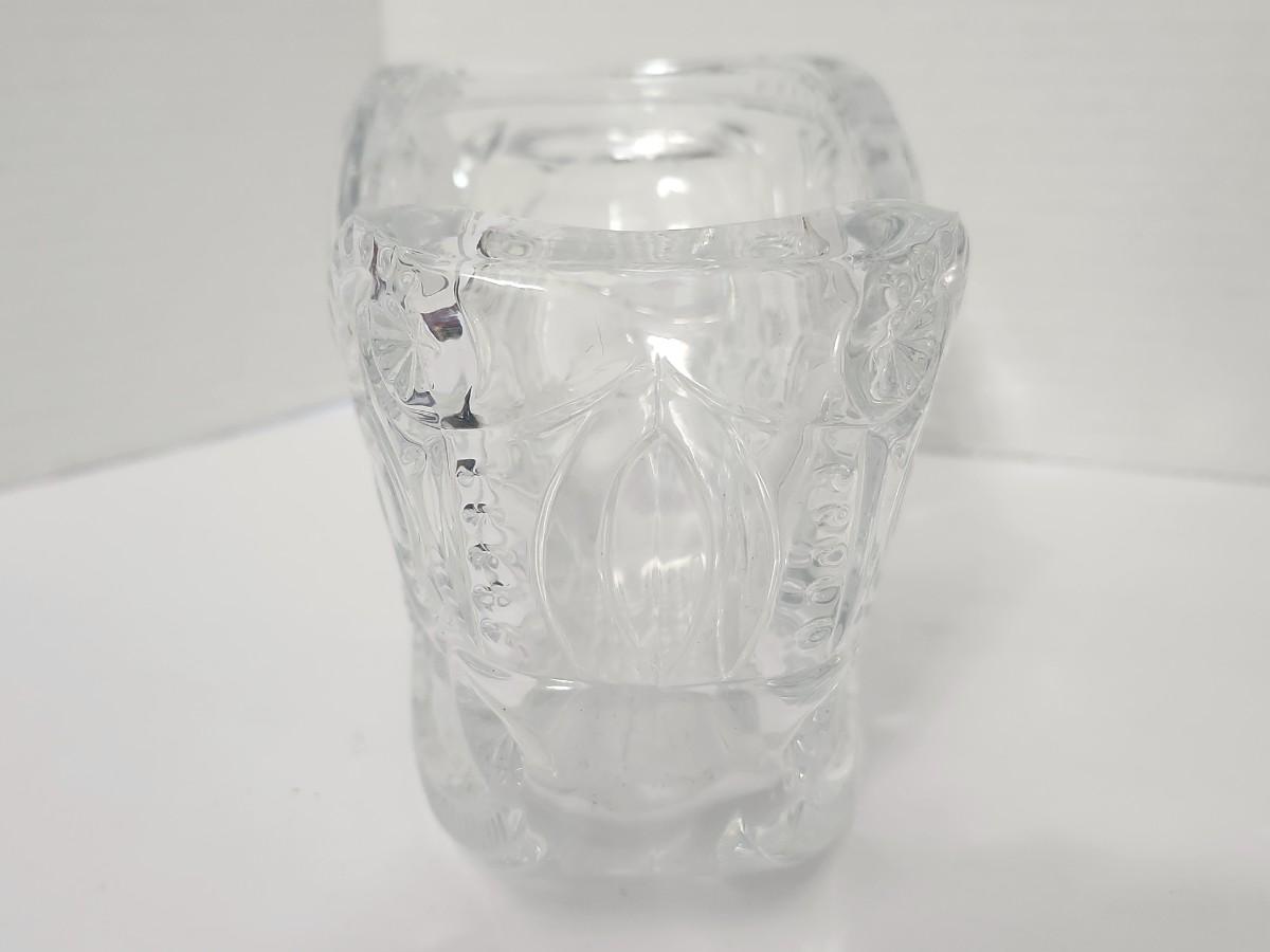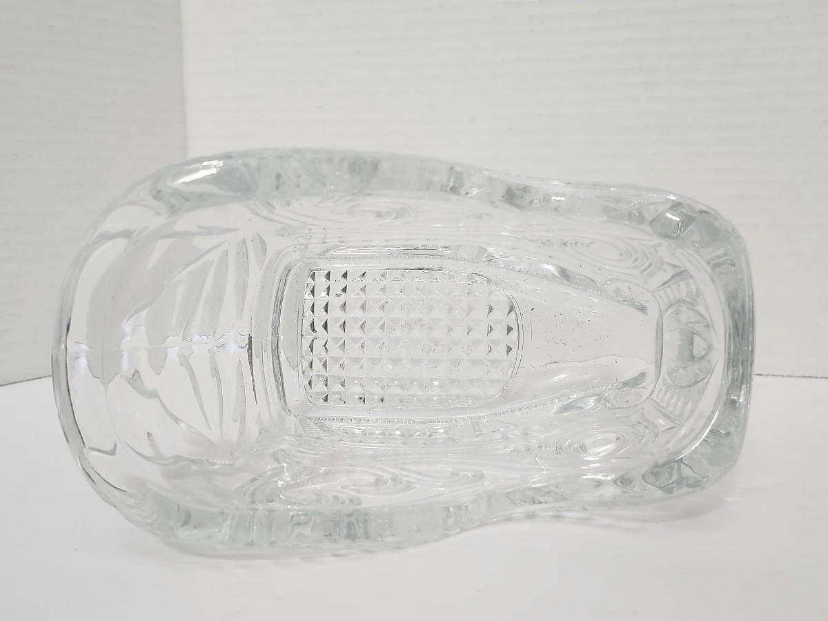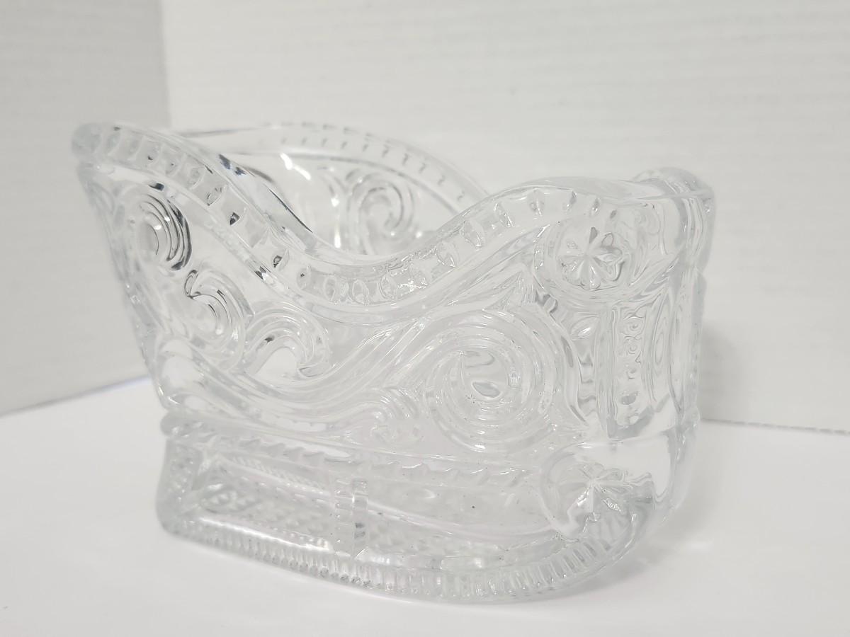 Decorative clear lead crystal sleigh dish featuring deeply cut scroll and swirl patterns with a sculptural sleigh form. Marked with original label indicating 24% lead crystal and made in the USA. Designed as a candy dish, nut bowl, or holiday display piece, commonly used during Christmas but suitable for year round decorative use. Comes with its original box, which shows handling wear from storage. Classic American crystal piece that displays well on a table, sideboard, or holiday setting. Suitable for collectors of vintage crystal, American made glass, or seasonal decor.