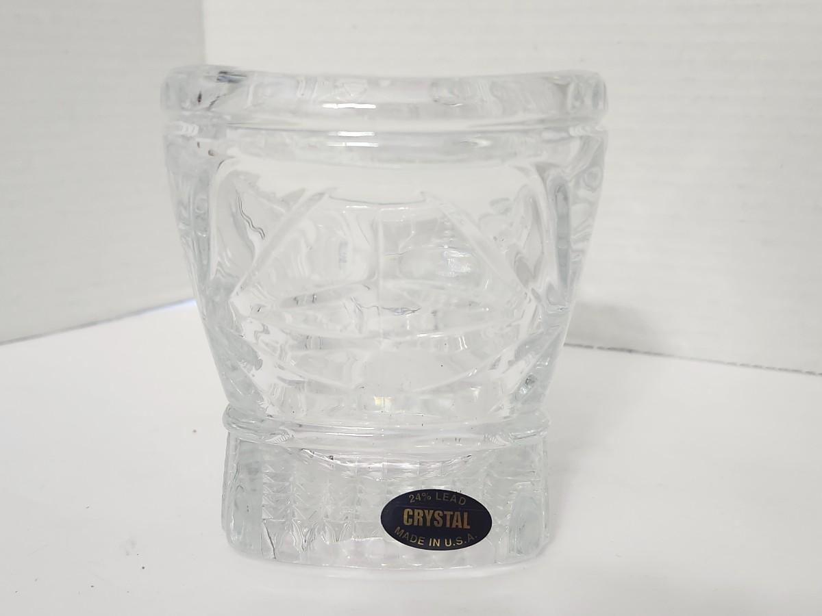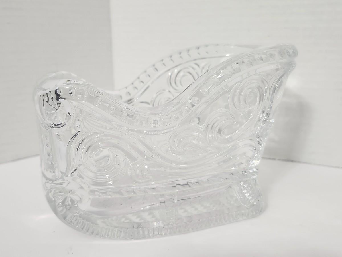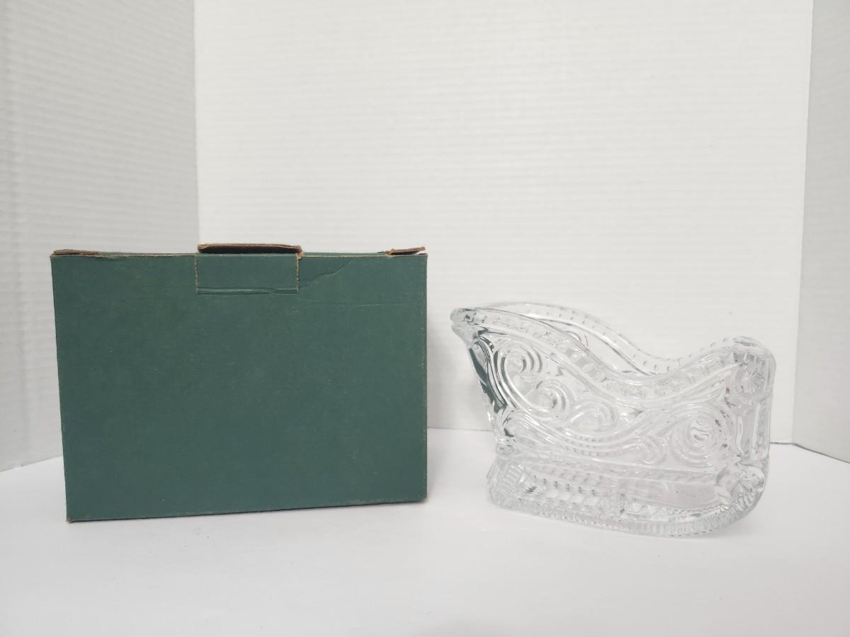 Decorative clear lead crystal sleigh dish featuring deeply cut scroll and swirl patterns with a sculptural sleigh form. Marked with original label indicating 24% lead crystal and made in the USA. Designed as a candy dish, nut bowl, or holiday display piece, commonly used during Christmas but suitable for year round decorative use. Comes with its original box, which shows handling wear from storage. Classic American crystal piece that displays well on a table, sideboard, or holiday setting. Suitable for collectors of vintage crystal, American made glass, or seasonal decor.