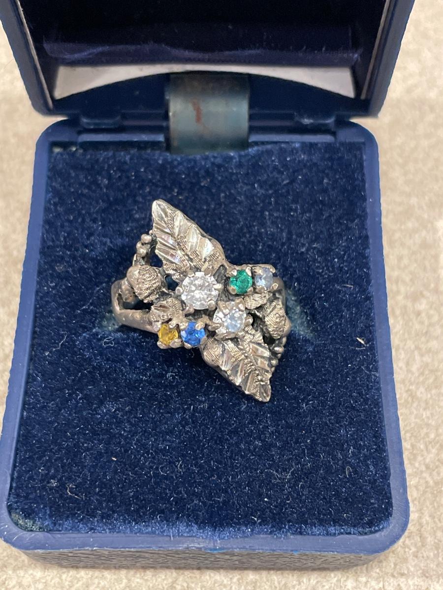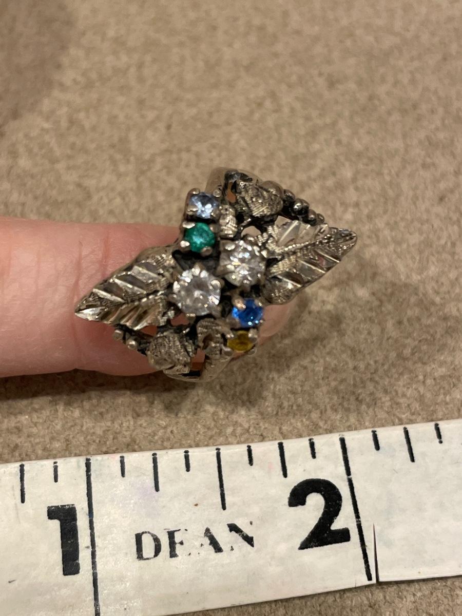 I cannot find stamp or markings on this ring. It looks to be sterling and the gems could be real but I can’t say for certain.
