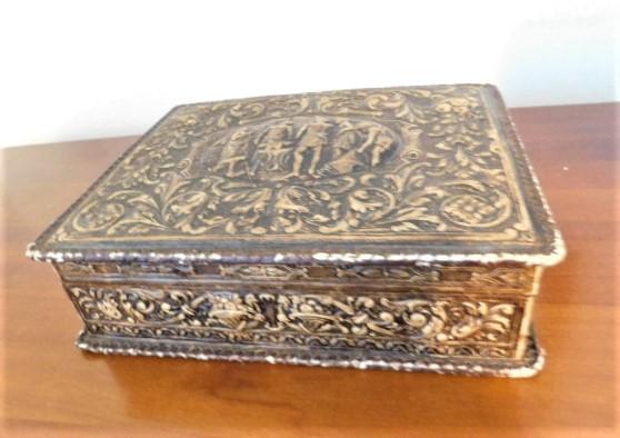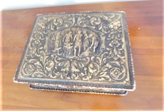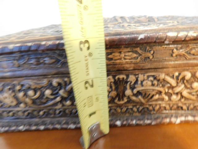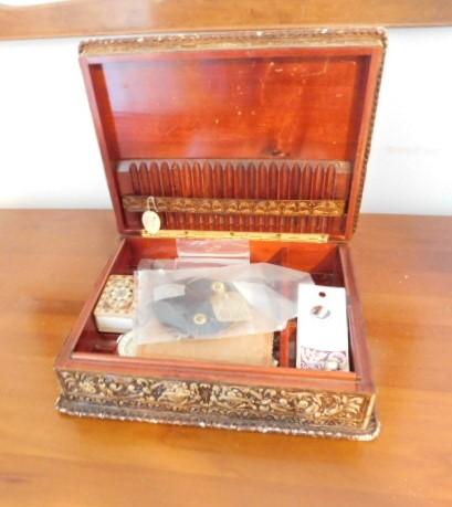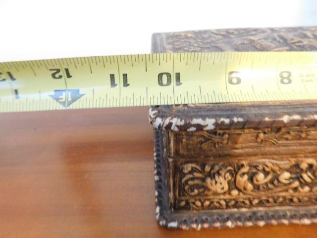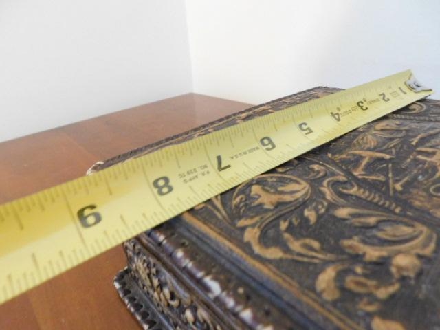 Vintage Leather Bound Mahogany Wood Storage Box Iron Smith and Anvil Theme