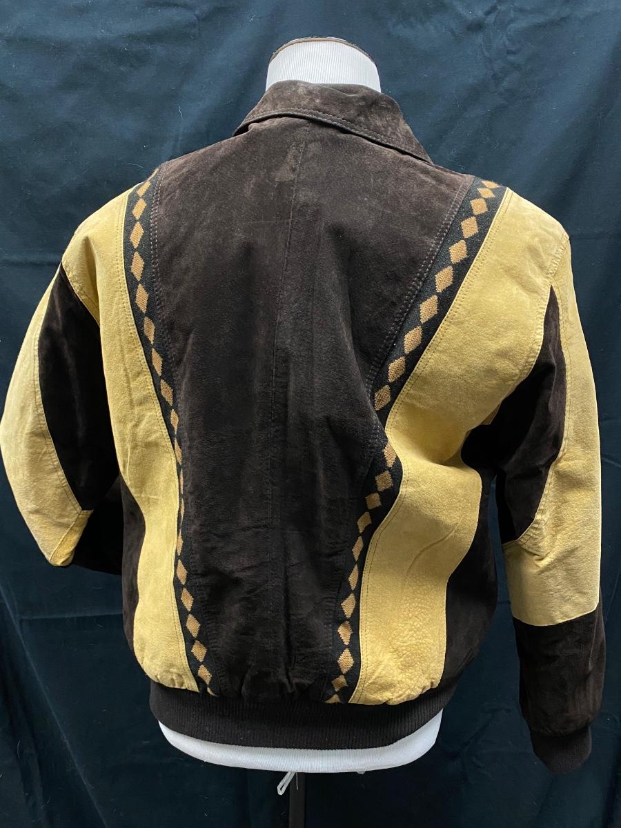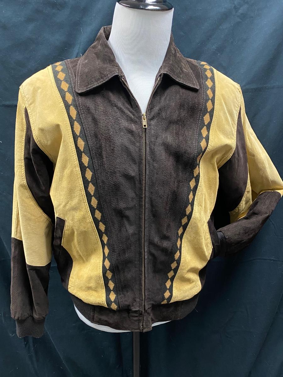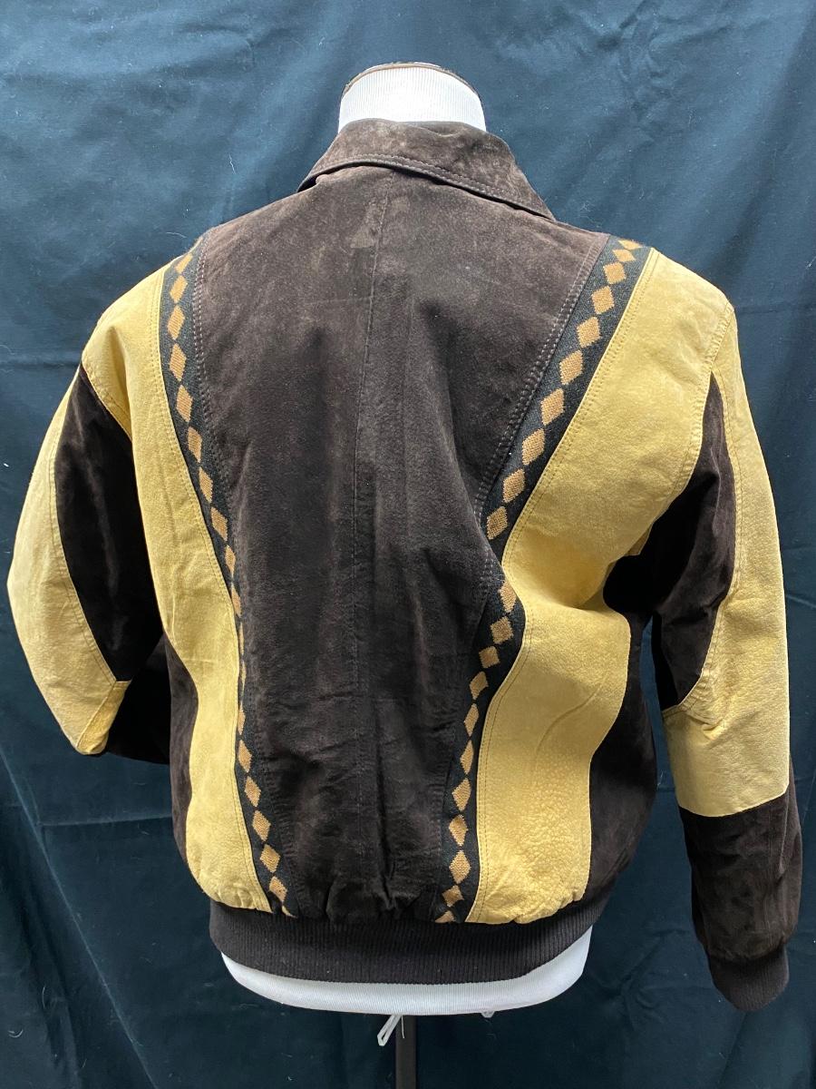Two tone leather bomber jacket from Vintage Leather. Size small. In good previously owned condition. May be a little dusty from being in a closet.
