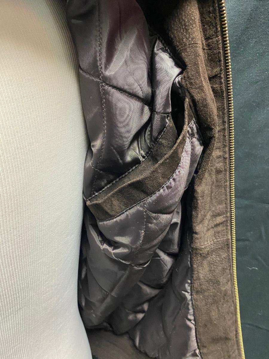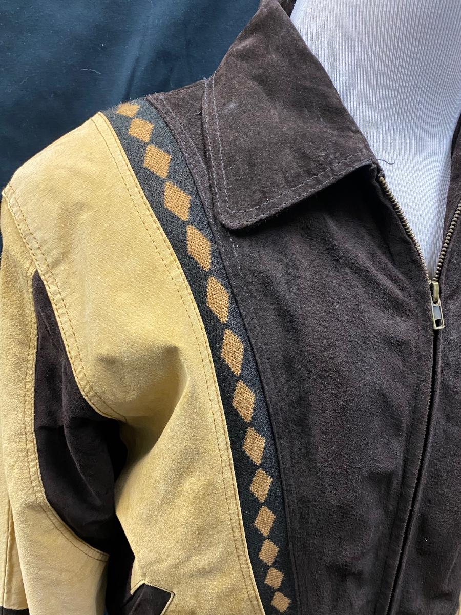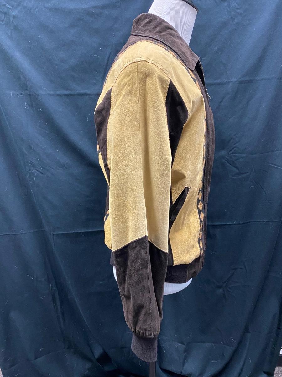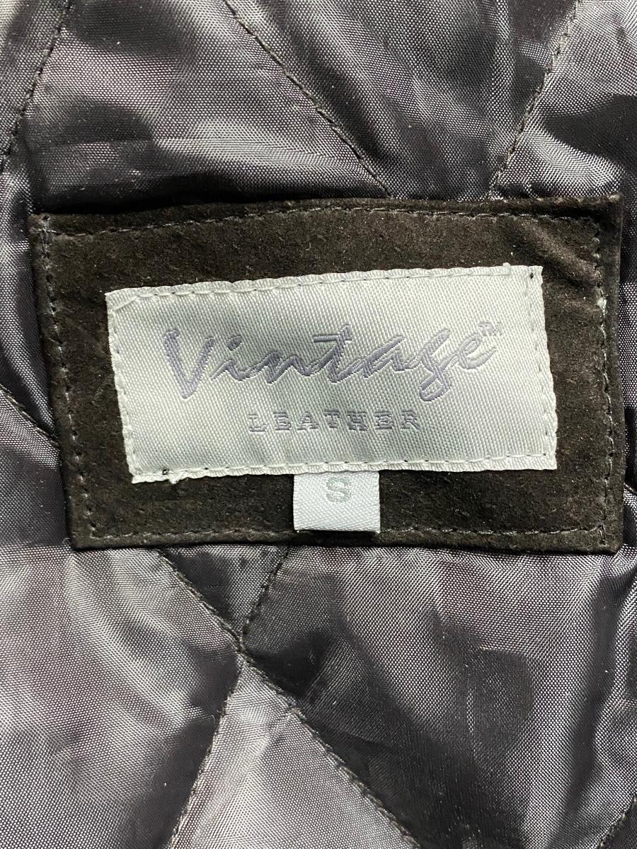 Two tone leather bomber jacket from Vintage Leather. Size small. In good previously owned condition. May be a little dusty from being in a closet.