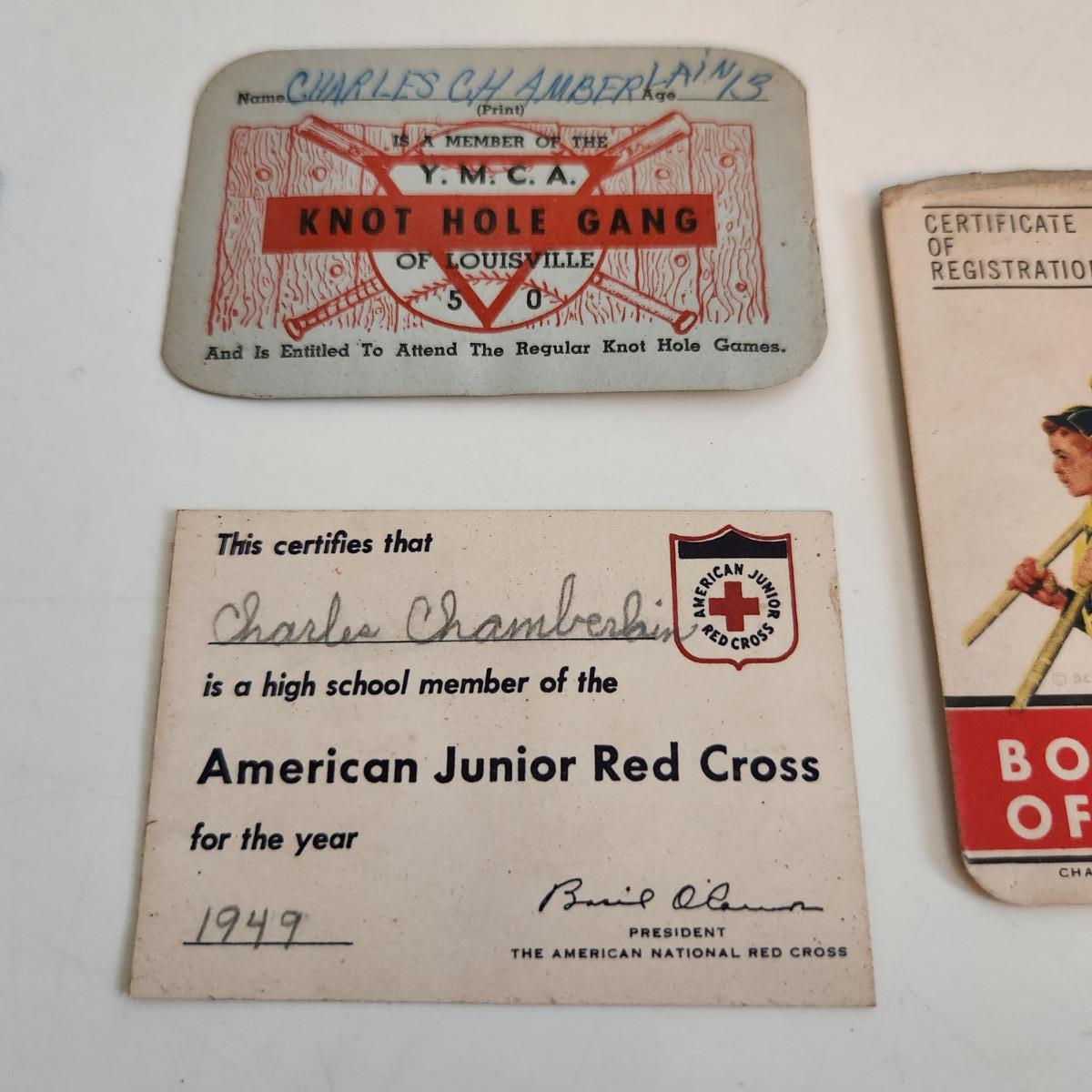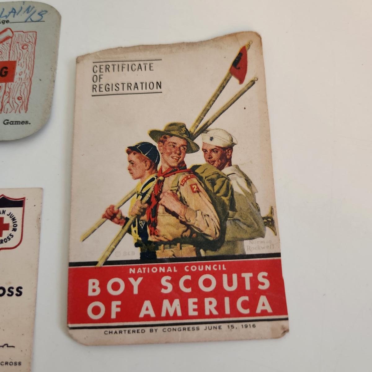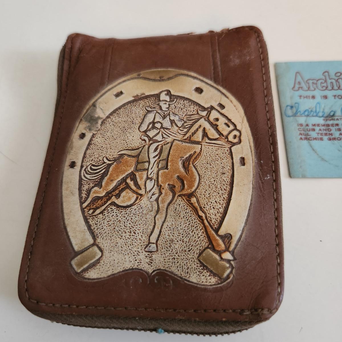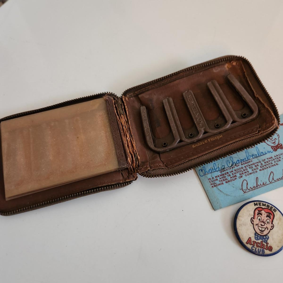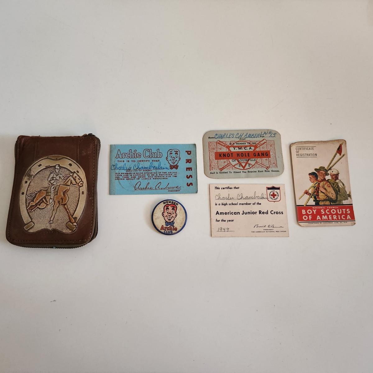 This auction lot is for a Vintage Leather Child's Wallet with Contents. The wallet itself is quite the find but the contents are also interesting. There is an Archie's Club Membership Card with an Archie's Pin, a Boy Scout card, a Knot Hole Gang Card from the YMCA and another from the Red Cross. A real look at a moment in time.